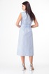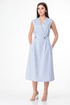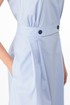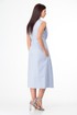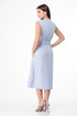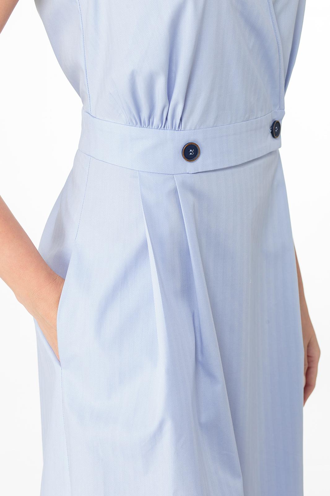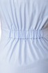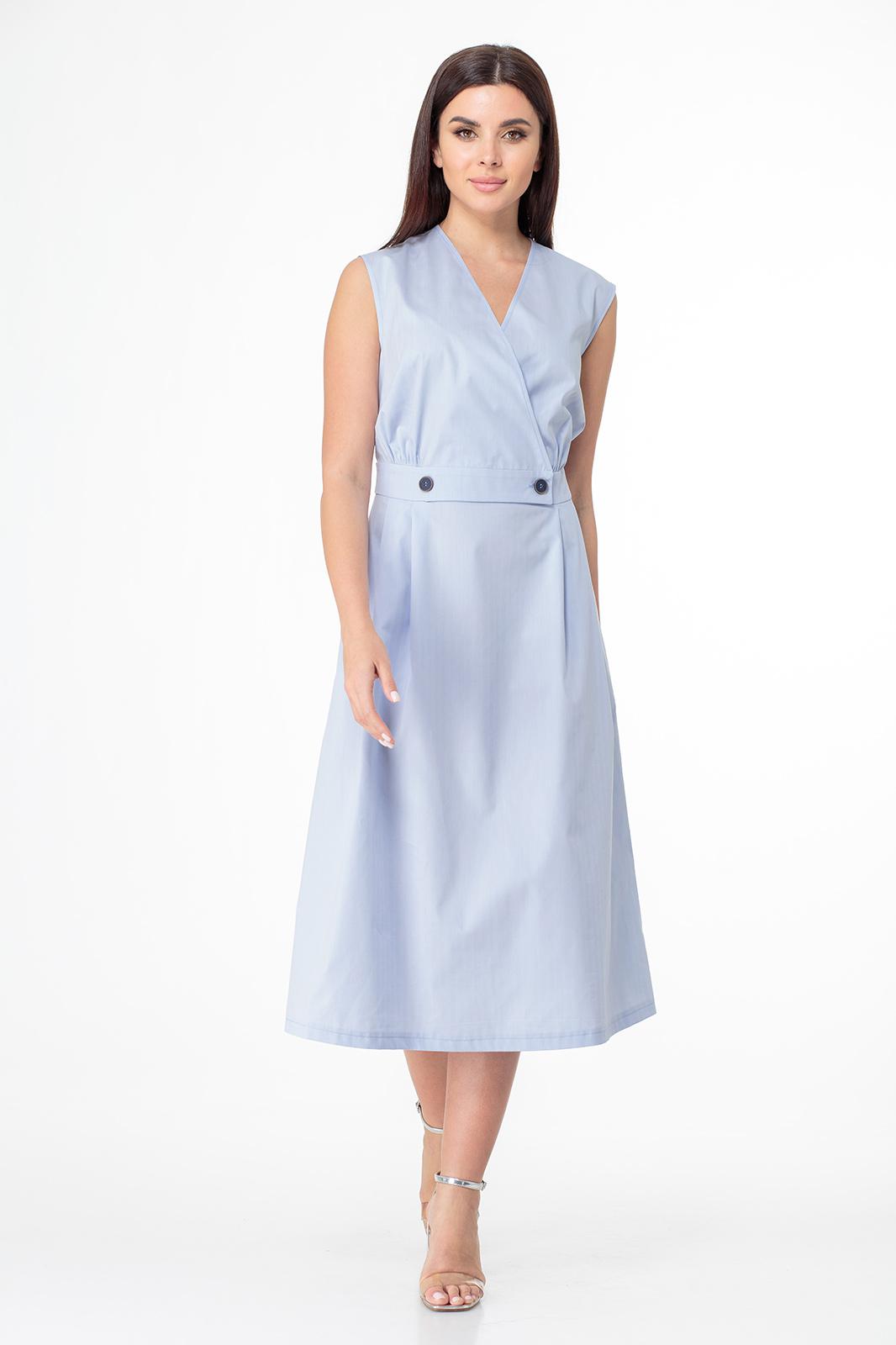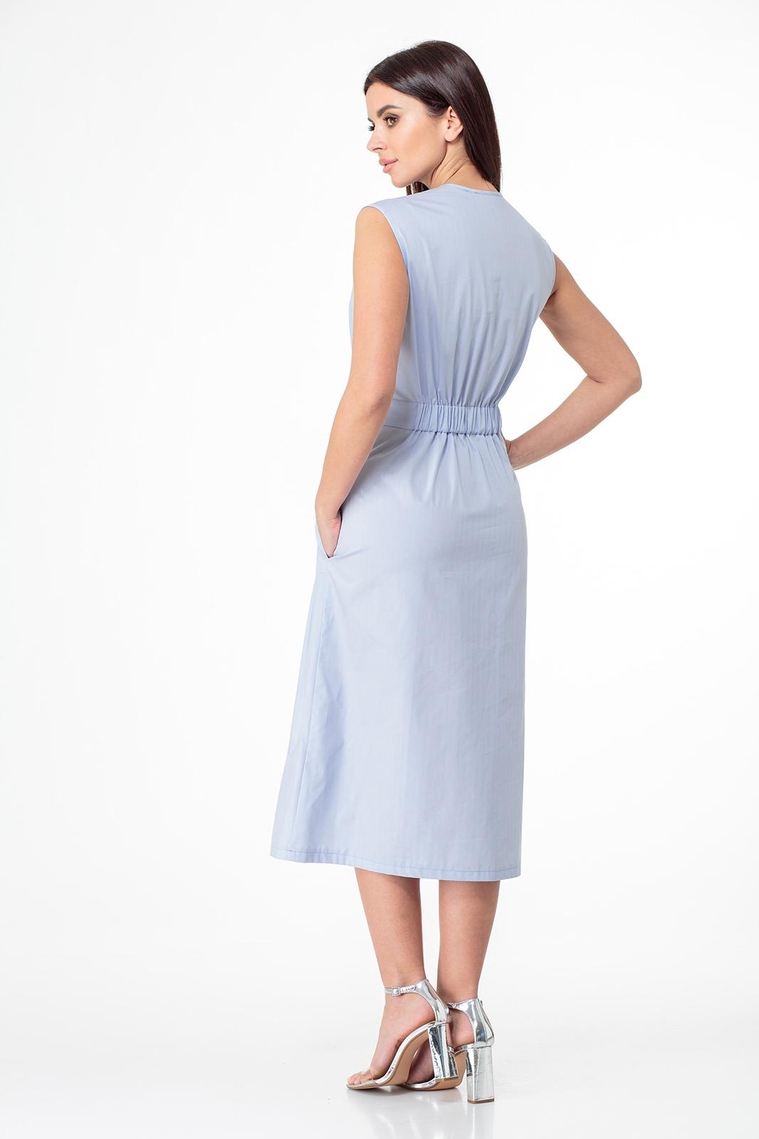 Отрезное по линии талии, лиф с запахом. Нижняя часть платья со складками по переду, расширена к низу. Притачная деталь в области талии по переду имитирует пояс с застежкой на запах. Спинка прямая, расширена книзу, присборена эластичной лентой в области талии. В боковых швах расположены карманы.