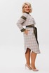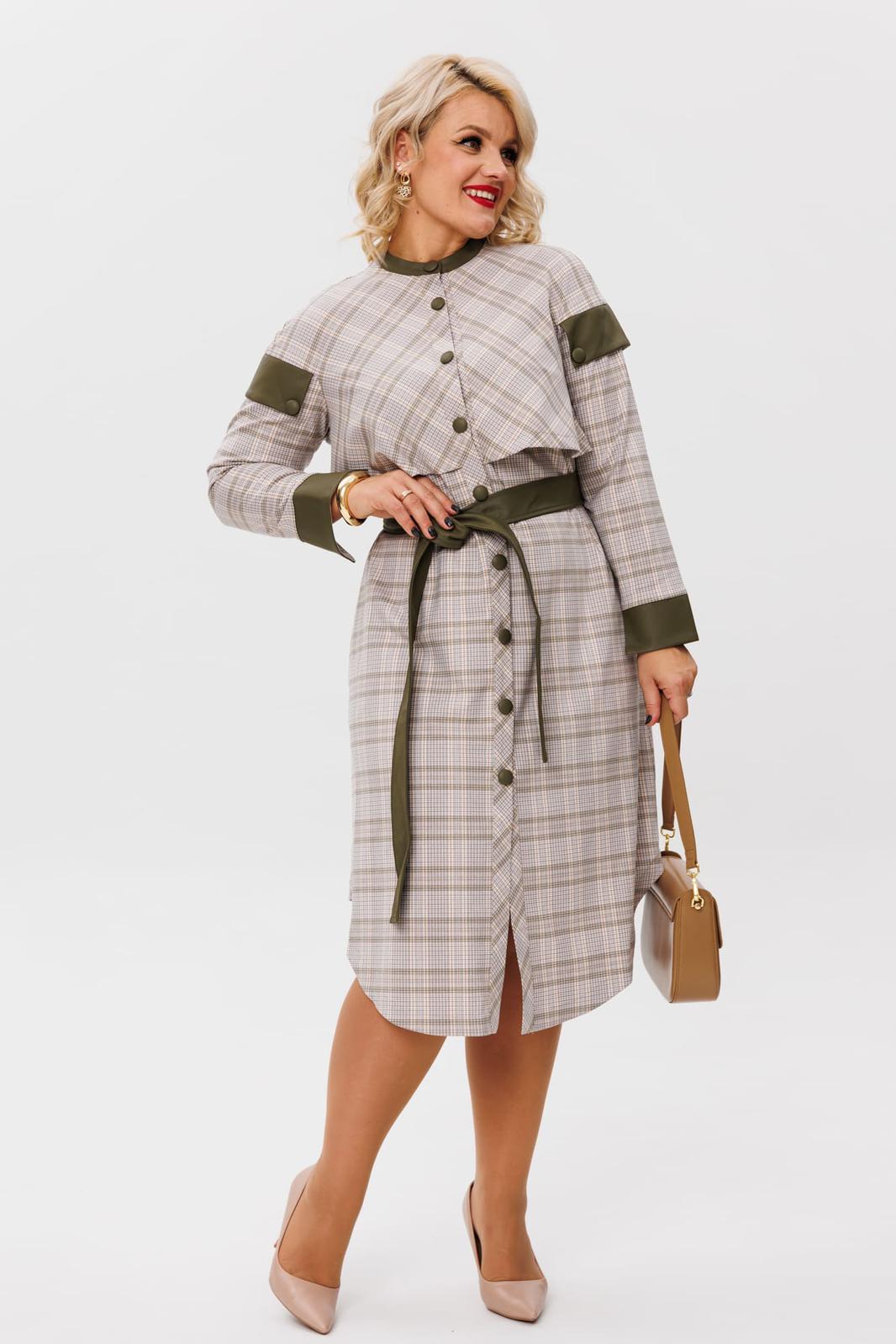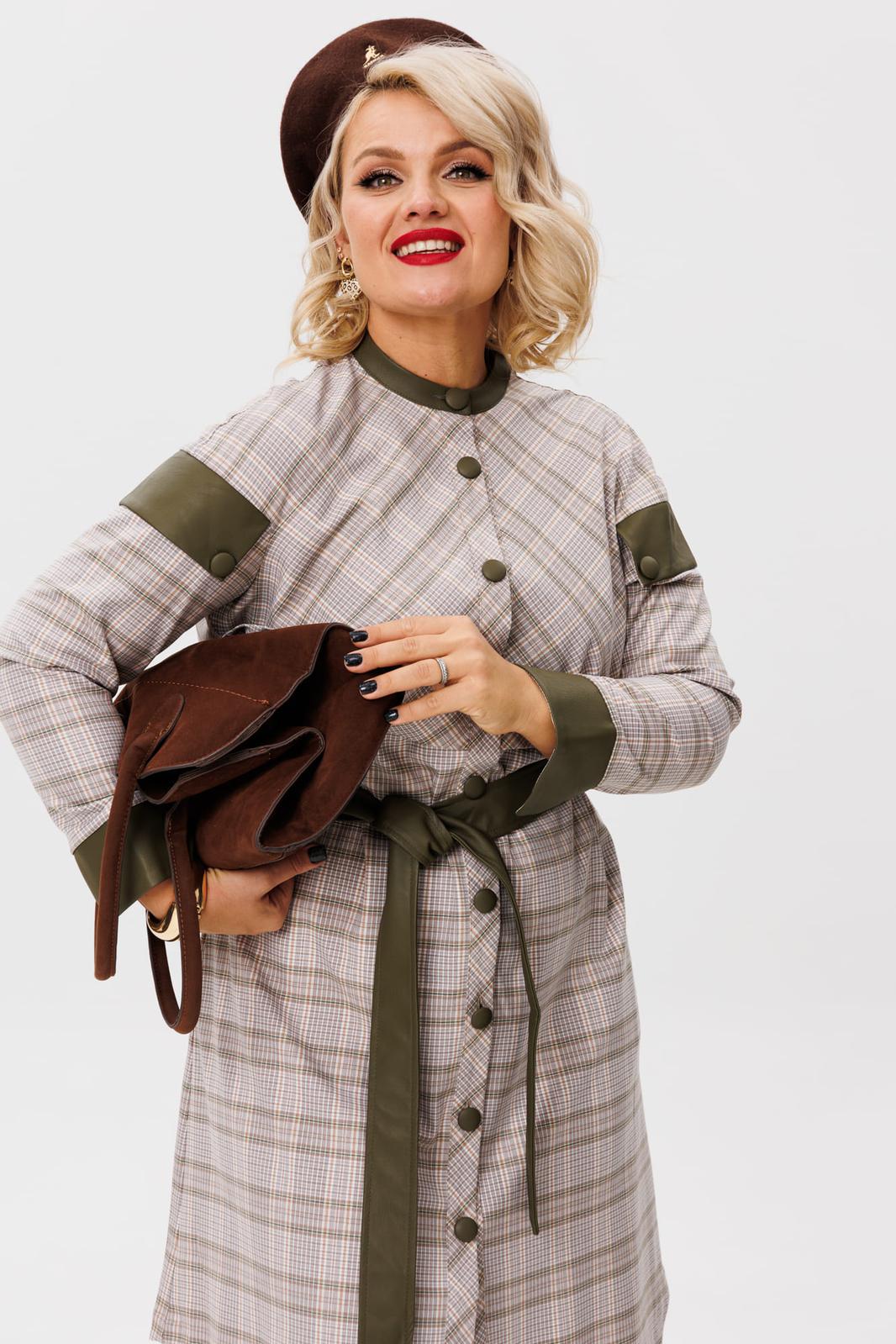 Платье оснащено характерными деталями из эко кожи на рукавах, что придает ему современный и дерзкий вид. Воротник-стойка и кокетки по переду и спинке добавляют нотку строгости и утонченности. Функциональные карманы в боковых швах обеспечивают практичность, а съемный пояс из эко кожи позволяет акцентировать талию и создавать различные образы.