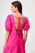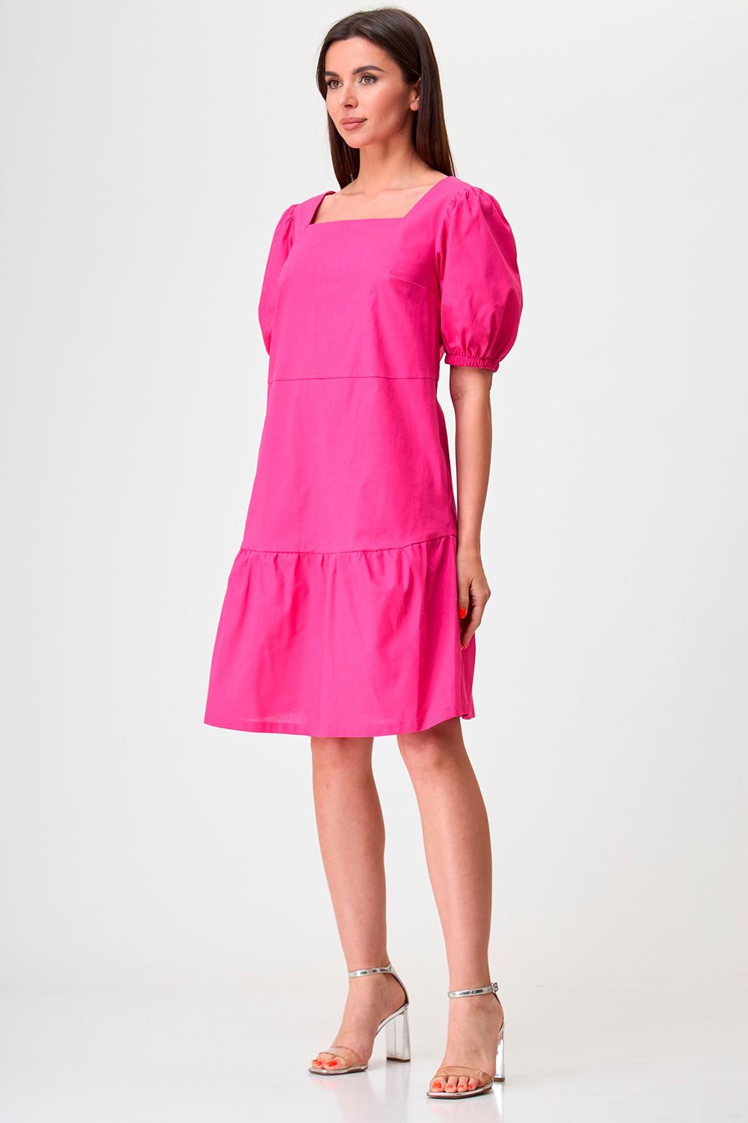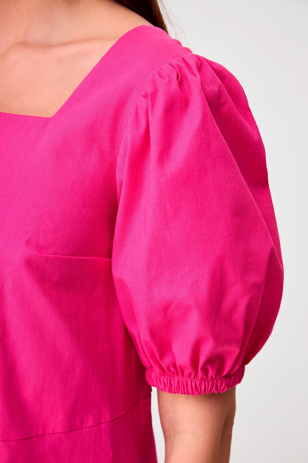 Платье женское силуэт трапеция, длина до середины колена. По переду квадратный вырез горловины, актуальный ближайшие несколько сезонов. По низу платья волан на сборке. Спинка с глубоким вырезом и функциональными лентами, для фиксации. Рукав 3/4, со сборкой по окату и низ на резинке. Сочное, дерзко и в тоже время стильное и игривое.