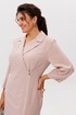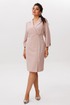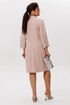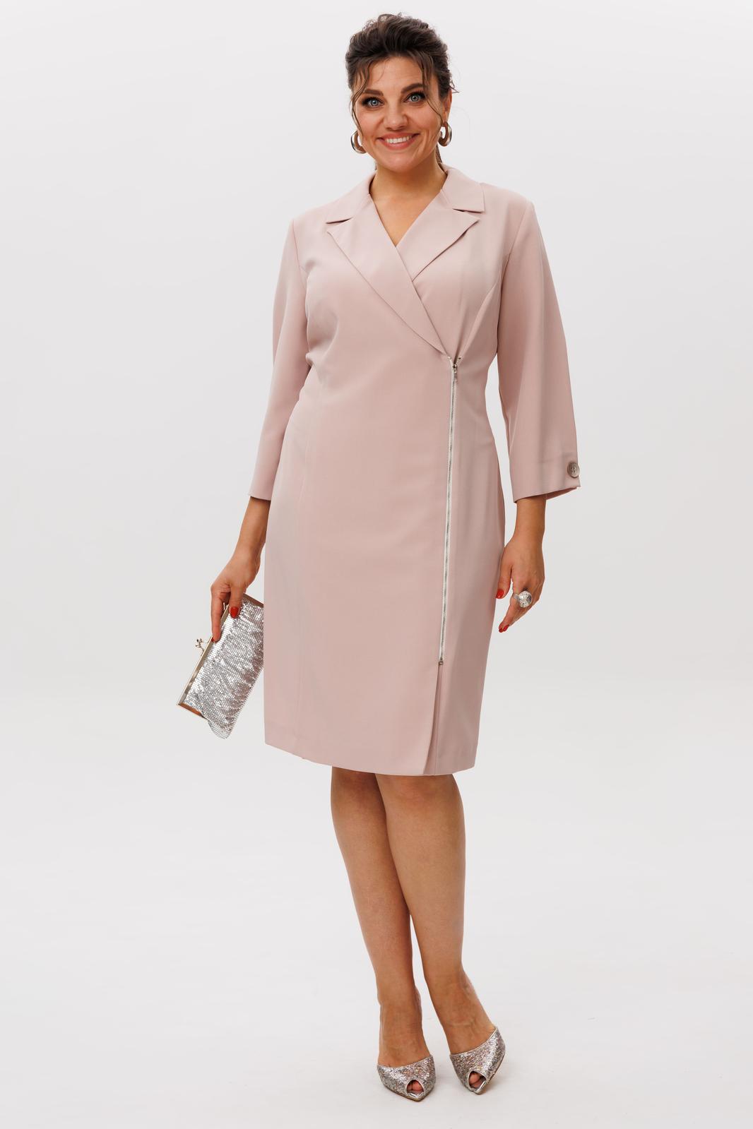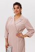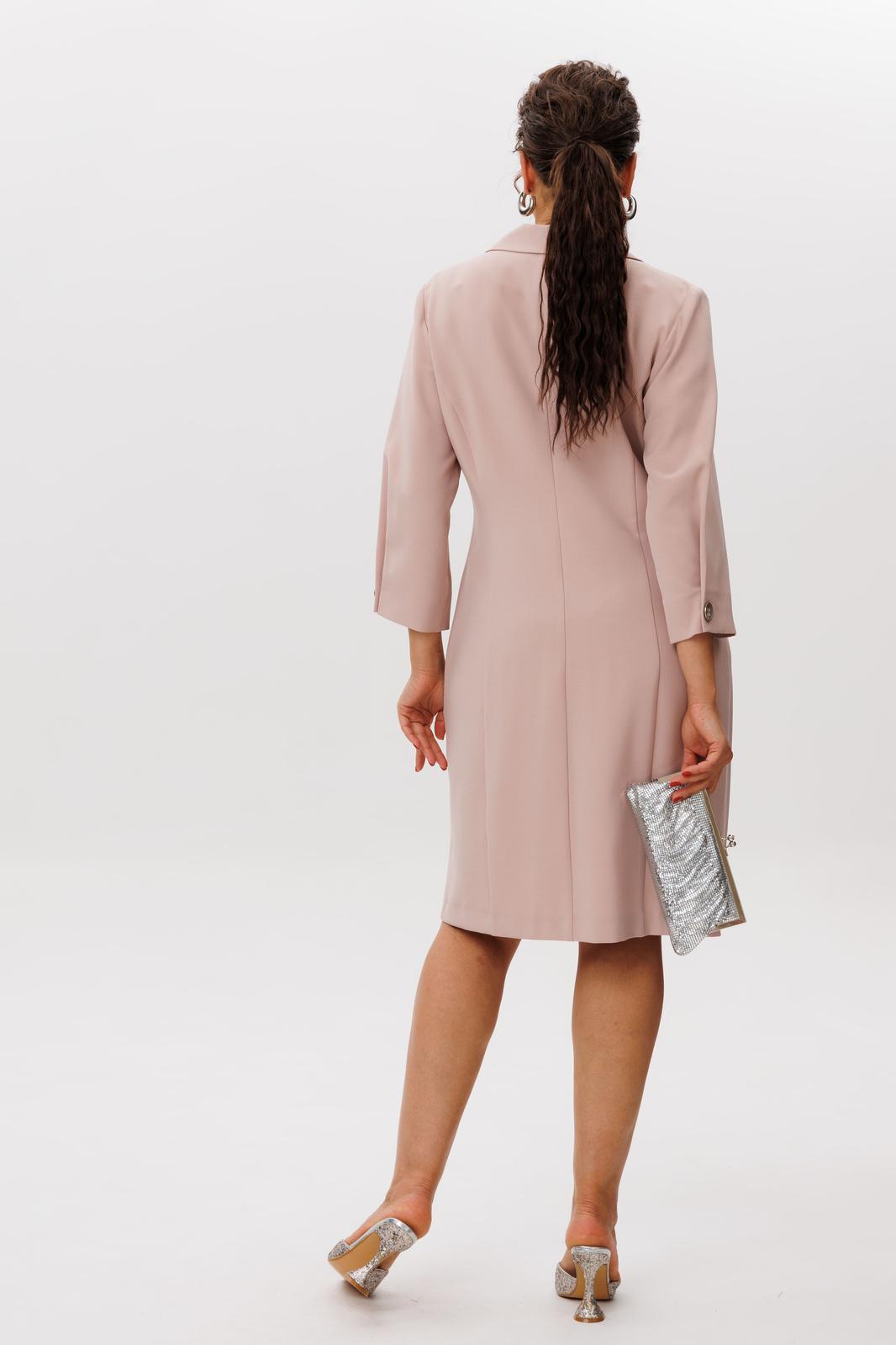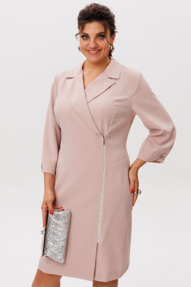 Вертикальные рельефы, идущие от проймы по переду и спинке, подчёркивают изящные линии фигуры, придавая платью лаконичную выразительность. Двубортная застёжка с отложными лацканами и воротником добавляет благородную строгость, а асимметричная молния вносит современную деталь, делая образ динамичным. Рукава длиной три четверти со складкой по низу дополняют силуэт лёгкой воздушностью.
