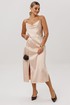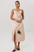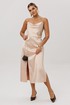 Платье актуальной во все времена длины миди с игривым разрезом изящно струится во время движения, приковывая взгляды. В правом боковом шве спрятана потайная молния. Вырез платья-качели нежно ниспадает, подчеркивая декольте и делая образ соблазнительным.