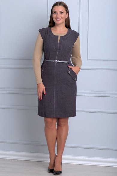 Платье прямого силуэта,по переду центральный шов,рельефы,переходящие в бочок,в рельефах рабочие карманы с притачным клапаном;вырез горловины круглый с разрезом,которые обработаны притачными деталями. Пройма с притачной фигурной деталью. Спинка со средним швом и талевыми вытачками. В области талии по боковым частям переда и спинки притачная кулиска для съемного ремня. Модель с и подчёркивающими фигуру кроем.
