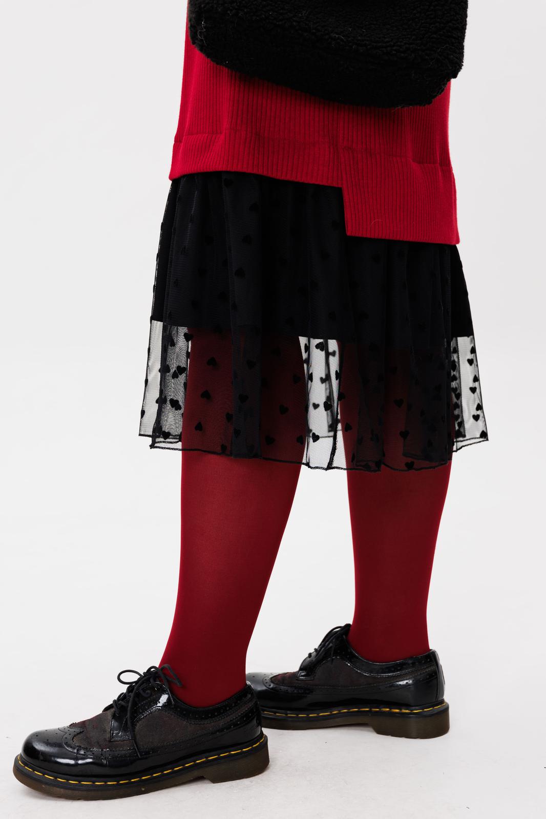 Сетчатая вставка по низу платья с рисунком в виде сердец добавляет игривости и романтизма.