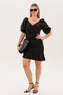 Приталенный силуэт мягко подчеркивает линии фигуры, открытые плечи добавляют образу утончённости, а воздушные рукава-фонарики придают легкость и романтичное настроение. Пикантное декольте деликатно акцентирует внимание, создавая баланс между элегантностью и кокетством. Глубокий чёрный цвет выглядит благородно и выразительно, а длина миди делает образ изысканным и универсальным для вечернего выхода, особого события или долгожданного свидания. Потайная молния в боковом шве сохраняет чистоту линий и обеспечивает комфорт, позволяя платью красиво садиться по фигуре и дарить ощущение уверенности в каждом движении.