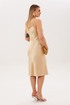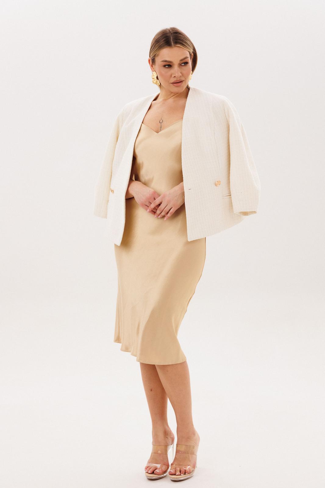 Легкая ткань в цвете «медовый нектар» мягко скользит по силуэту и деликатно переливается благородным сиянием с золотым оттенком, создавая ощущение утончённой роскоши и спокойной уверенности.
