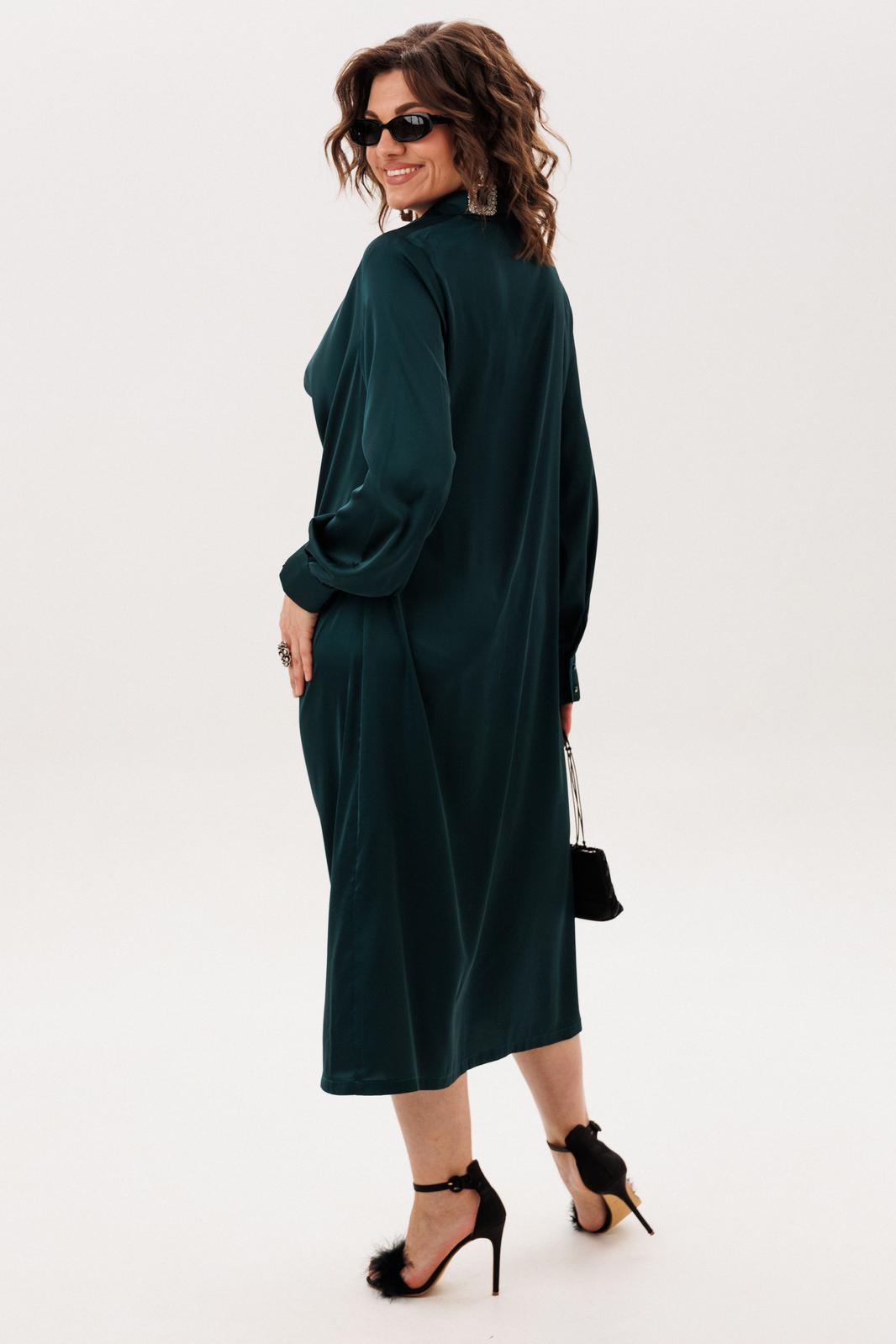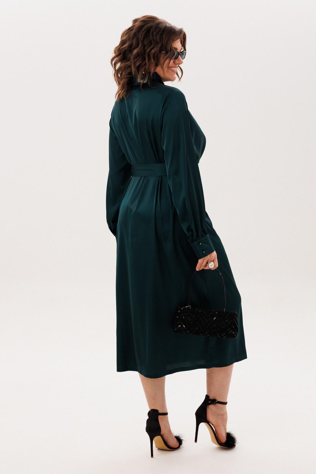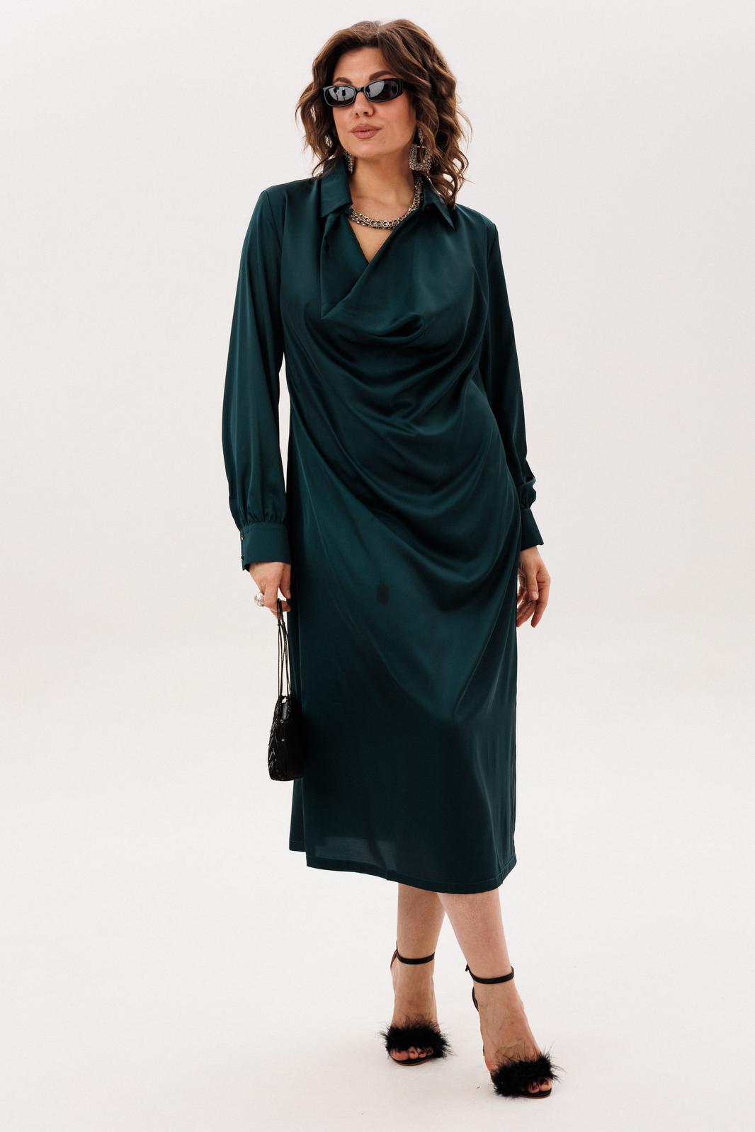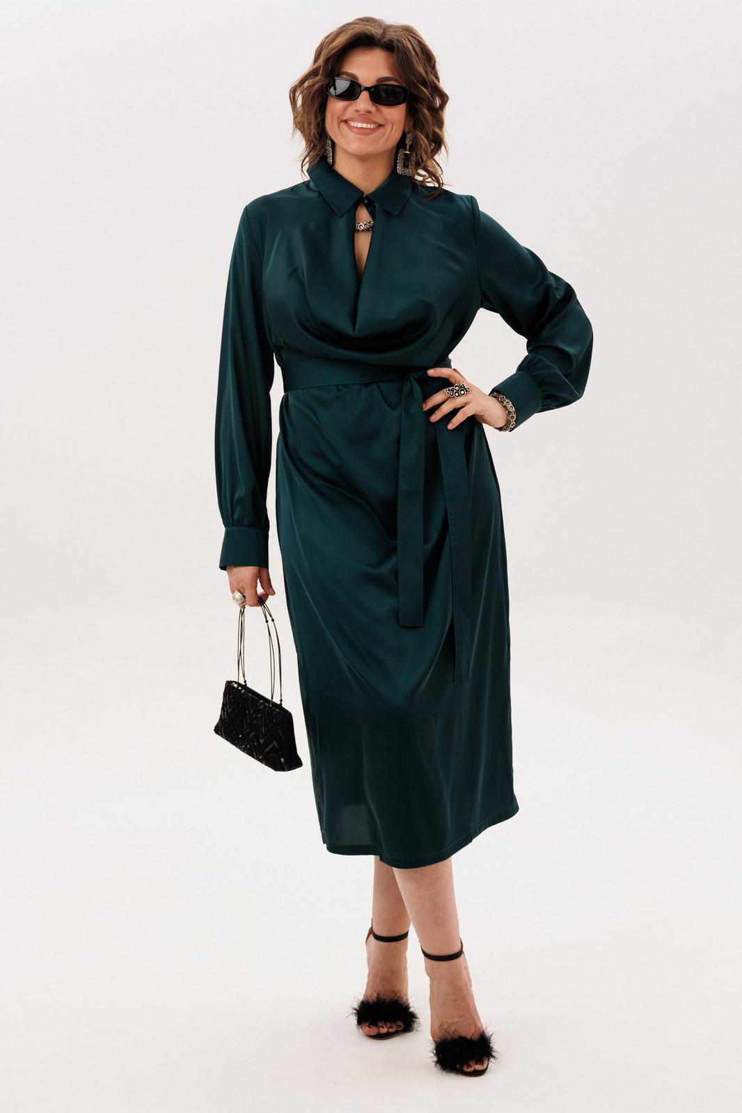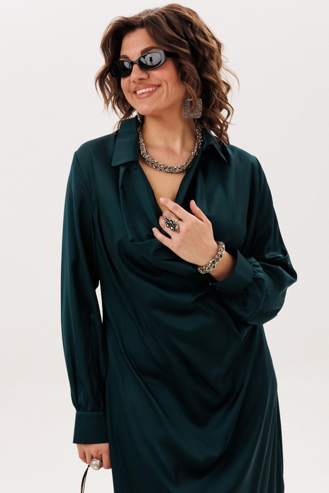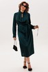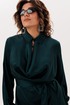 Платье от Анелли из струящегося армани шелка в цвете «глубоководный зеленый» обретает благородную мягкость в полуприлегающем силуэте, который чутко следует за линией тела.