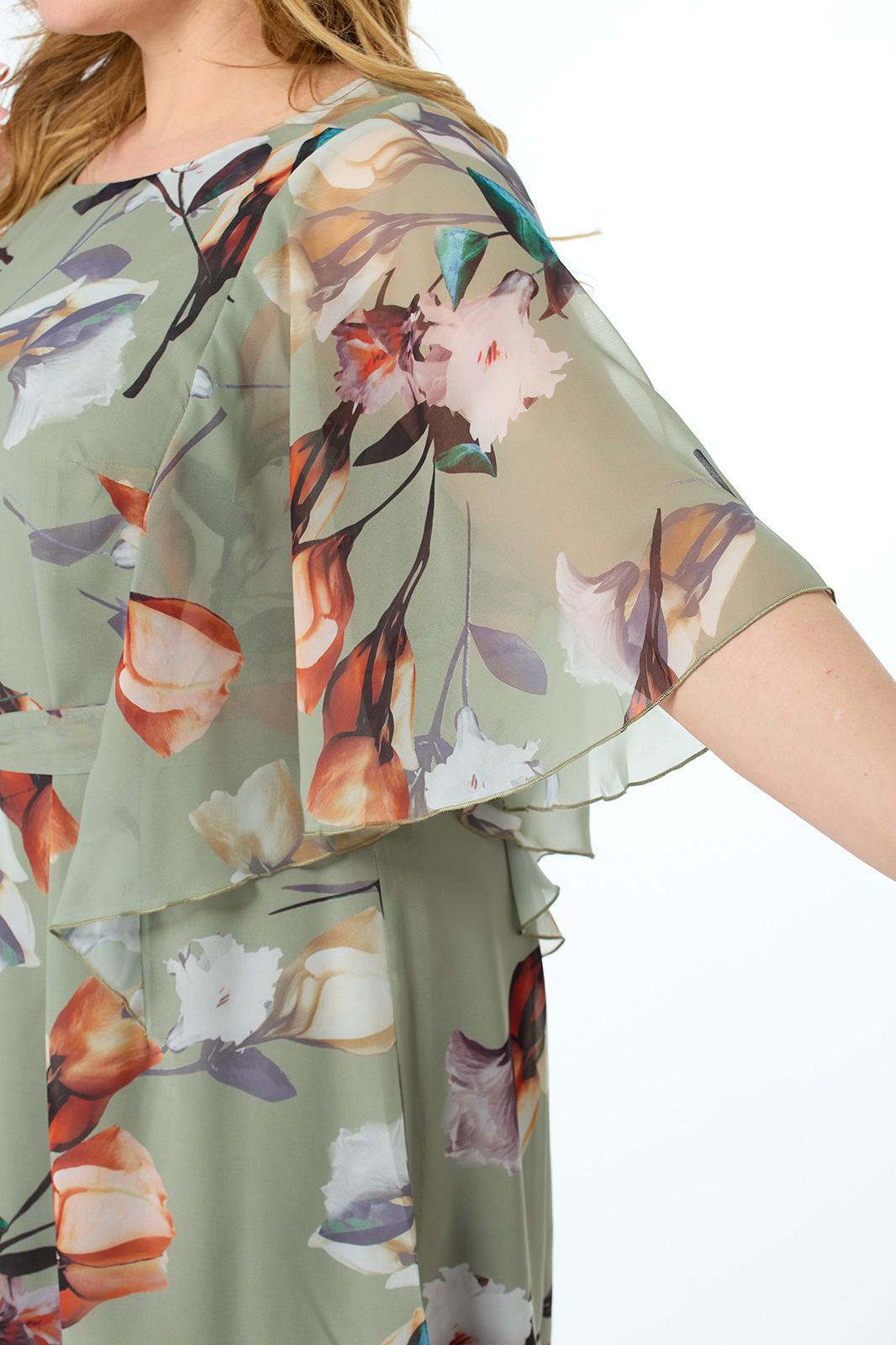 Особенность этого нарядного платья – рукав-пелерина, вшитый в рельефы переда и спинки, который широко использовал в своих коллекциях Пьер Карден. Завершает образ подчёркивающий фигуру завязывающийся пояс выше линии талии.