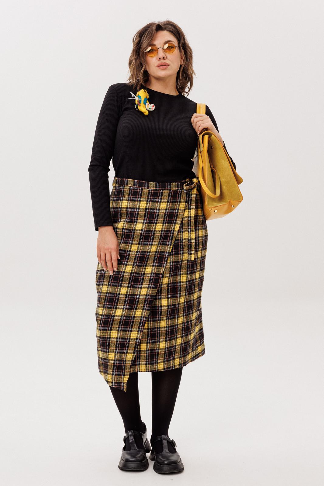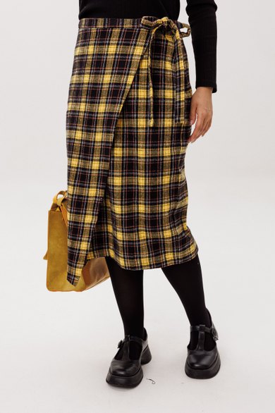 Теплая юбка на запах миди-длины — идеальный атрибут для прохладной погоды. Асимметричный край разбавляет строгость образа игривостью и придает ему смелости.