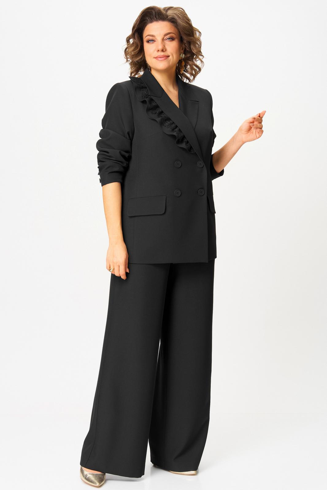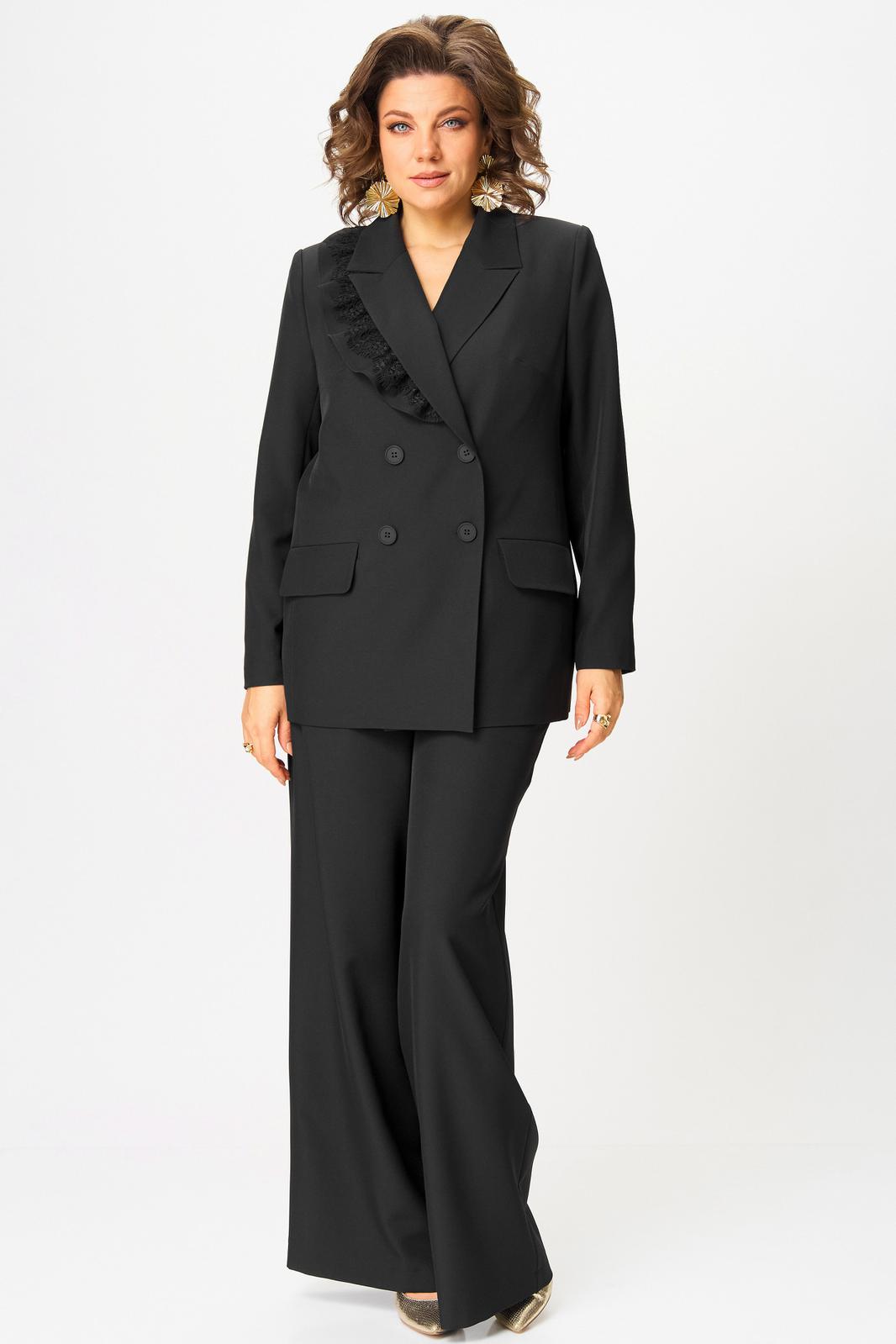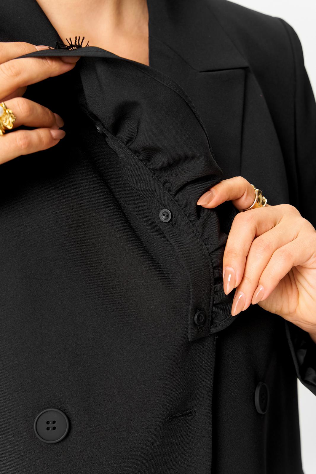 Жакет прямого силуэта, на подкладке. По переду - центральная двубортная застежка на петли и пуговицы, нагрудные вытачки и функциональные прорезные карманы с клапаном. Полочку жакета украшает съемная (на пуговицах) декоративная рюша с кружевом. Спинка со средним швом. Рукав втачной длинный двухшовный, с имитацией шлицы, декорированной пуговицами.