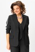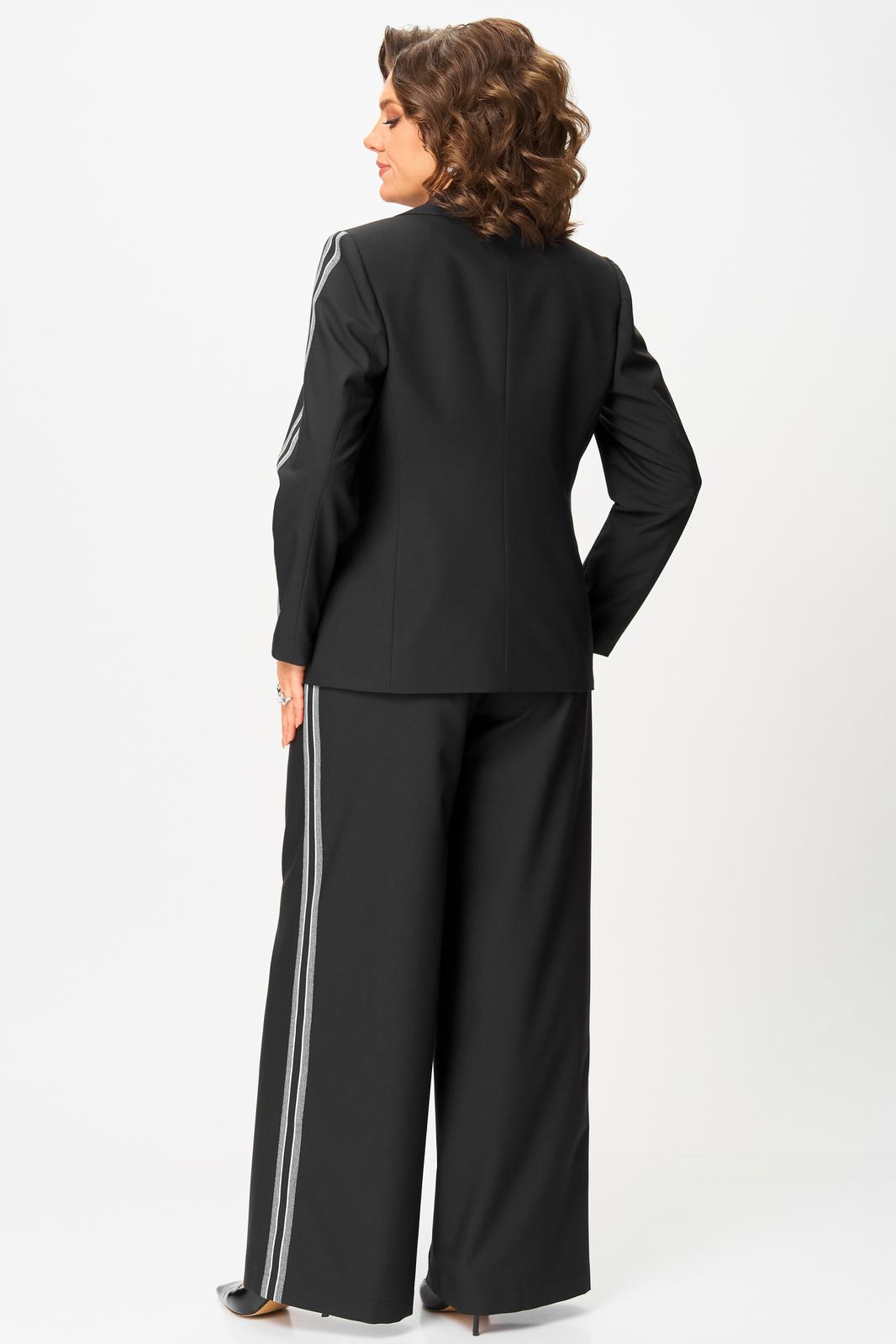 Однобортный жакет полуприталенного силуэта, на подкладке, с плечевыми накладками. Воротник пиджачного типа с отложными лацканами. По переду центральная застежка на петли и пуговицы и прорезные карманы с клапаном, талиевые вытачки и рельефы. Низ бортов закругленной формы. Спинка со средним швом и рельефами. Рукав втачной двухшовный длинный, декорирован лампасом.