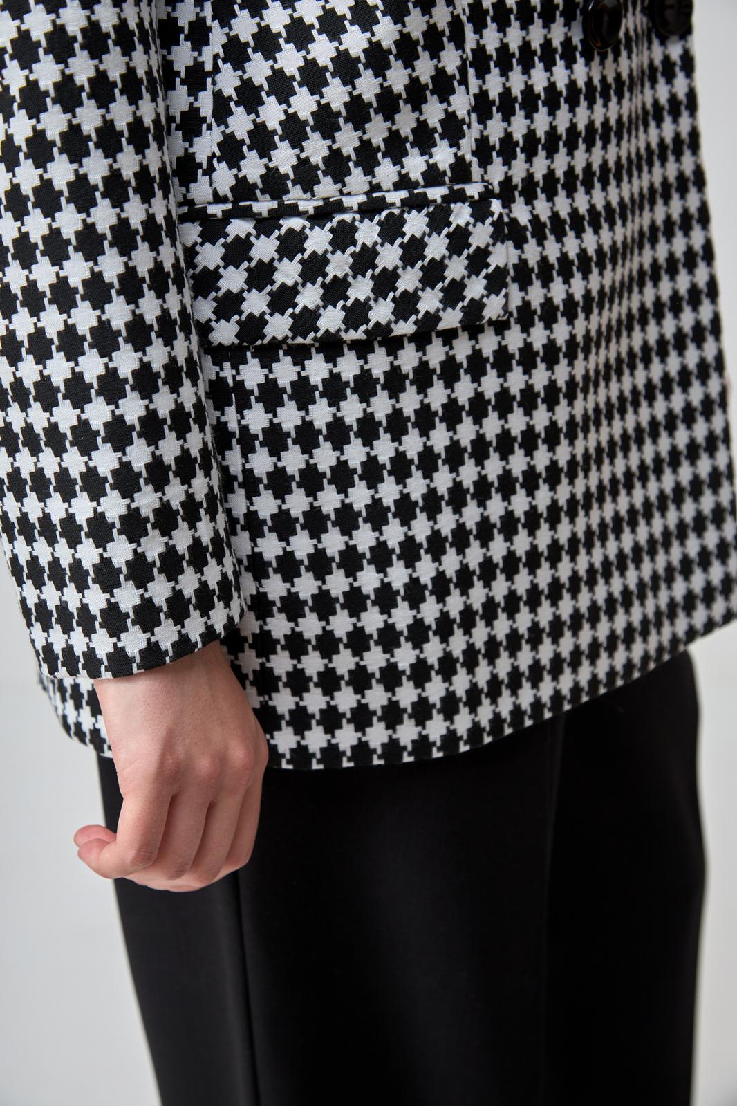 Эффектный удлиненный жакет с принтом гусиная лапка - незаменимая вещь в гардеробе любительниц стиля casual. Такой жакет подчеркнет элегантность и женственность своей обладательницы, идеален для повседневной носки и отлично дополнит вечерний наряд.