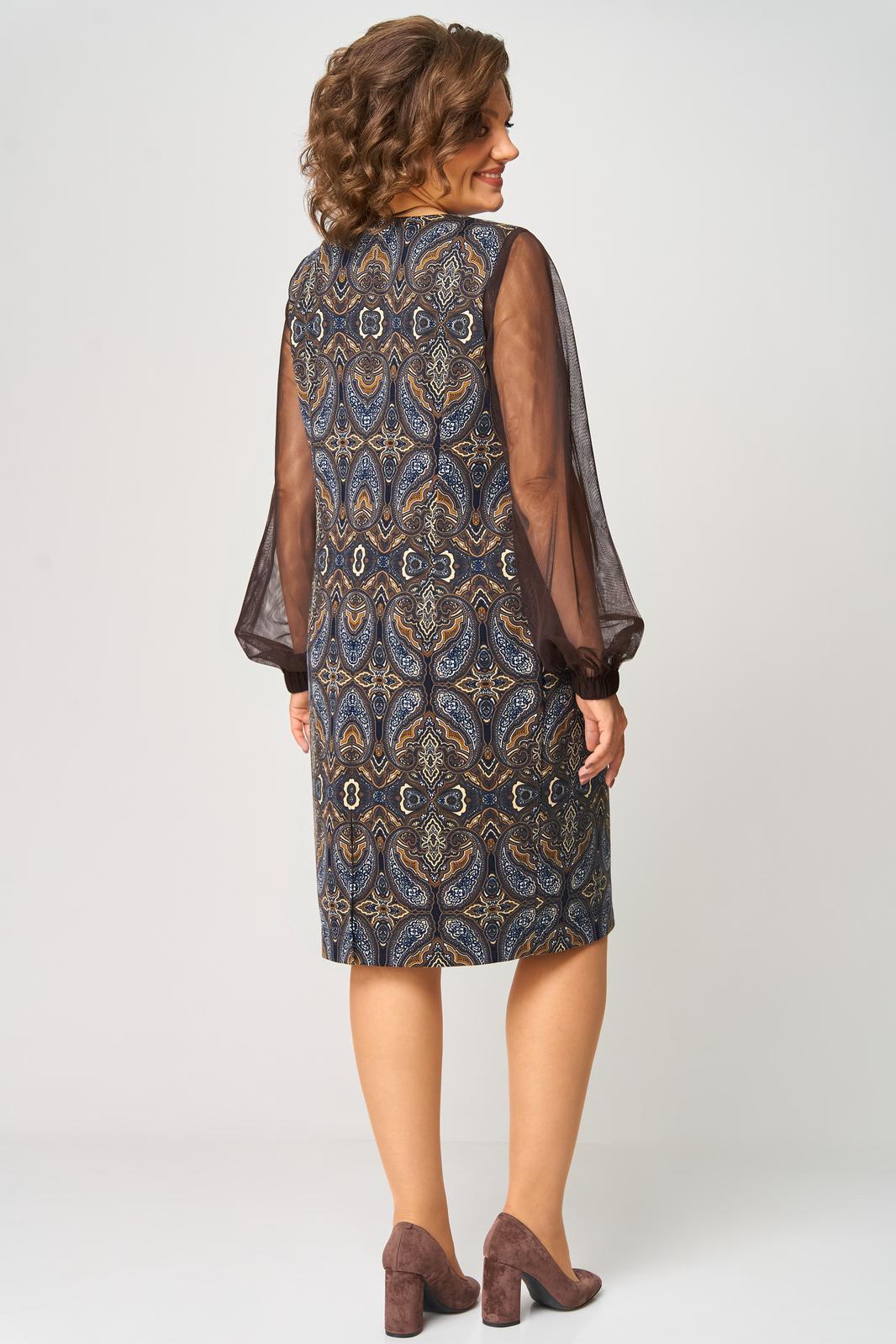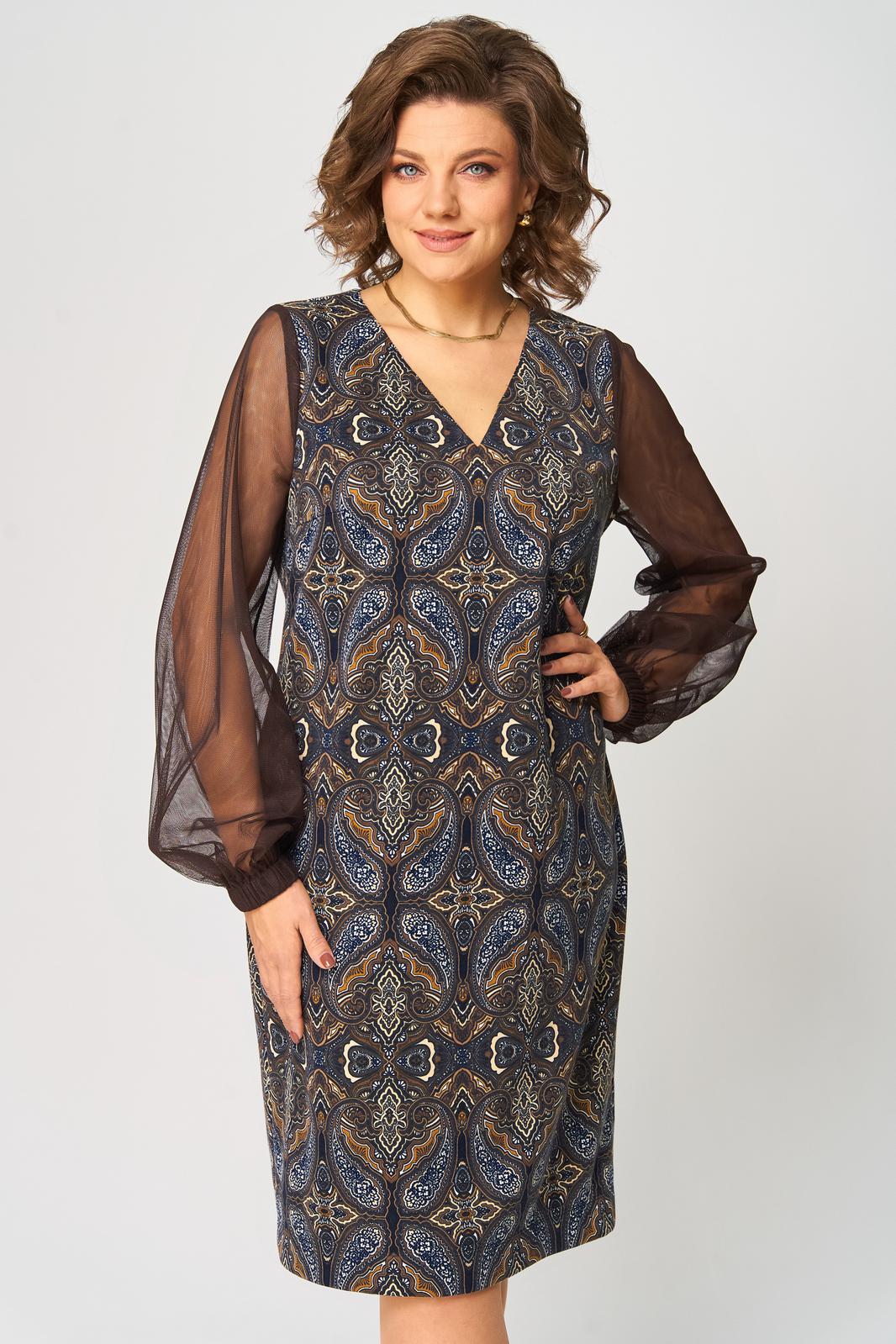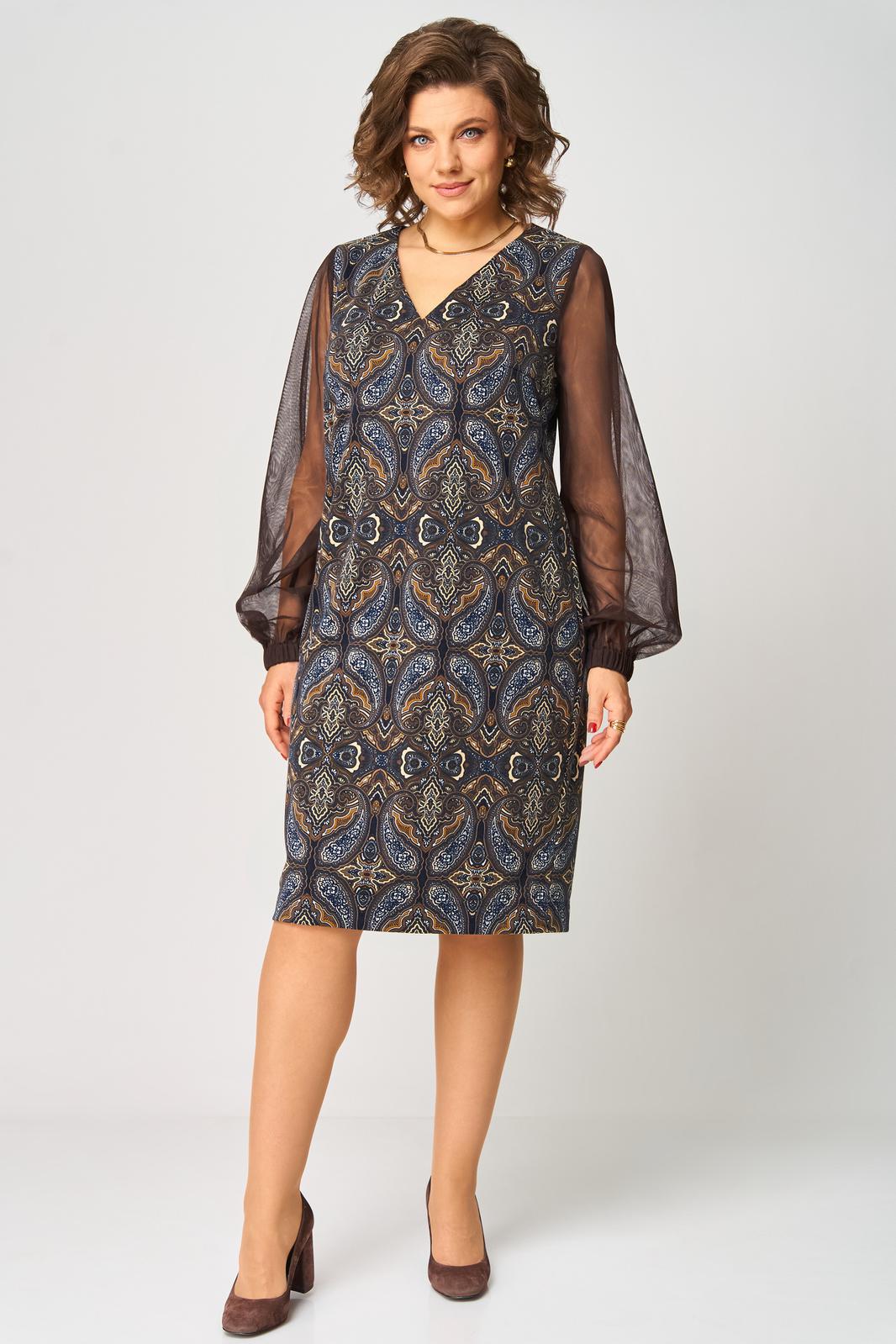 Платье полуприлегающего силуэта с горловиной V-образной формы. Перед с нагрудными вытачками. Спинка с талиевыми вытачками и разрезом в среднем шве. Рукав прозрачный из сетки, втачной прямой длинный, на резинке по низу.