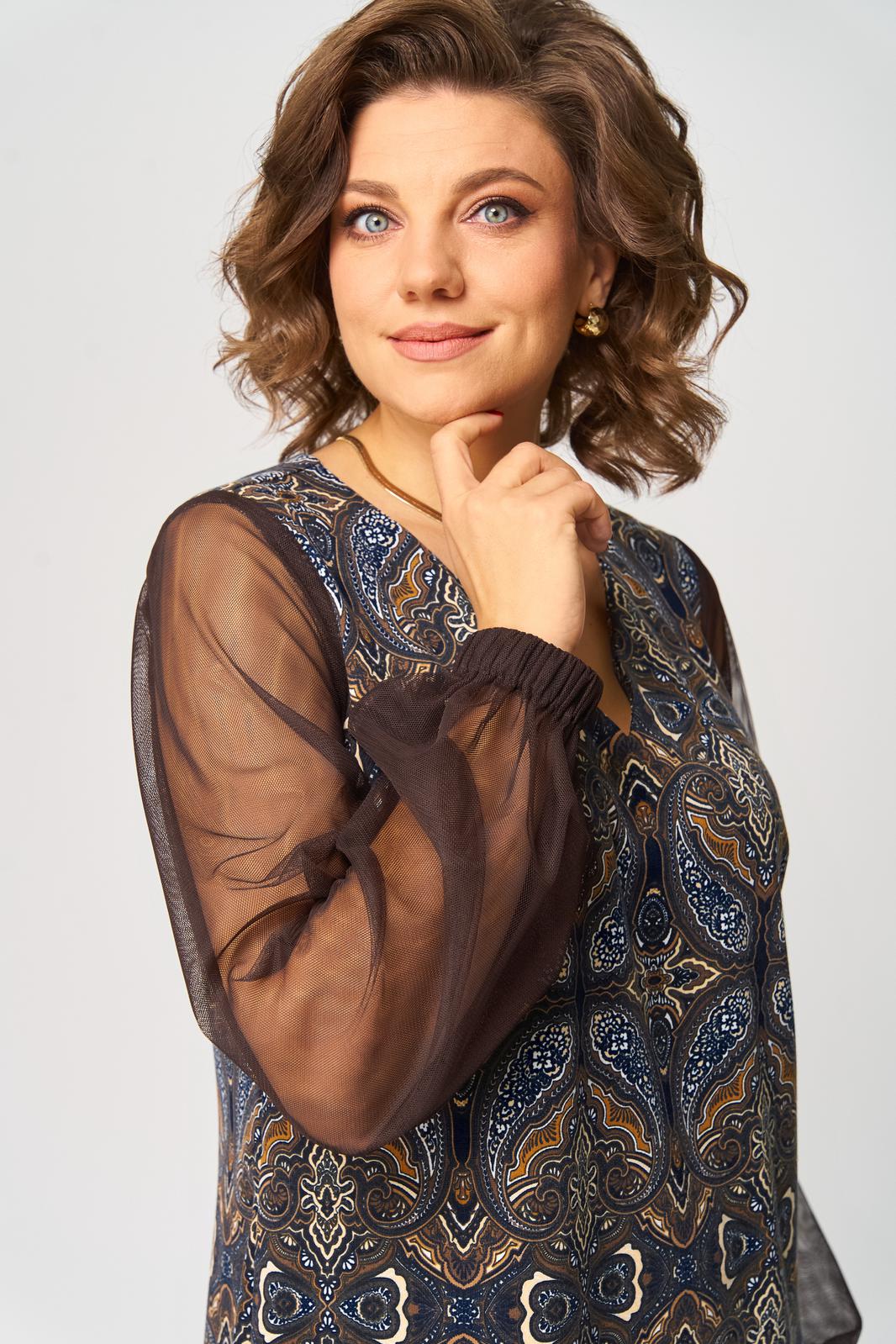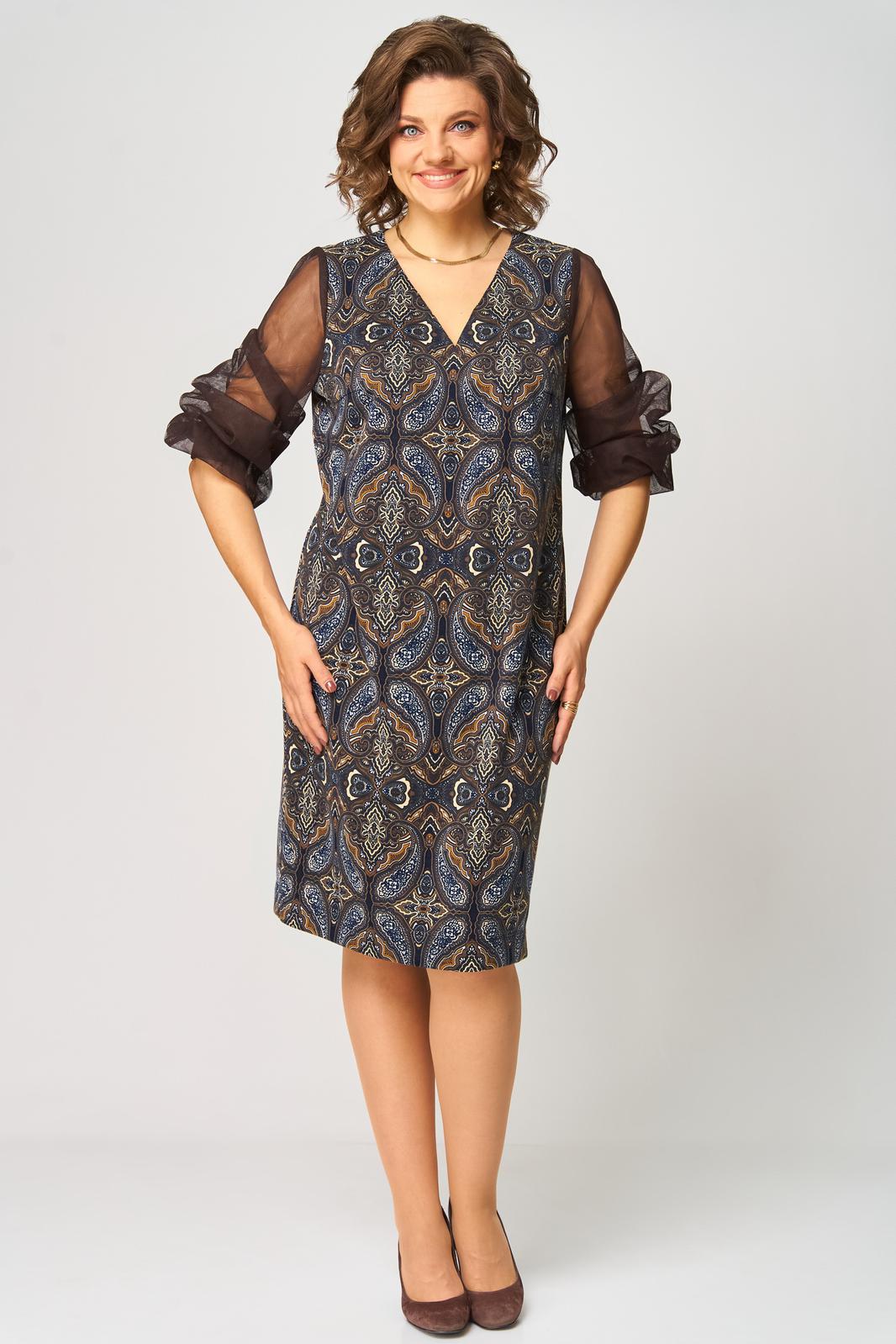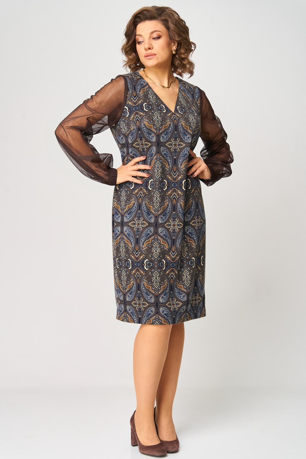 Платье полуприлегающего силуэта с горловиной V-образной формы. Перед с нагрудными вытачками. Спинка с талиевыми вытачками и разрезом в среднем шве. Рукав прозрачный из сетки, втачной прямой длинный, на резинке по низу.