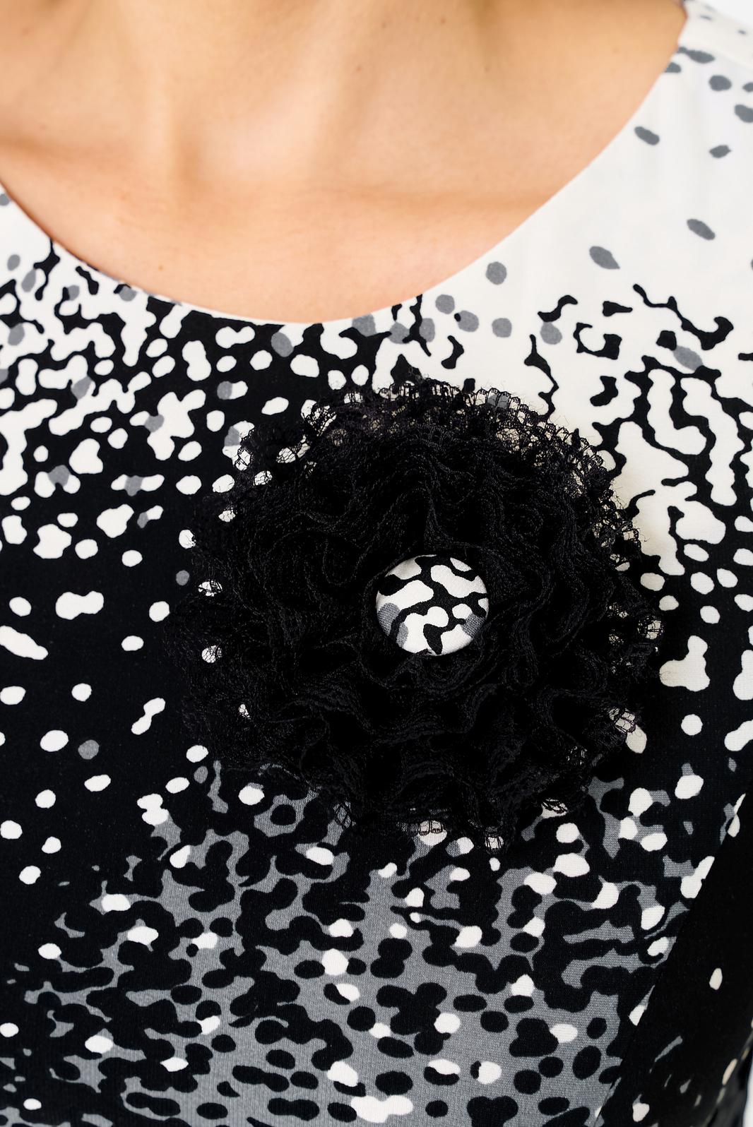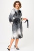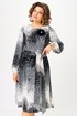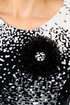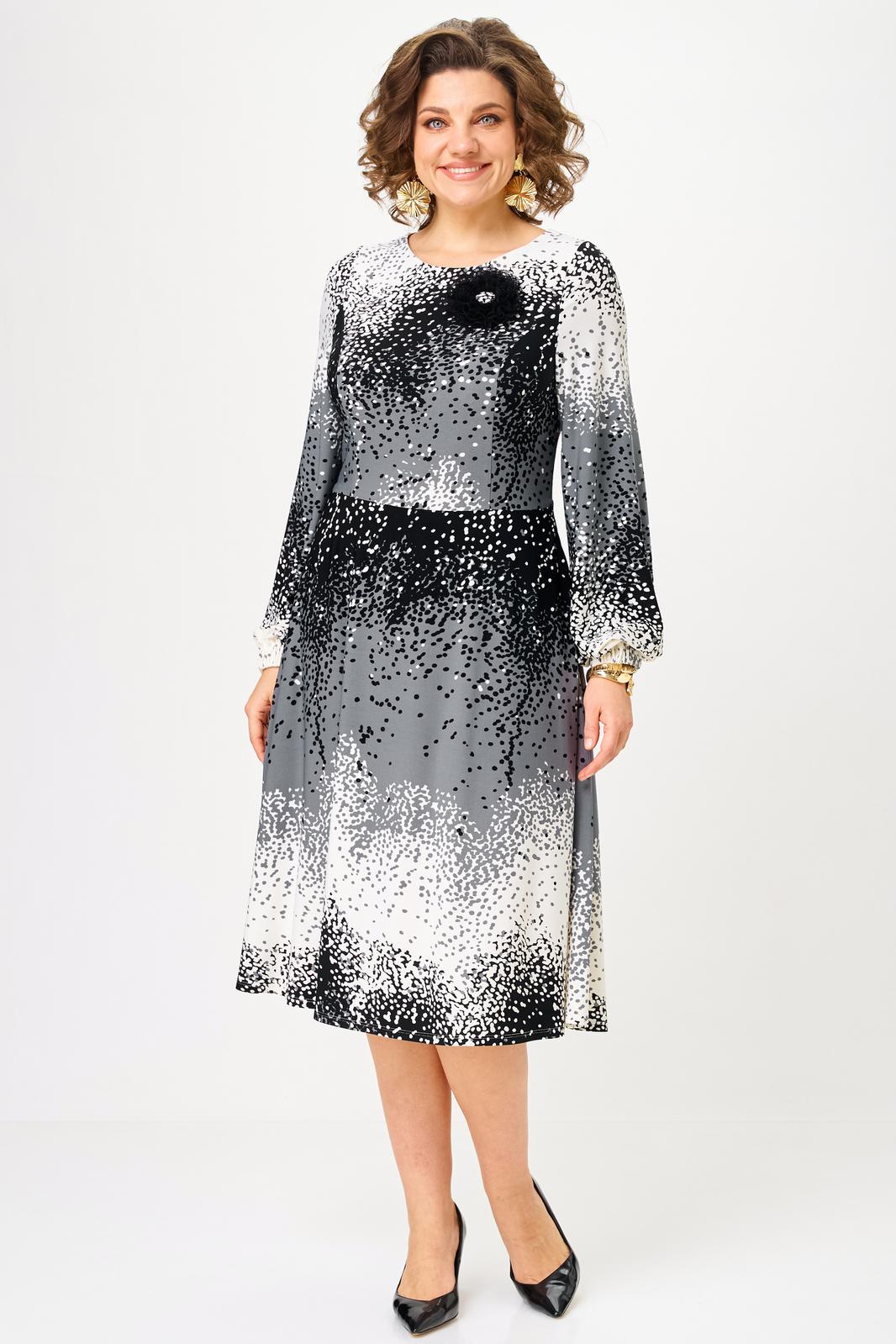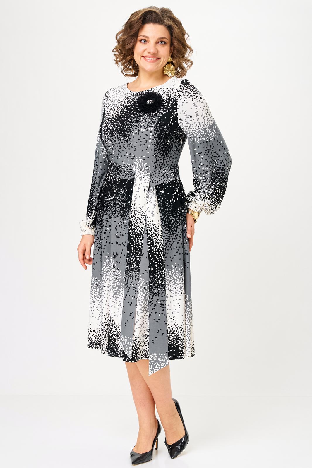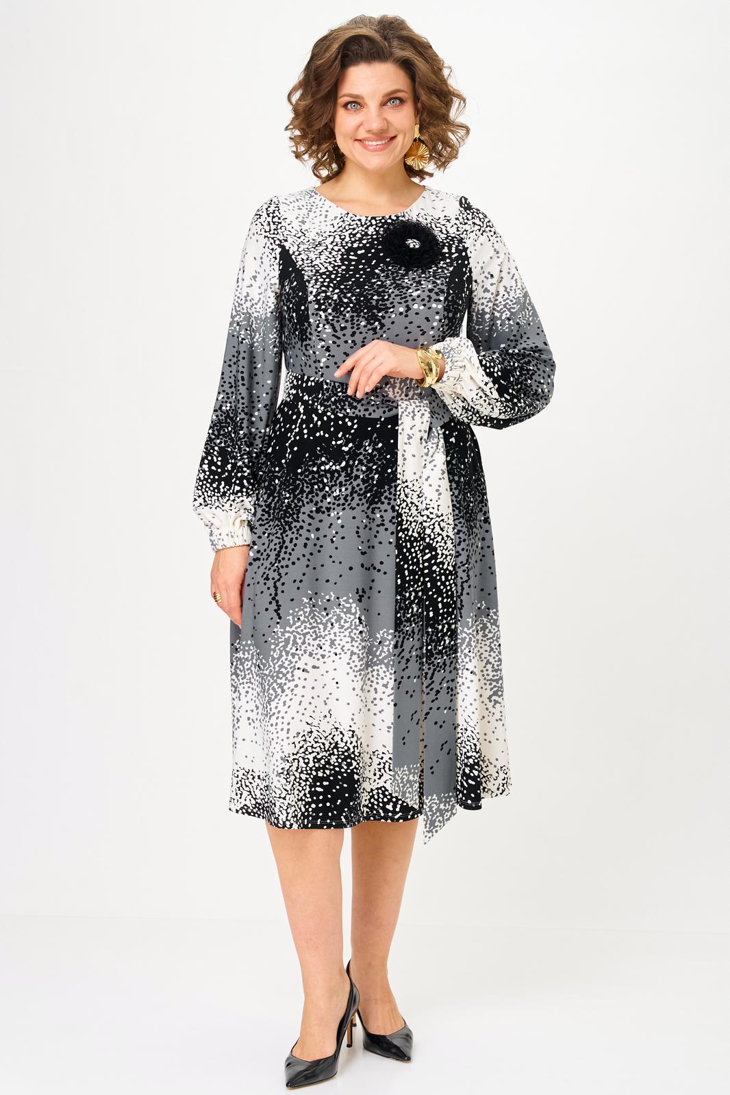 Платье полуприлегающего силуэта, длиной миди, отрезное по линии талии. Горловина округлой формы, обработана обтачкой. Перед лифа с рельефными швами, по спинке - талиевые вытачки. Застежка на молнию в боковом шве. Юбка платья - полусолнце, расклешенная книзу, с функциональными карманами в боковых швах. Рукав втачной прямой, длинный, по низу — манжет на резинке. В комплекте к платью прилагаются съемное украшение-брошь и пояс, который поможет создать акцент на талии.