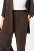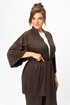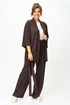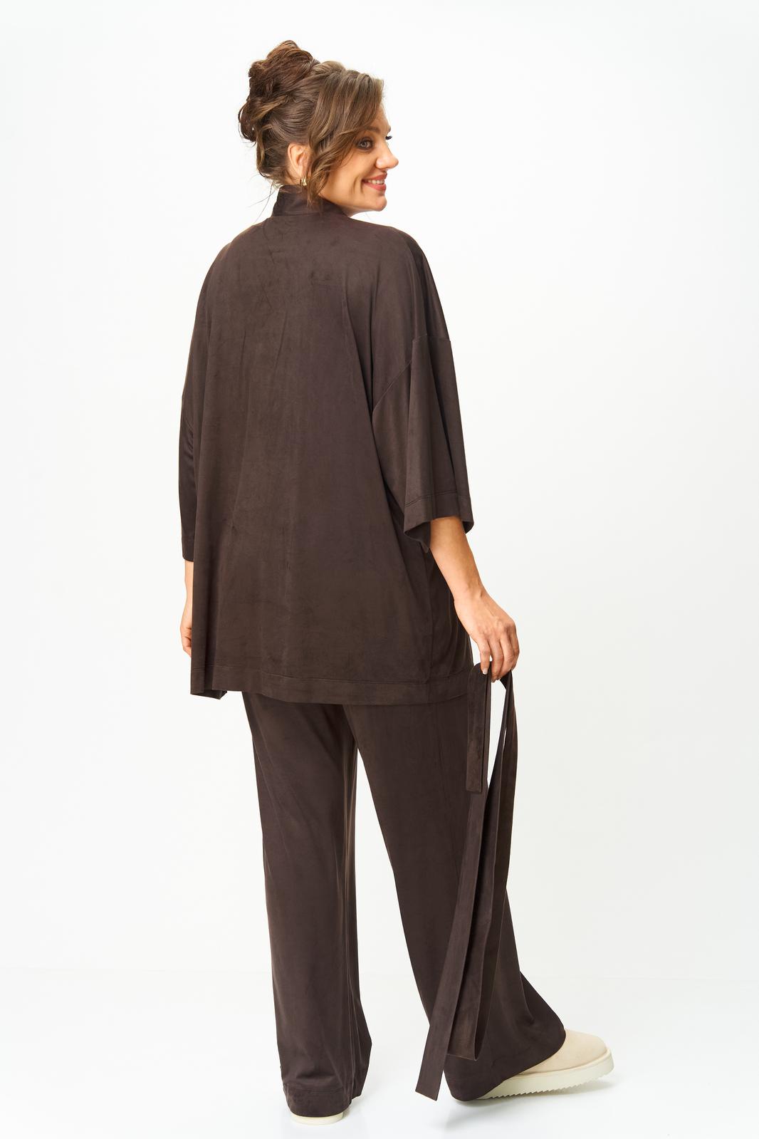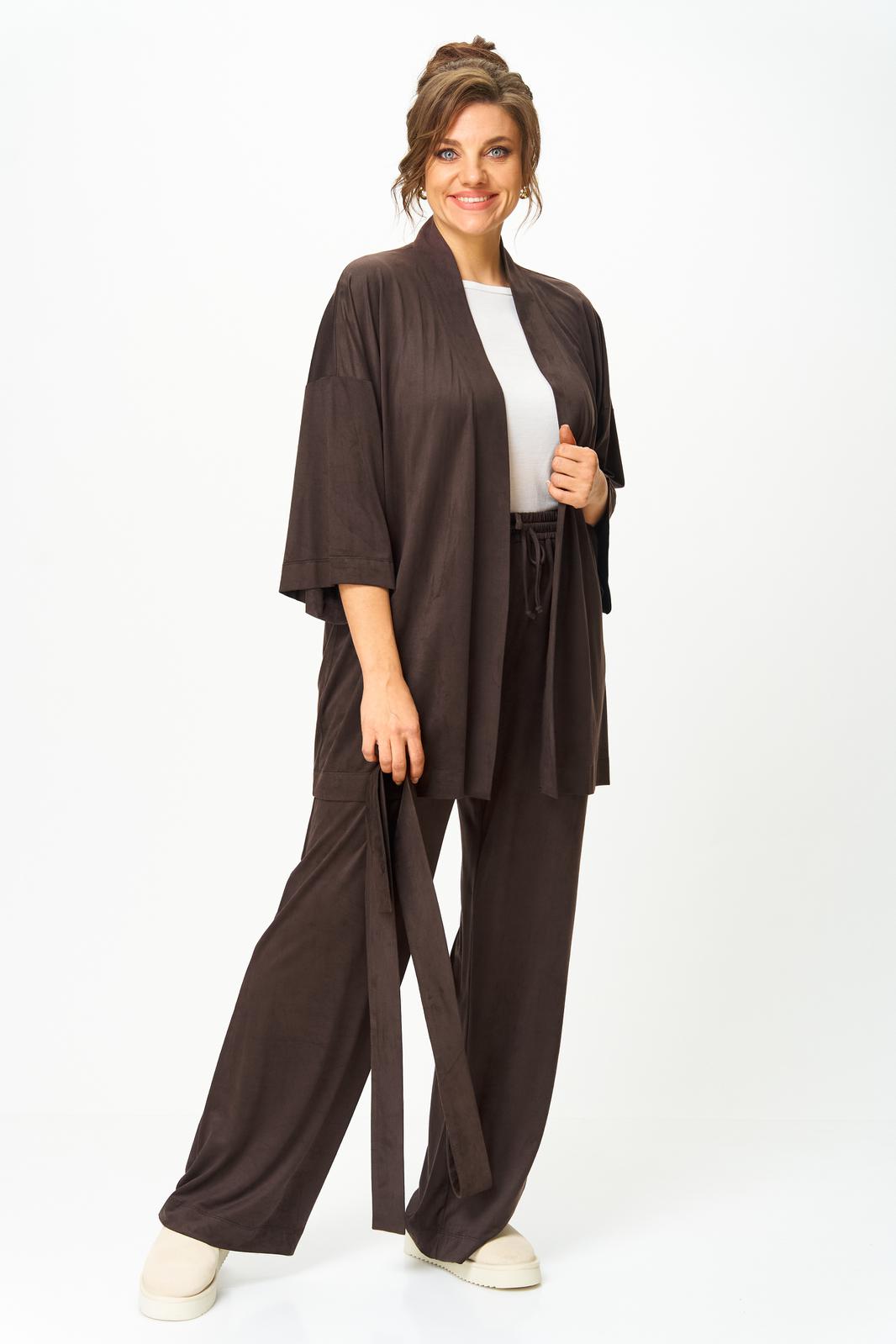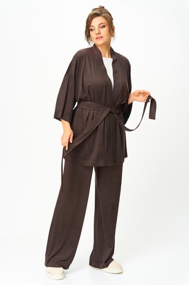 Костюм женский из текстильного полотна состоящий из жакета и брюк . Жакет-кимоно свободного силуэта без подкладки со съёмным поясом . Брюки с высокой посадкой на резинке с боковыми карманами.