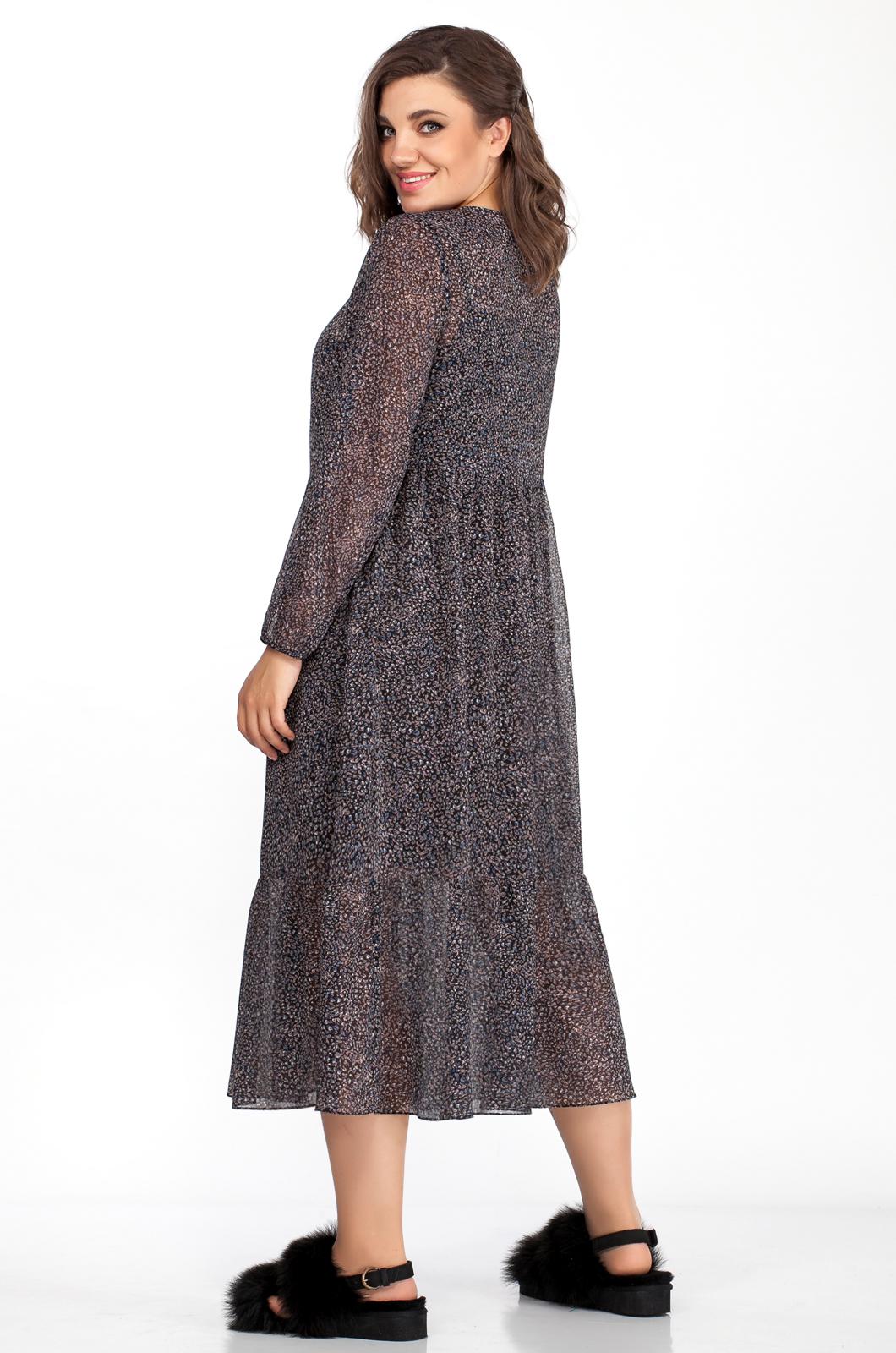 Повседневное двухслойное женское платье из шифона. Верхнее платье отрезное по линии талии, с застежкой по переду на петли пуговицы. Низ рукава обработан резинкой. Нижнее платье выполнено из тонкого трикотажного полотна на регулируемых шлейках. Длина изделия - 122 см. Длина рукава - 57 см.