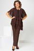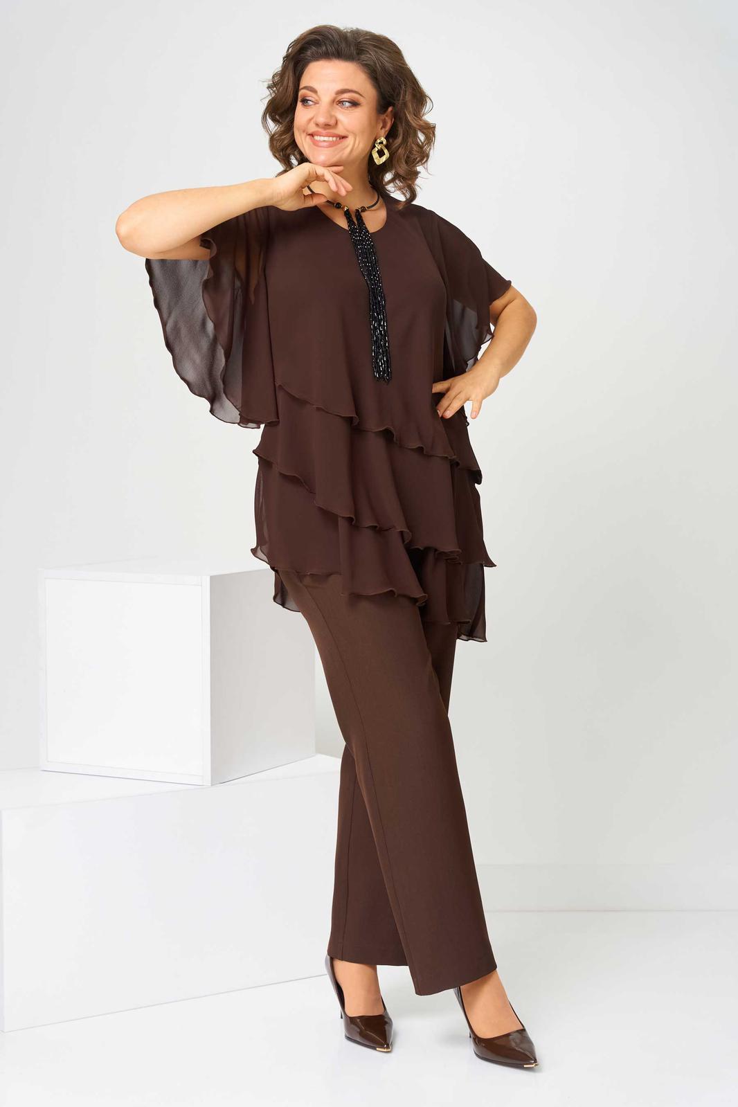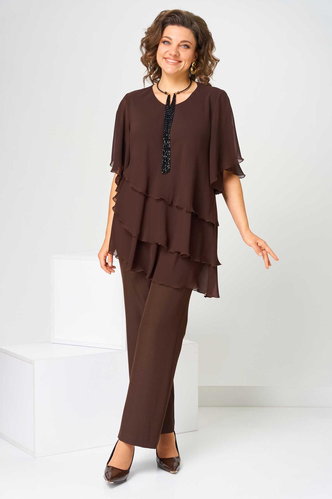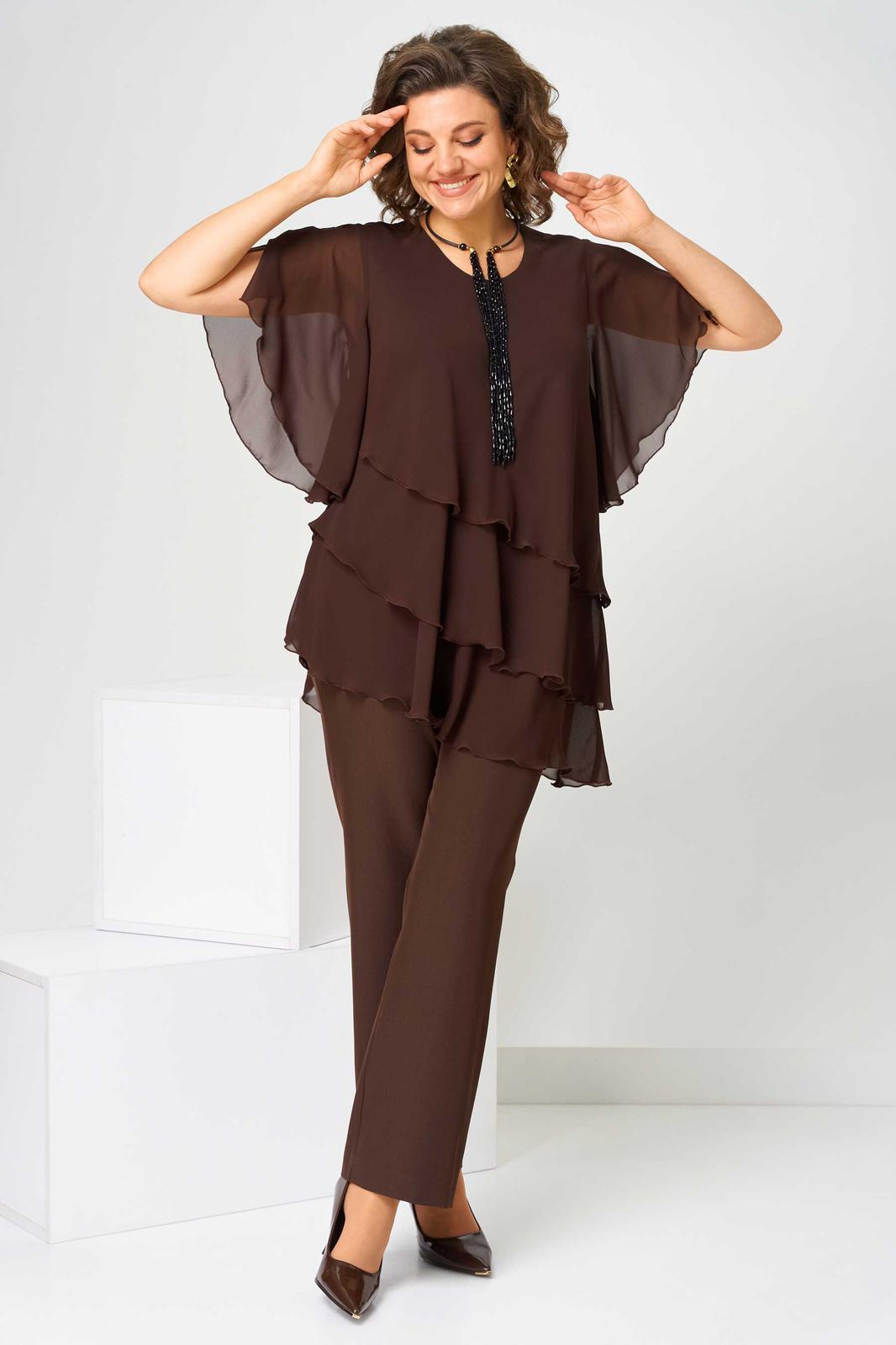 Костюм брючный (двойка) женский свободного силуэта, состоит из блузки и брюк. Блузка с рукавом 3/4 с разрезом и фигурным низом. Изделие (блузка) трехслойное, все слои с асимметричным низом. Застежка-капелька на спинке. Брюки немного расширены к низу, на поясе с резинкой. Застежка на гульфик, на тесьму-молнию.