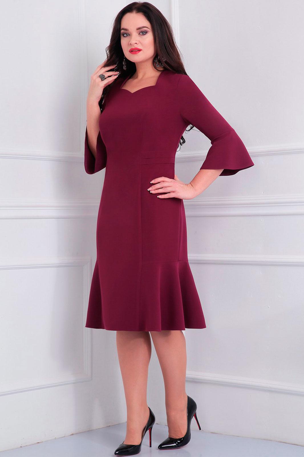 Силуэт: полуприлегающий. Вид застежки: застёжка-молния в центральном шве спинки. Платье женское нарядное, полуприлегающего силуэта из стрейчевой плательной ткани. Рукав три четверти, с расклёшенным манжетом. Горловина фигурная. Перед с рельефами из проймы до низа. По талии складки. Платье заужено к низу, с подрезом по бокам. Из подреза расклёшенный волан по переду и спинке. Шлица и застёжка-молния в центральном шве спинки, рельефы из проймы до низа.