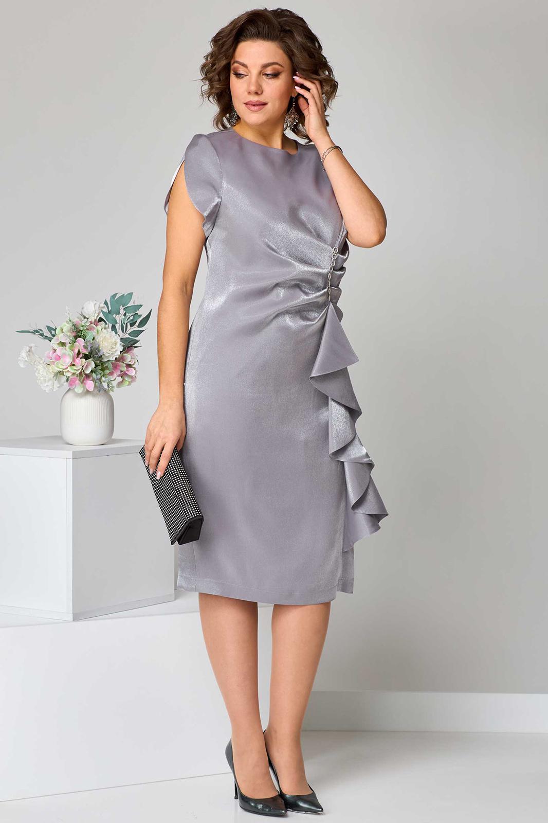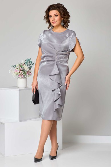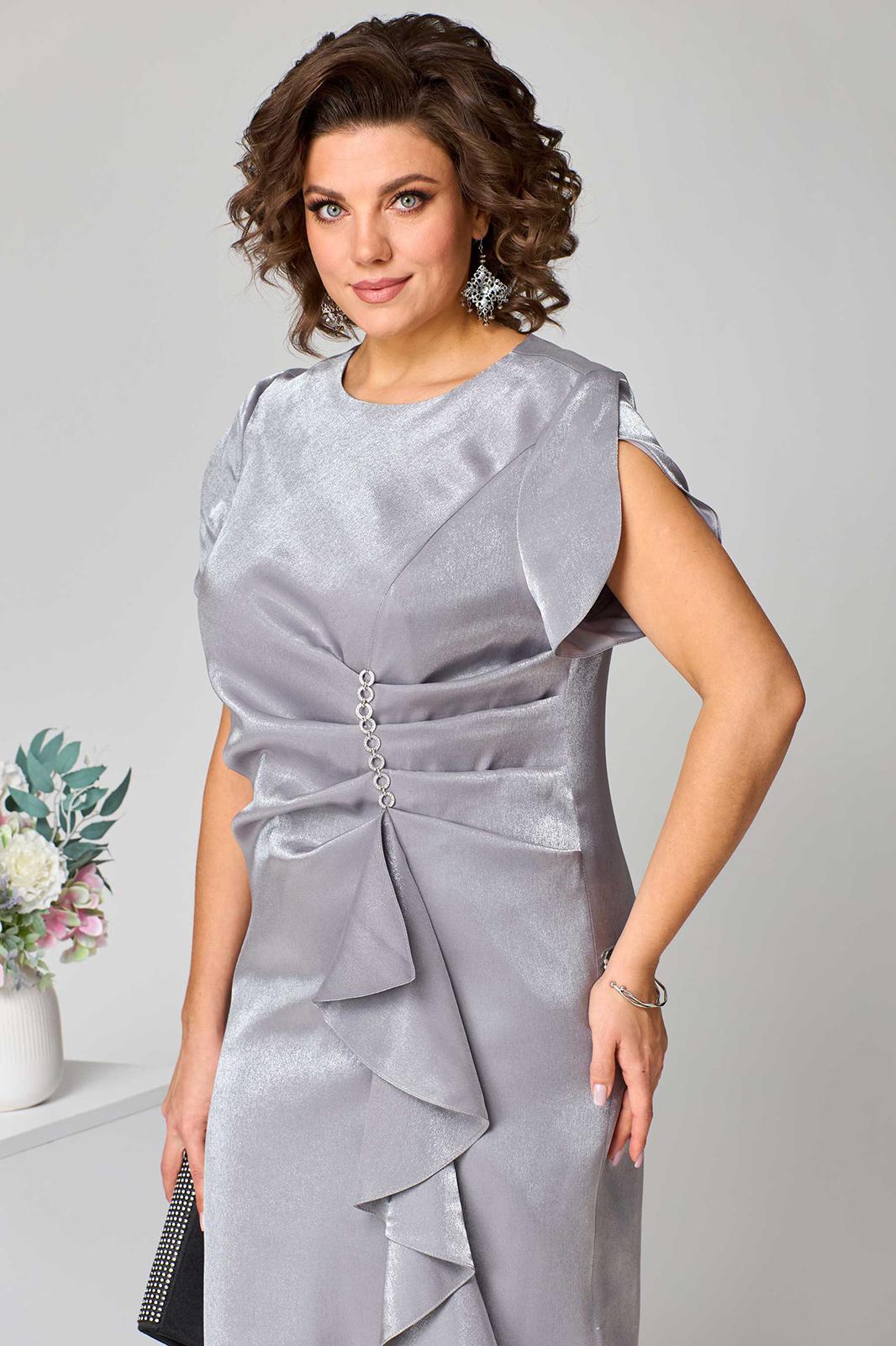 Платье женское нарядное полуприлегающего силуэта, выполнено из плательной ткани. Вырез округлый. Изделие на подкладке. Рукав короткий из двух частей. По переду рельеф асимметричный с драпировкой и каскадом. Спинка с центральным швом, в котором вверху застежка на тесьму-молнию, вверху шлица.