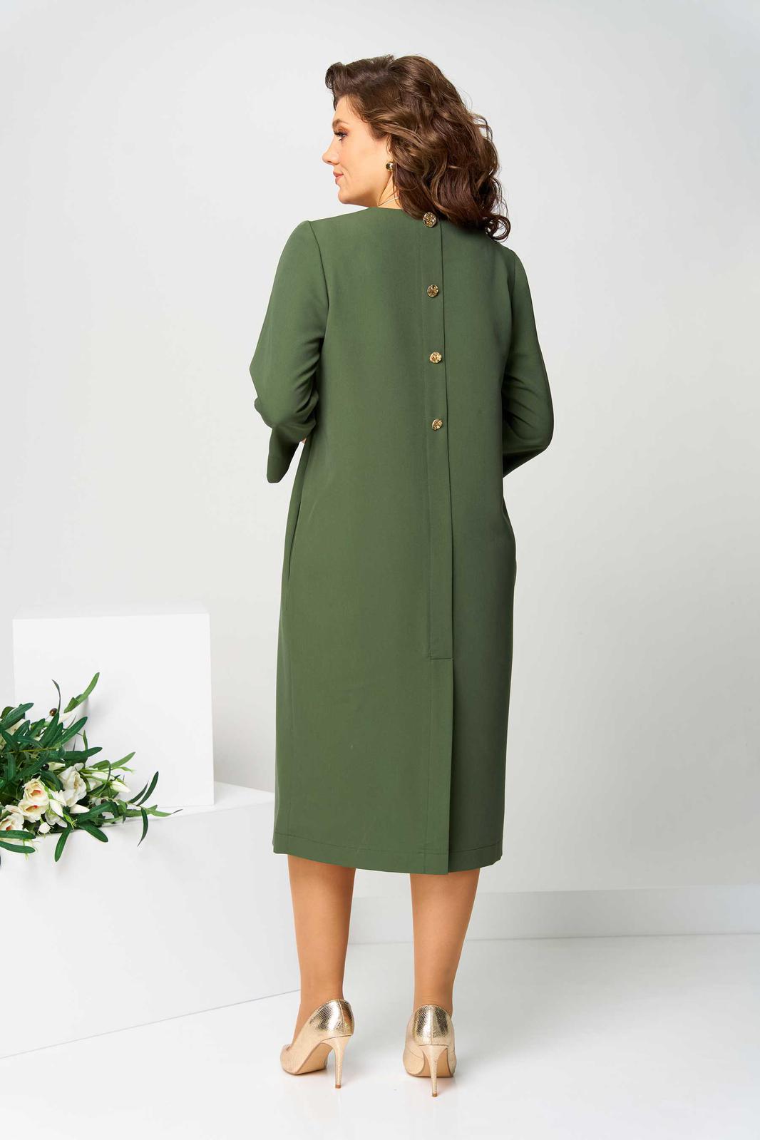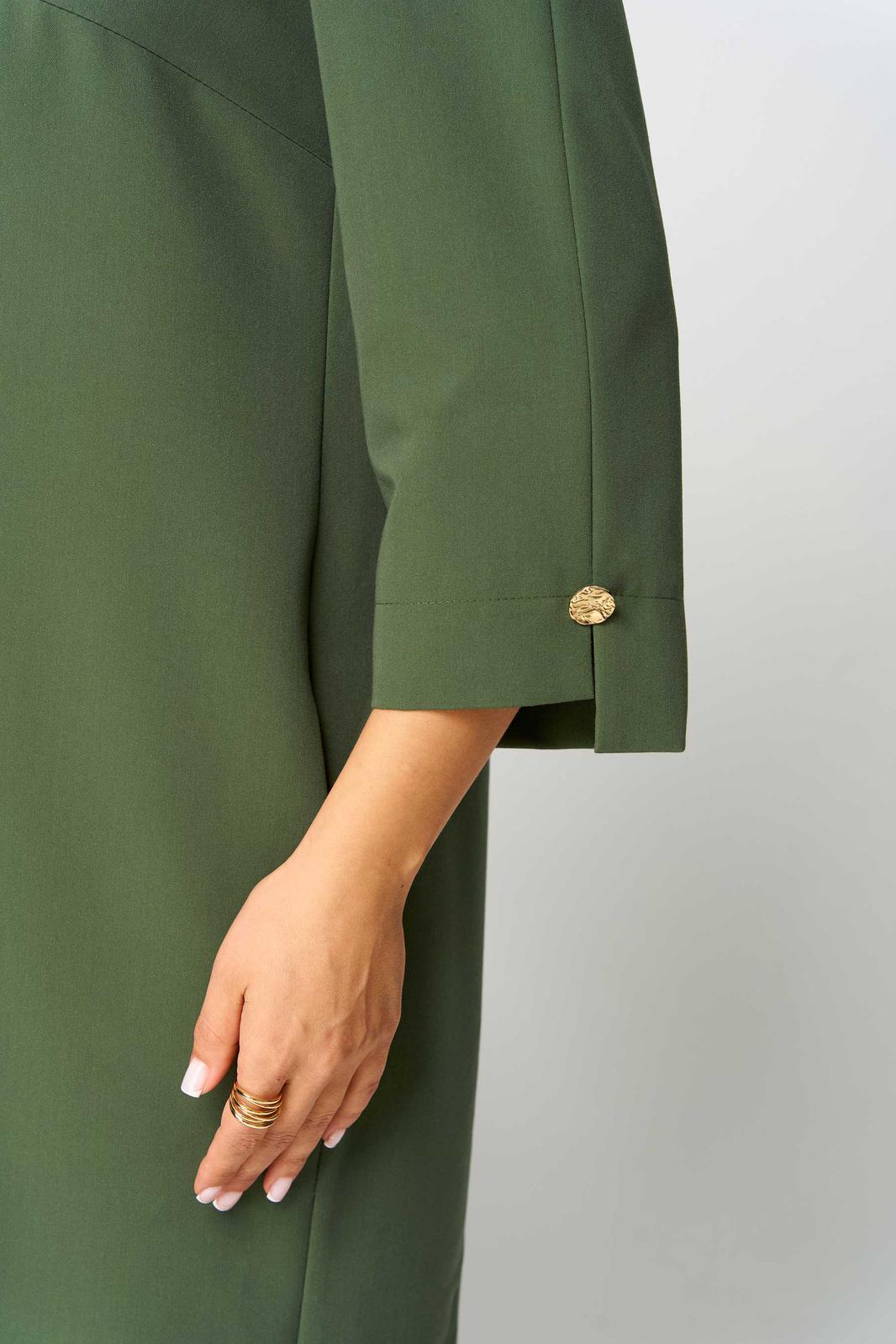 Платье женское полуприлегающего силуэта. Вырез горловины округлый. Платье украшено по переду печатью, на спинке планкой с декоративными пуговицами и шлицей. В боковых швах карманы. Рукав втачной, длиной ¾, по низу разрез, украшенный пуговицей.