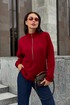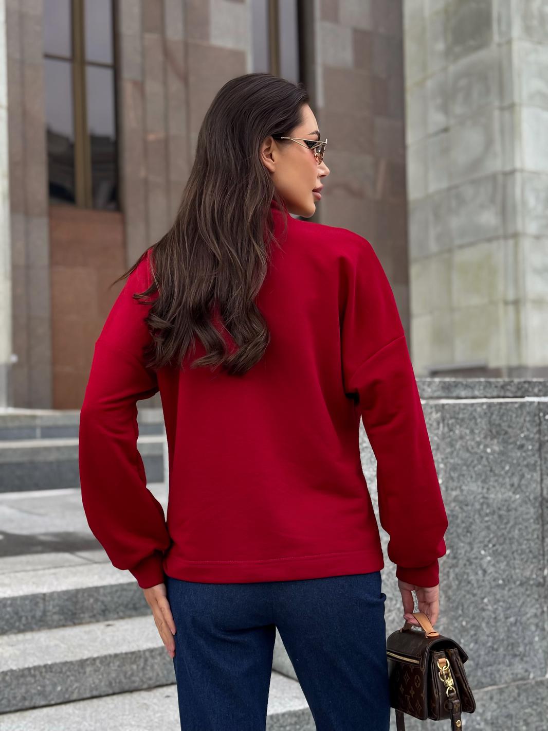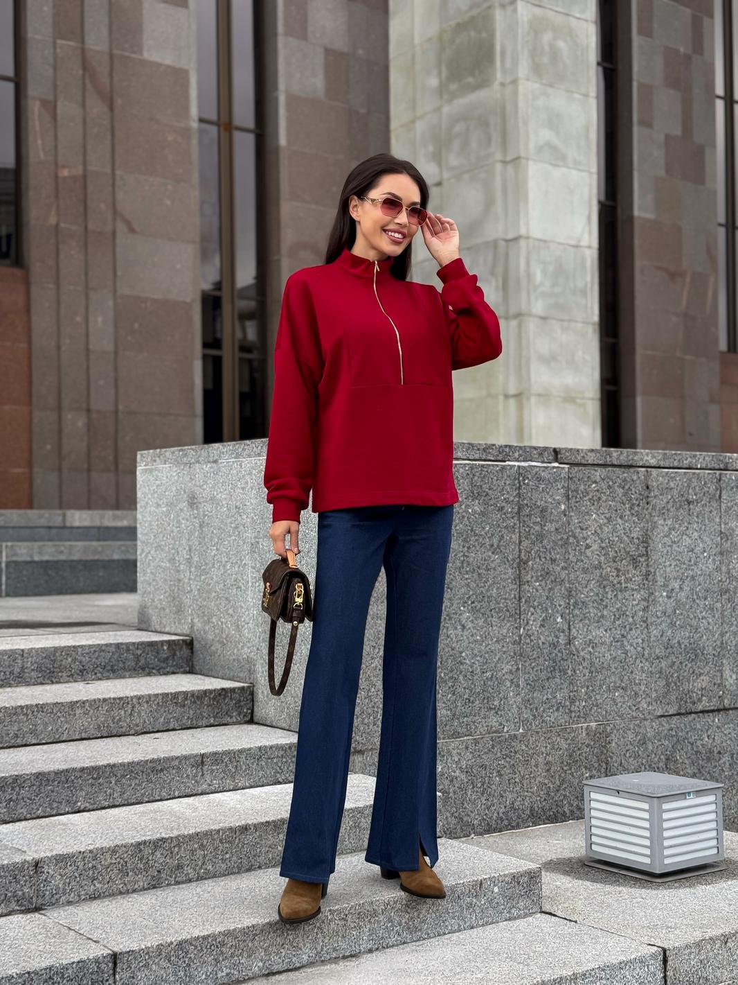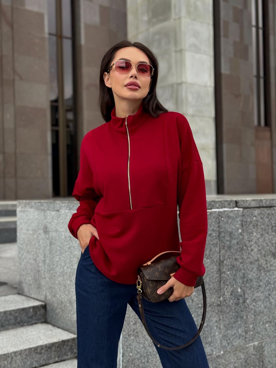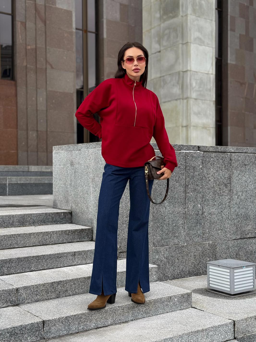 Джемпер трикотажный, свободного силуэта. Лиф обработан молнией, воротник притачной, свободный, рукав втачной, свободный, по низу обработан манжетой, линия плеча спущена.