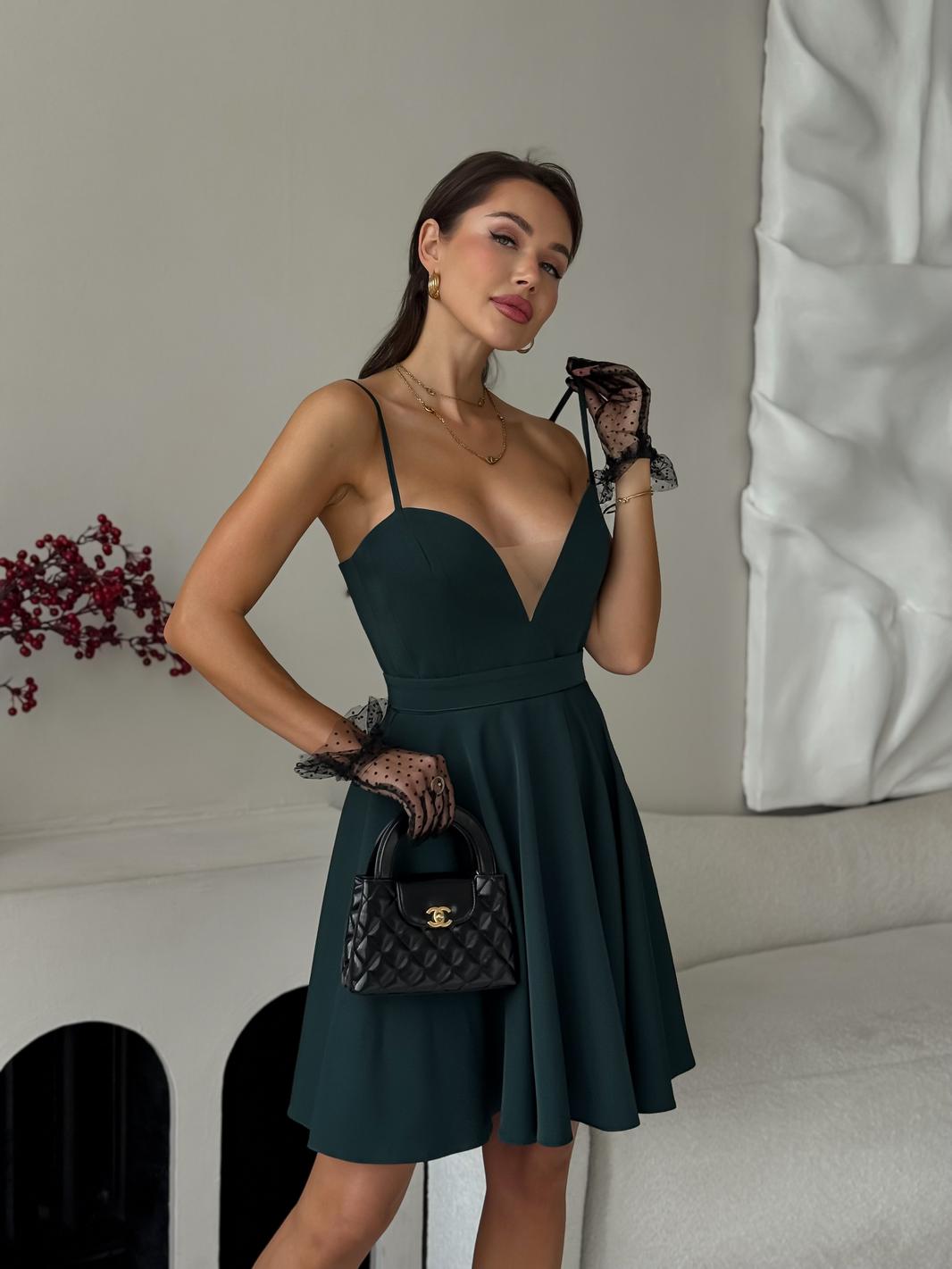 Каждый вечер станет особенным в этом платье, ведь оно сногсшибательно подчеркивает фигуру. Глубокое декольте дополненно эластичной вставкой из нюдовой сетки, а пышная юбка-мини позволит продемонстрировать всю красоту ваших ножек. Спинка задекорированна кокетливой шнуровкой для регулировки по фигуре. Застежка на потайную молнию по спинке юбки в среднем шве.