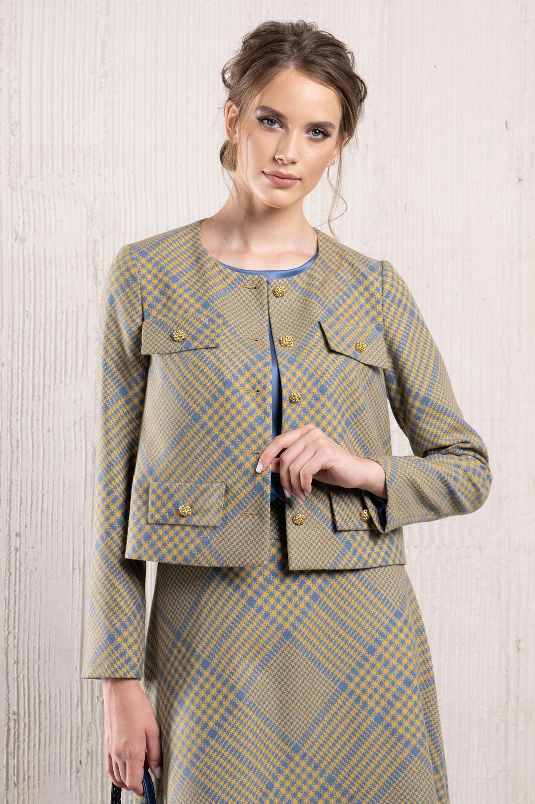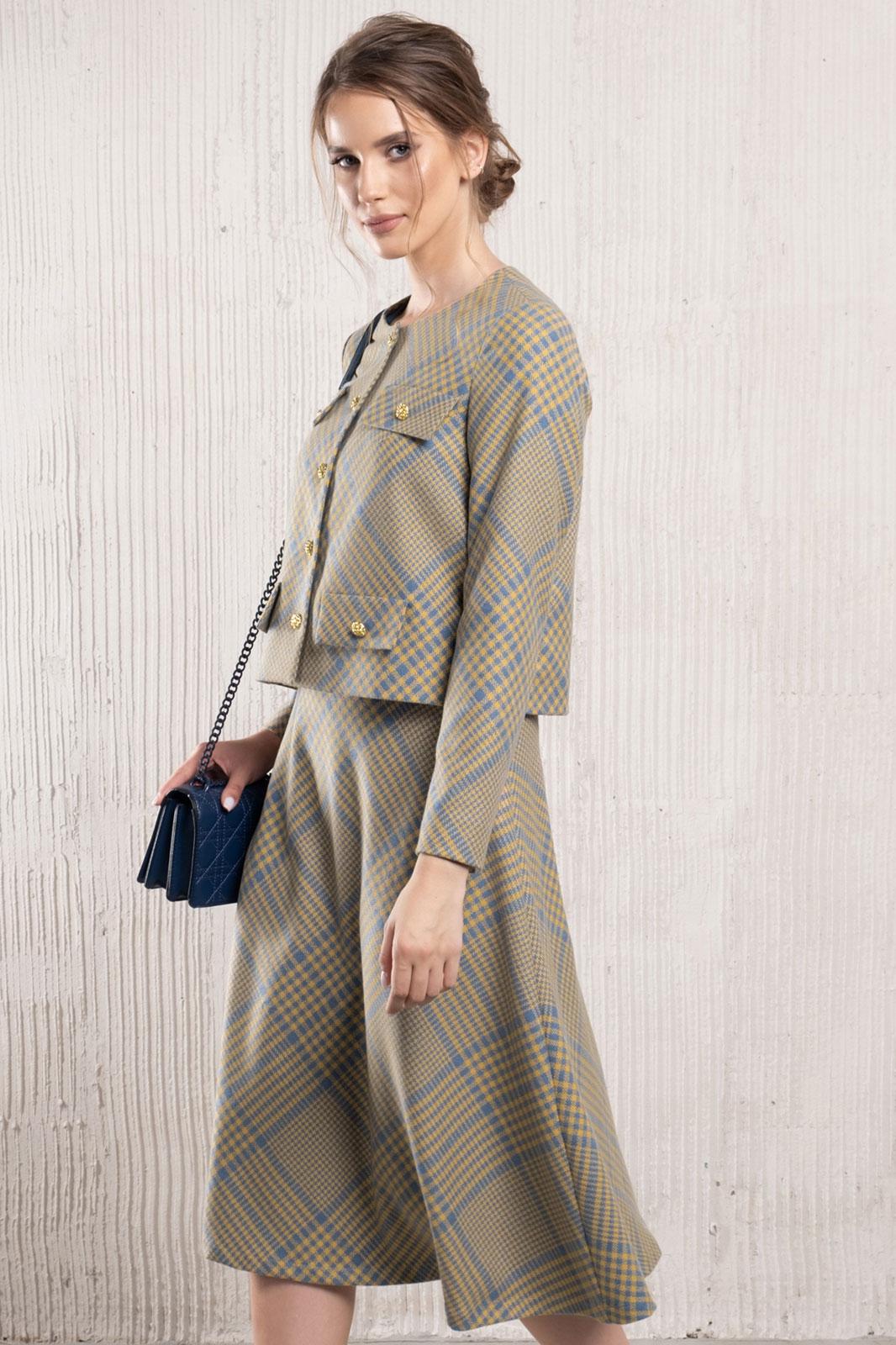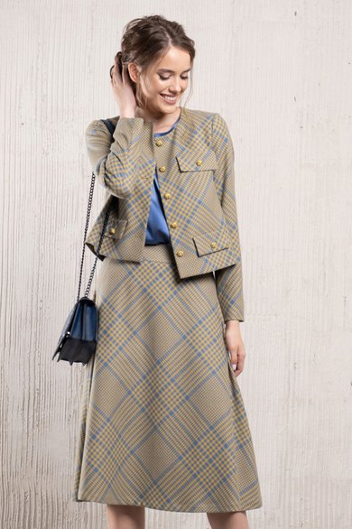 Комплект двойка: жакет+юбка. Ткань костюмно-плательная средней плотности, приятная на ощупь. Жакет укороченный. Изделие на подкладе. Застежка на пуговицы спереди. На переде имитация карманов. Длина жакета в малой базе 51 см, в большой - 55 см. Рукав втачной, длина в малой базе 61 см, в большой базе 62 см. Юбка покроя колокол. На подкладrе. Застежка на молнию в среднем шве. Длина юбки 76 см.