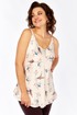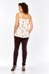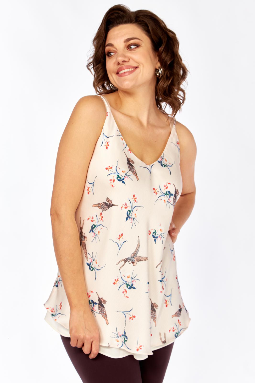 Топ на бретелях полуприлегающего силуэта. Топ двойной верх выполнен из ткани с дизайном, низ однотон. Перед покроен по косой. Бретели регулируются. Длина по боковому-45см.Параметры модели: обхват груди-98см, обхват бедер-110см, размер топа на модели 50.