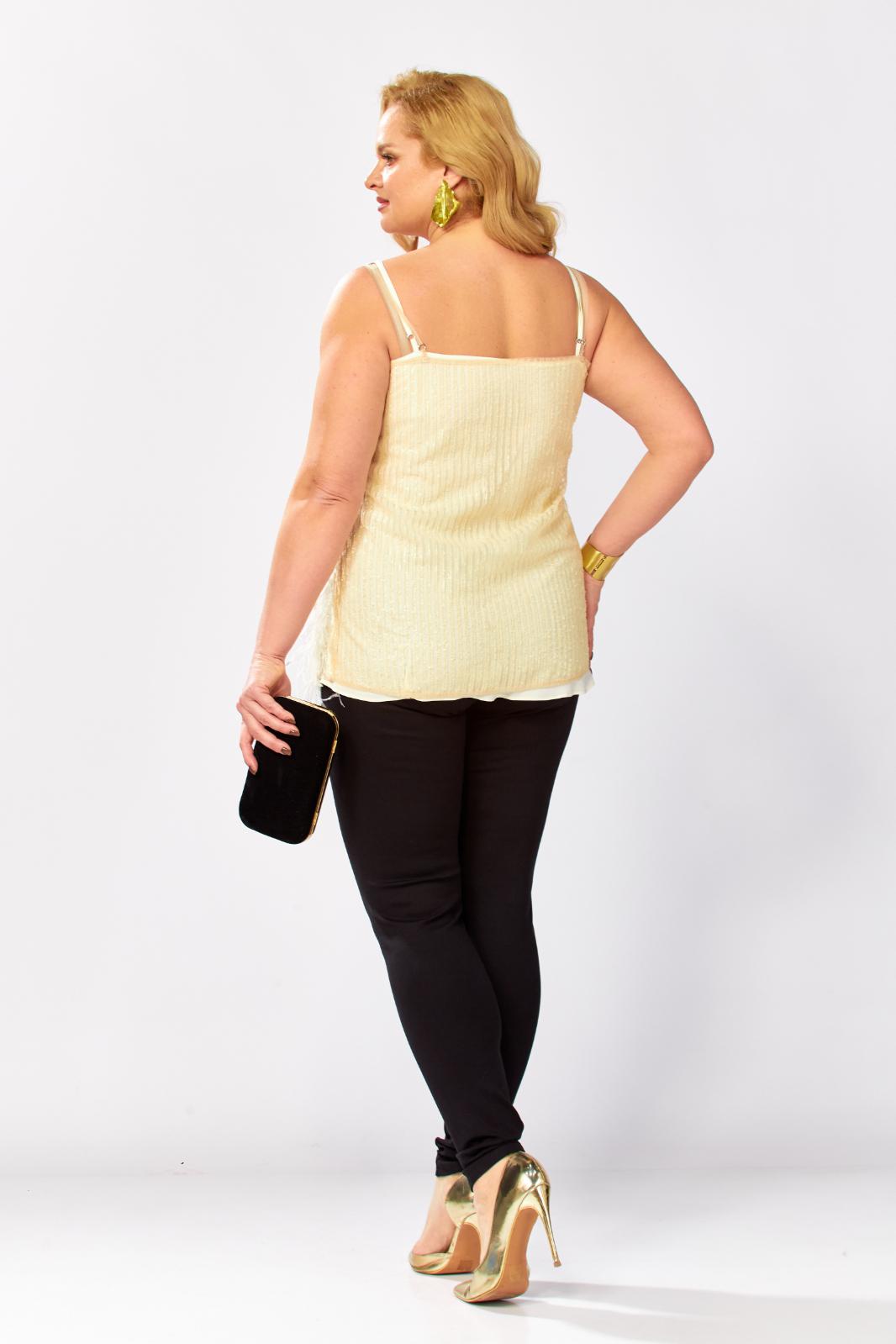 Топ на бретелях полуприлегающего силуэта. Топ состоит из двух топов: верхний выполнен из сетки с вышивкой с пайетками, нижний из однотонной вискозы(штапель). Перед покроен по косой. Бретели регулируются. Каждый из топов можно носить по отдельности и комбинировать с другими предметами гардероба. Длина по боковому-45см.Параметры модели: обхват груди-108см, обхват бедер-114см, размер изделия на модели 54.