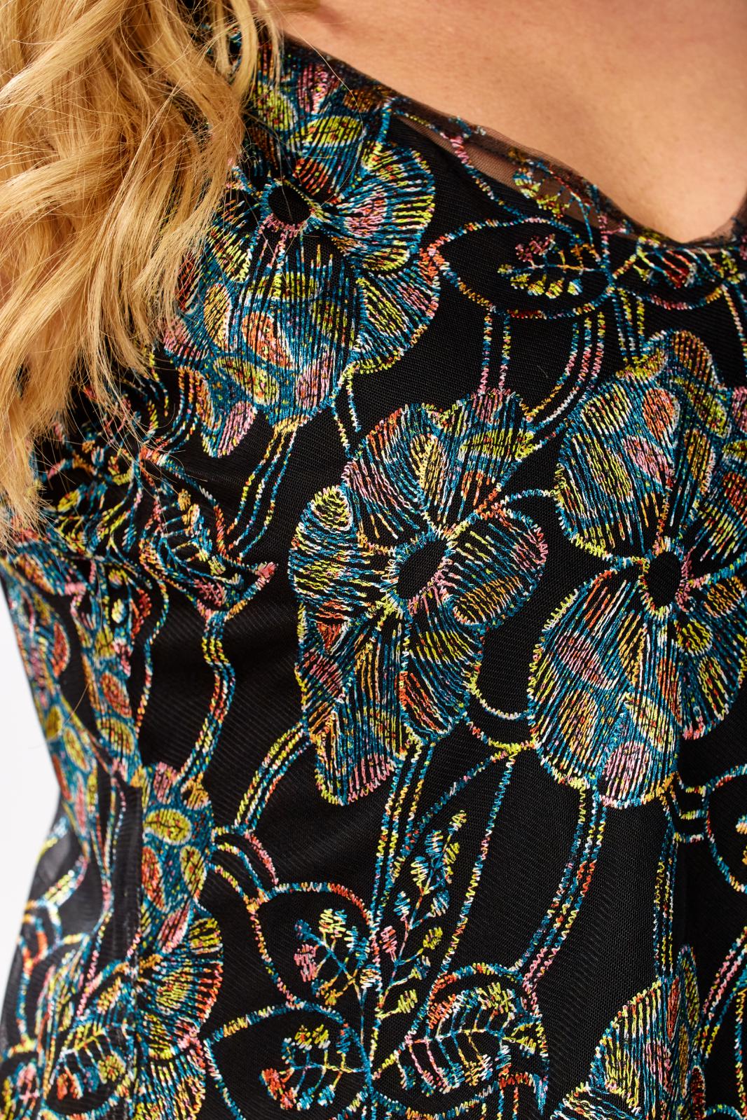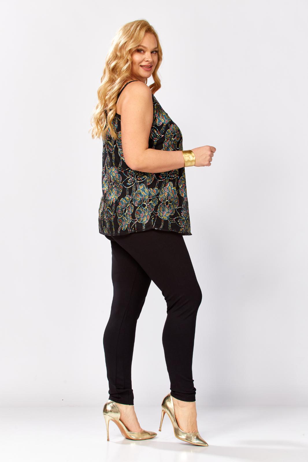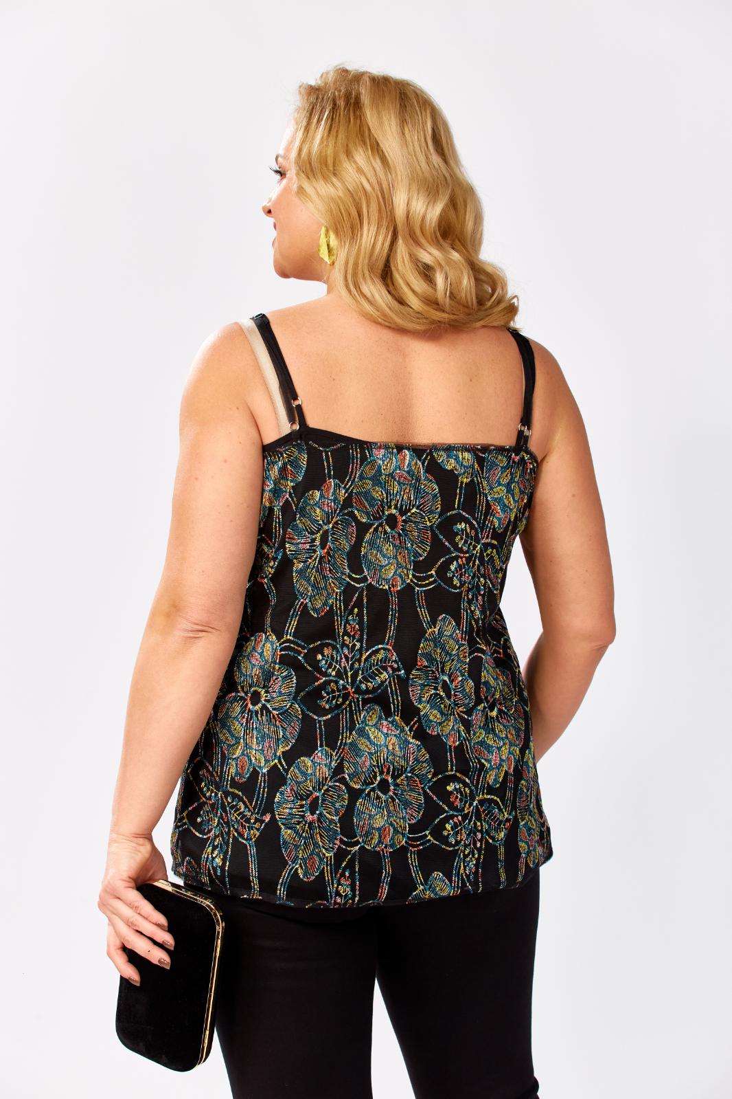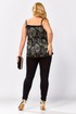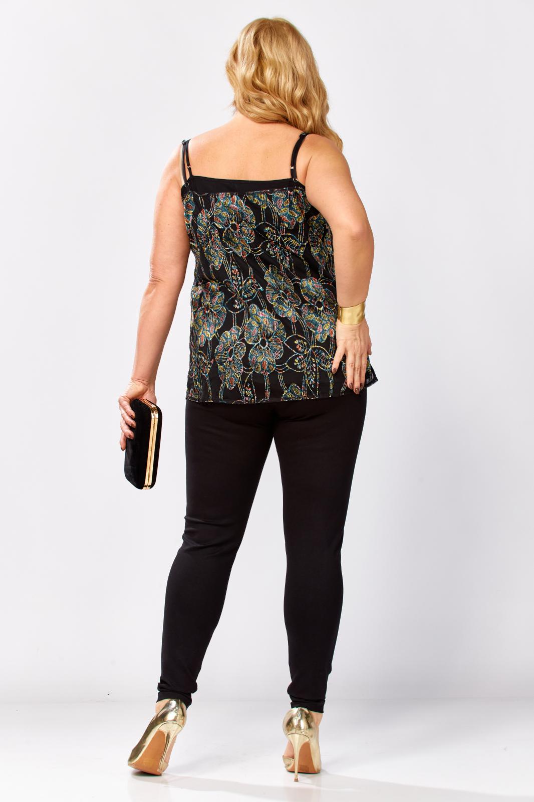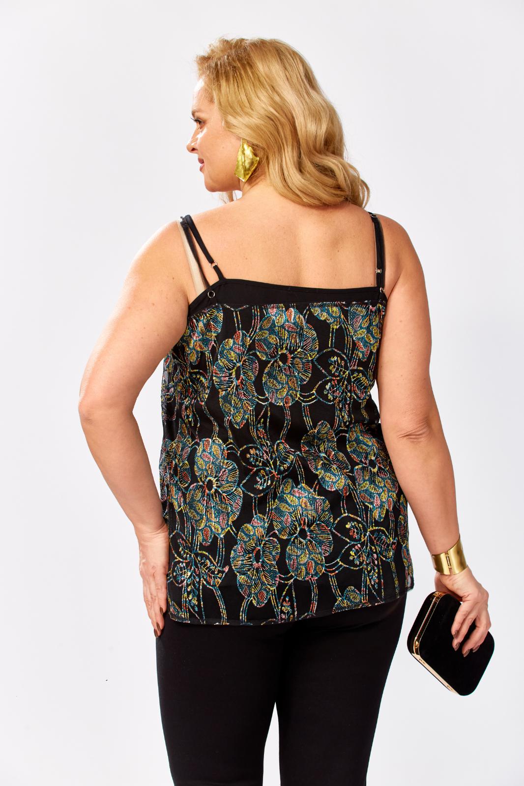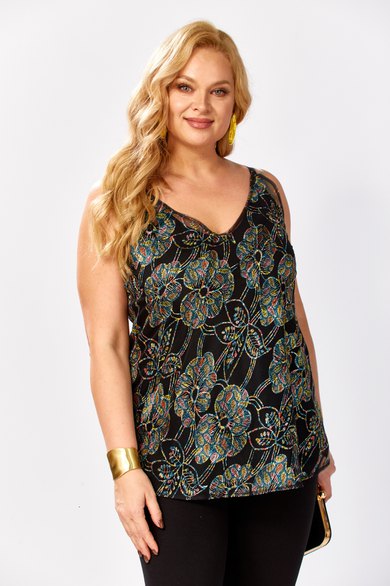 Топ на бретелях полуприлегающего силуэта. Топ состоит из двух топов: верхний выполнен из сетки с вышивкой с пайетками, нижний из однотонной вискозы(штапель). Перед покроен по косой. Бретели регулируются. Каждый из топов можно носить по отдельности и комбинировать с другими предметами гардероба. Длина по боковому-45см.Параметры модели: обхват груди-108см, обхват бедер-114см, размер изделия на модели 54.