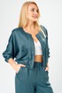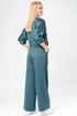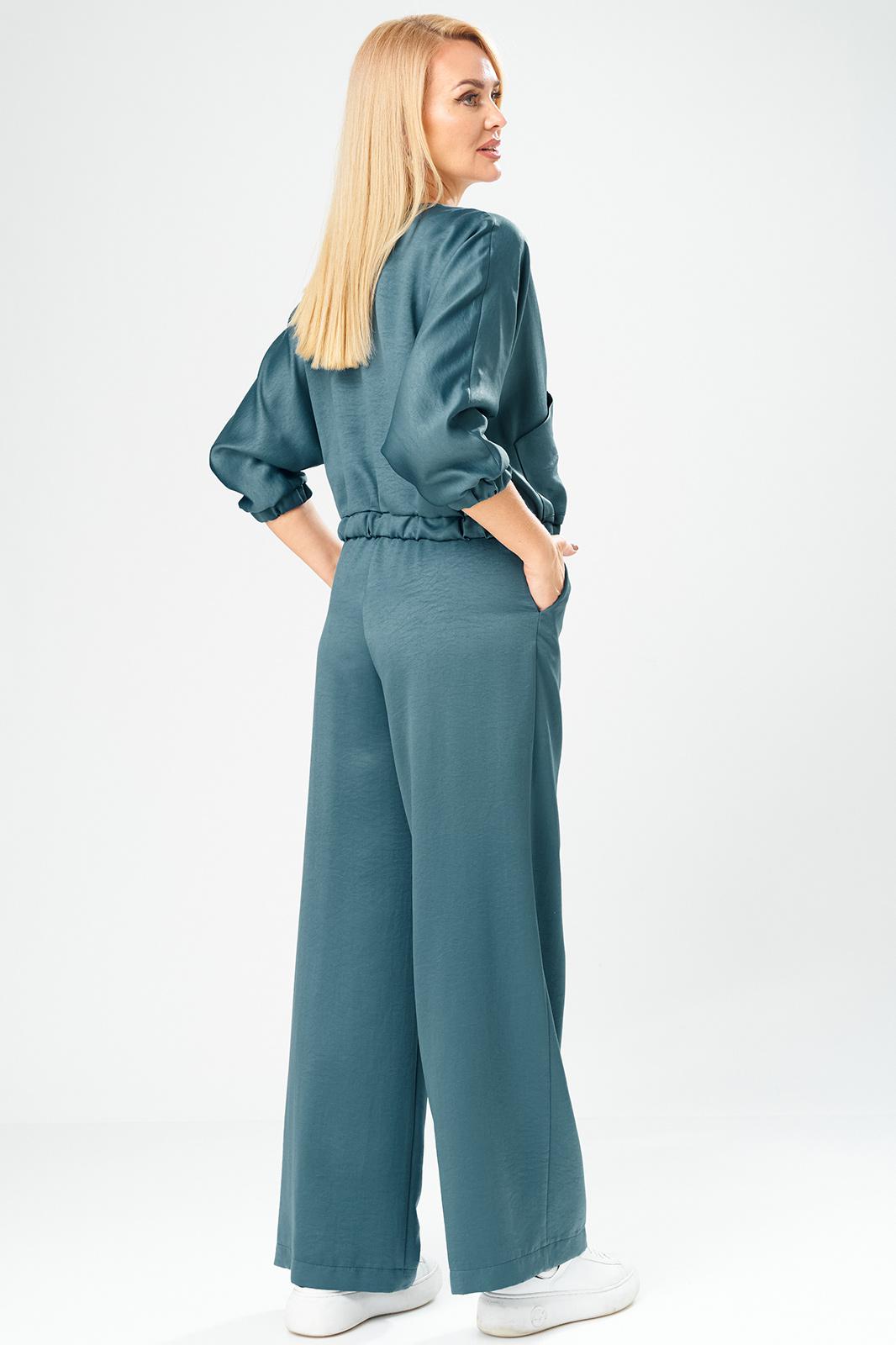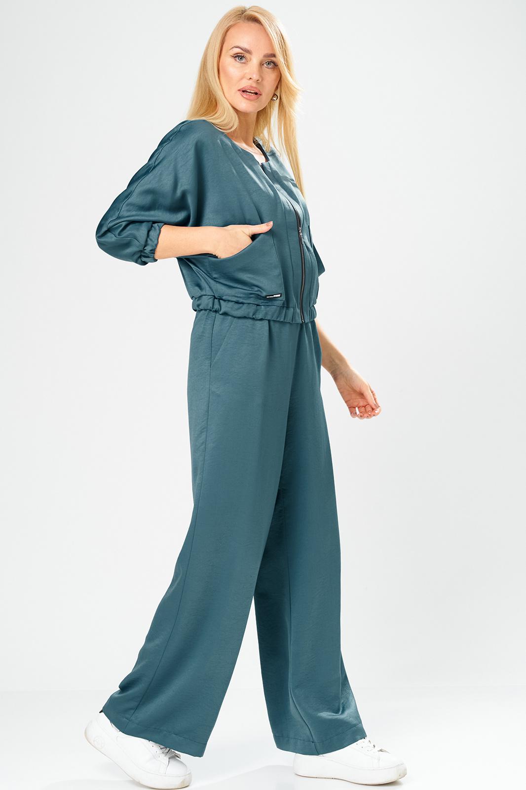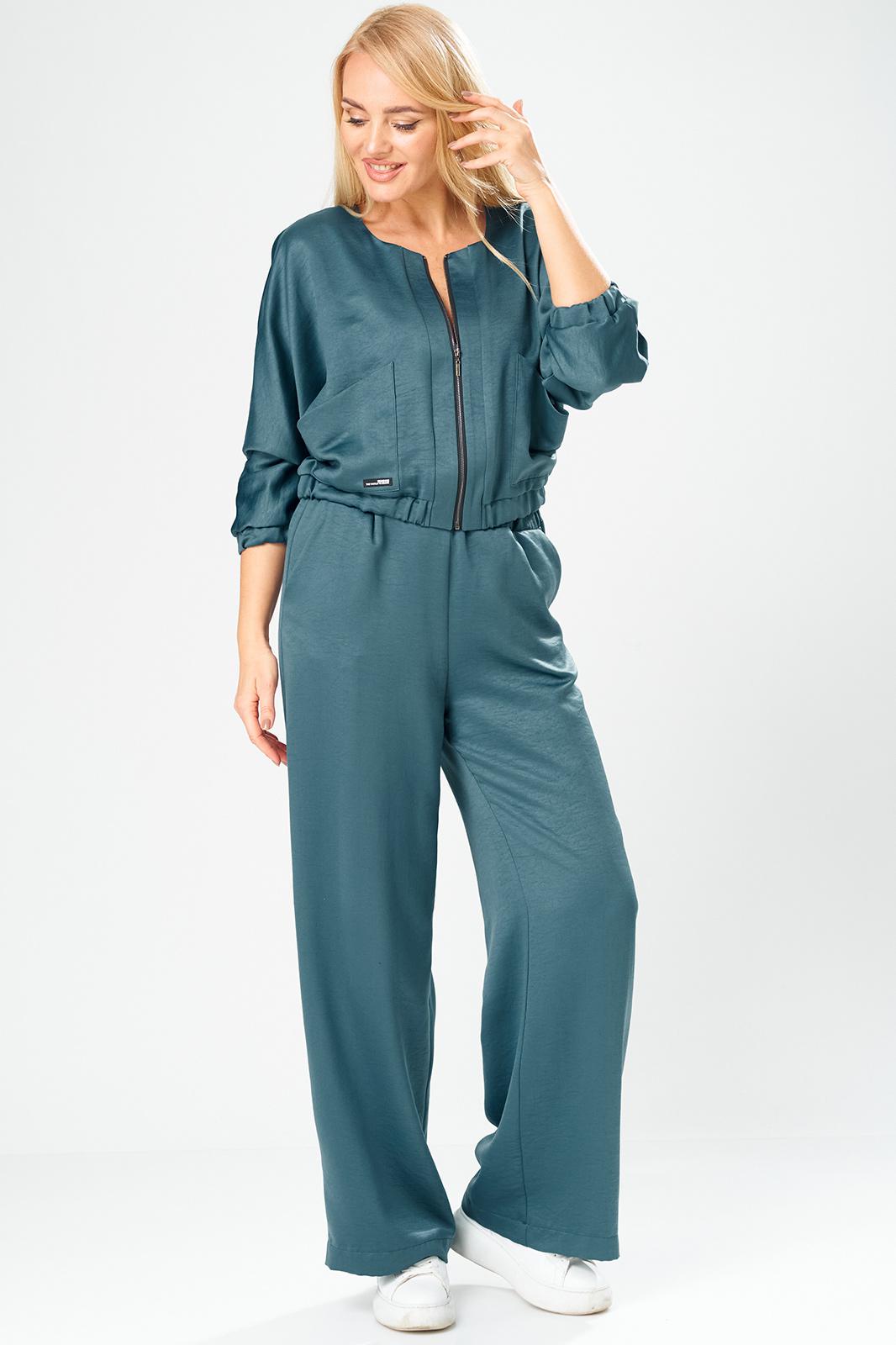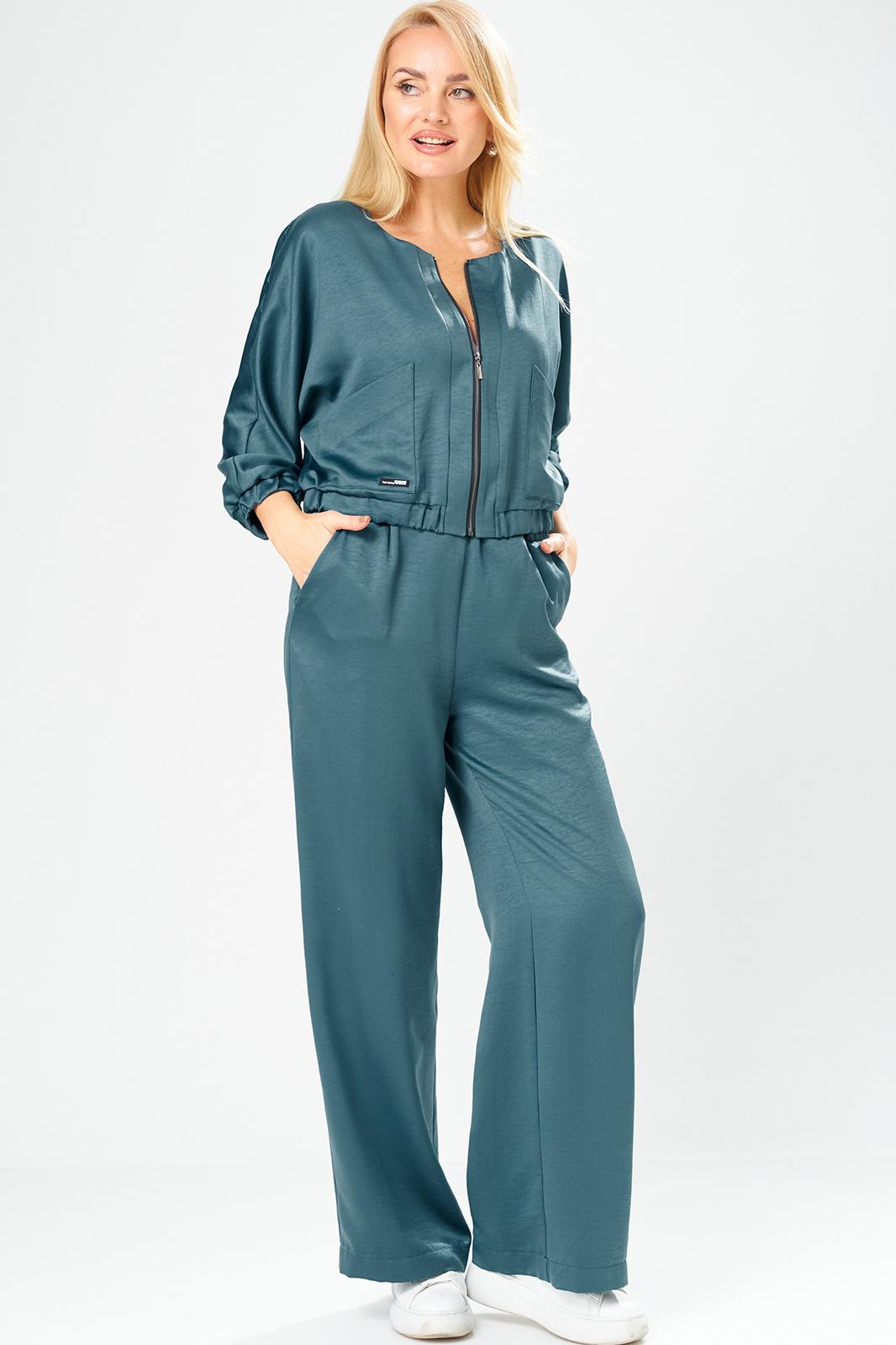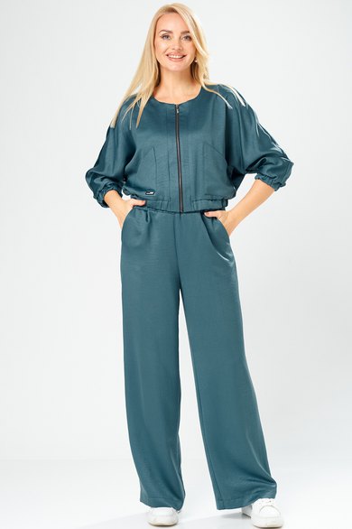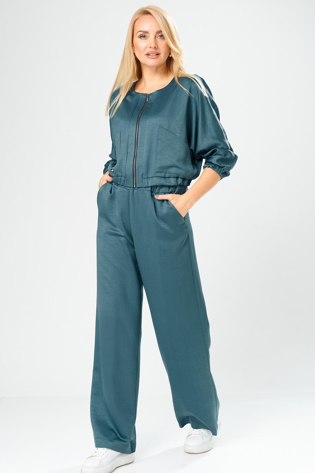 Брючный комплект в городском стиле идеально подойдет для тех, кто ценит комфорт и стиль. Он выполнен из мягкого, уютного сатина, приятного к телу, не мнется, что позволит сохранить опрятный вид в течении дня. Комплект состоит из широких брюк и укороченного бомбера на молнии, декорированного накладными карманами. Свободные брюки с поясом на резинке в стиле палаццо визуально стройнят и вытягивают фигуру, а также обеспечивают свободу движения и удобство. В боковых швах брюк выполнены удобные функциональные карманы.