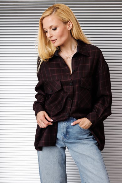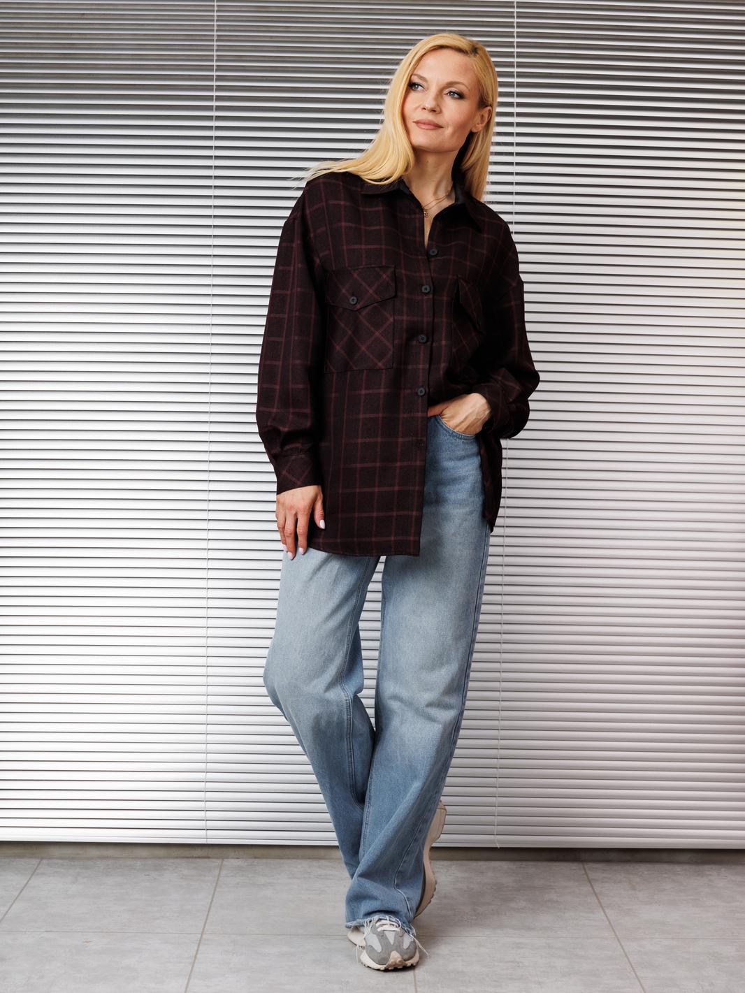 Блузка женская свободного покроя со спущенной и углублённой проймой и втачным рукавом с манжетой по низу рукава. По переду накладные карманы по линии груди, воротник рубашечный на стойке, застёжка спереди на петли и пуговицы. Низ изделия фигурный.