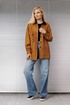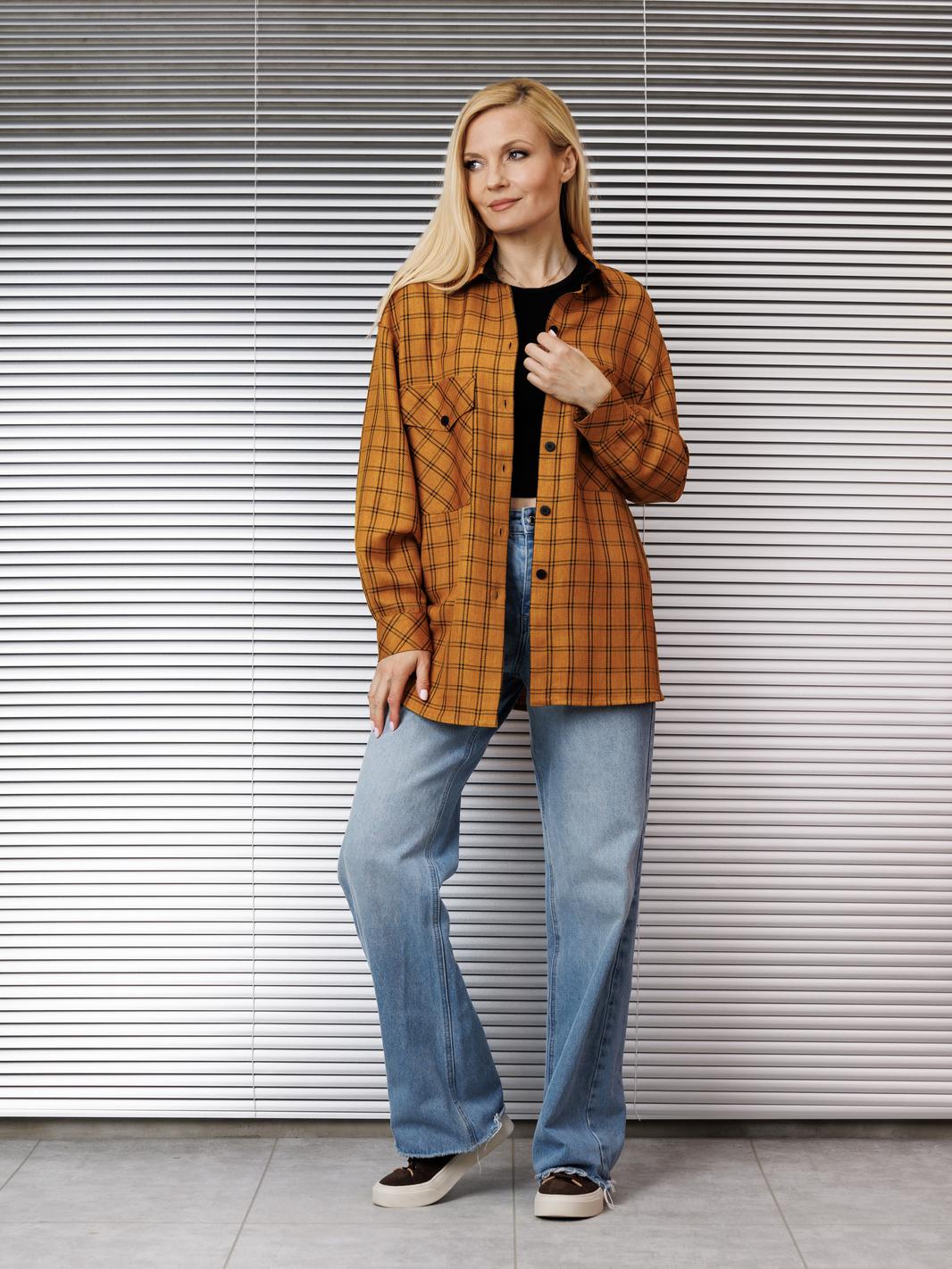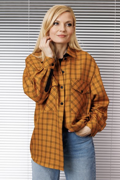 Блузка женская свободного покроя со спущенной и углублённой проймой и втачным рукавом с манжетой по низу рукава. По переду накладные карманы по линии груди, воротник рубашечный на стойке, застёжка спереди на петли и пуговицы. Низ изделия фигурный.