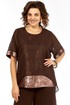Нижняя часть блузы и манжеты верхней части выполнены из блузочной ткани цвета серебро с эффектом патины. Нижняя часть без рукавов. Проймы нижней части блузы обработаны косой бейкой.