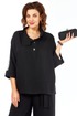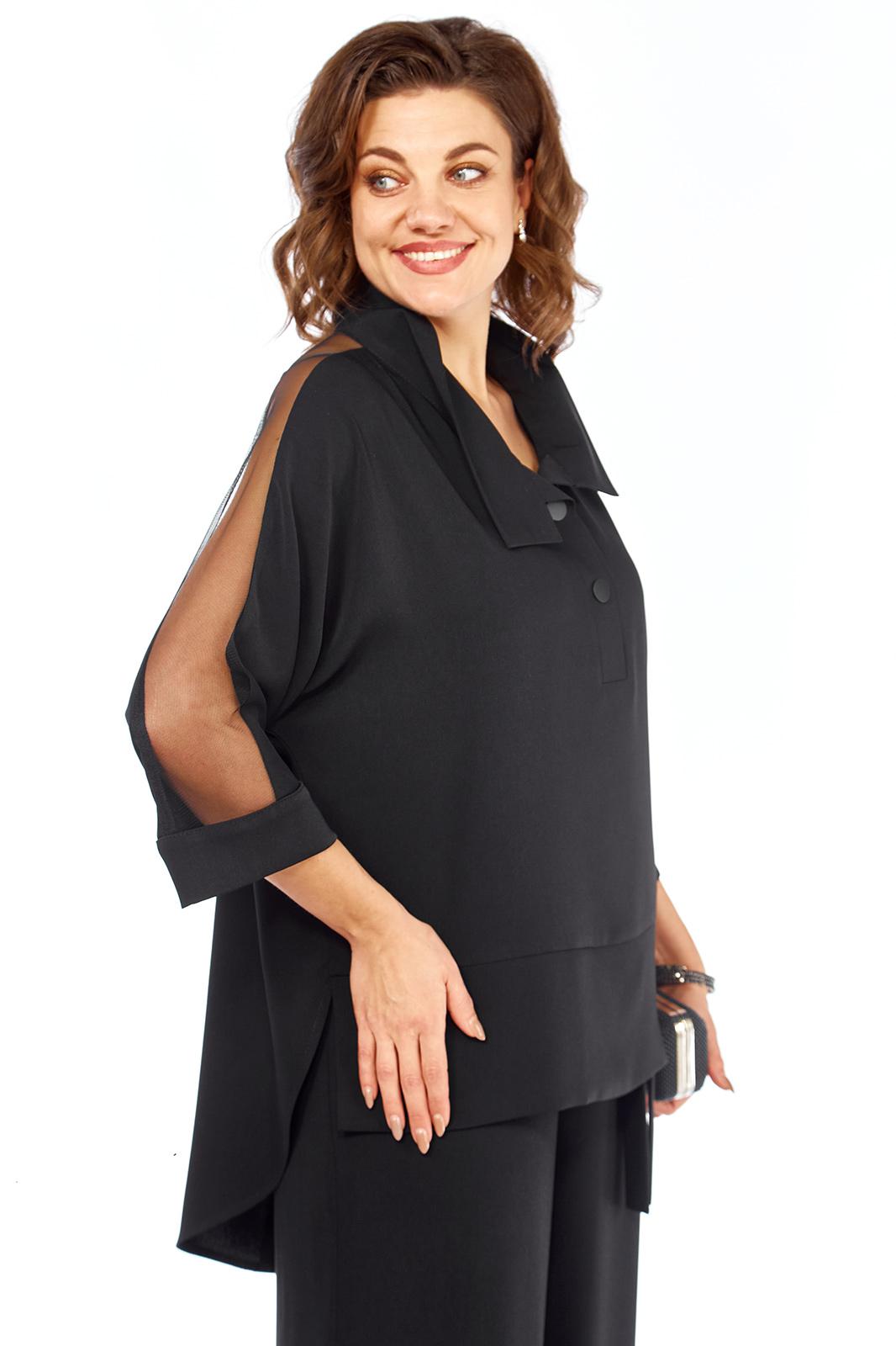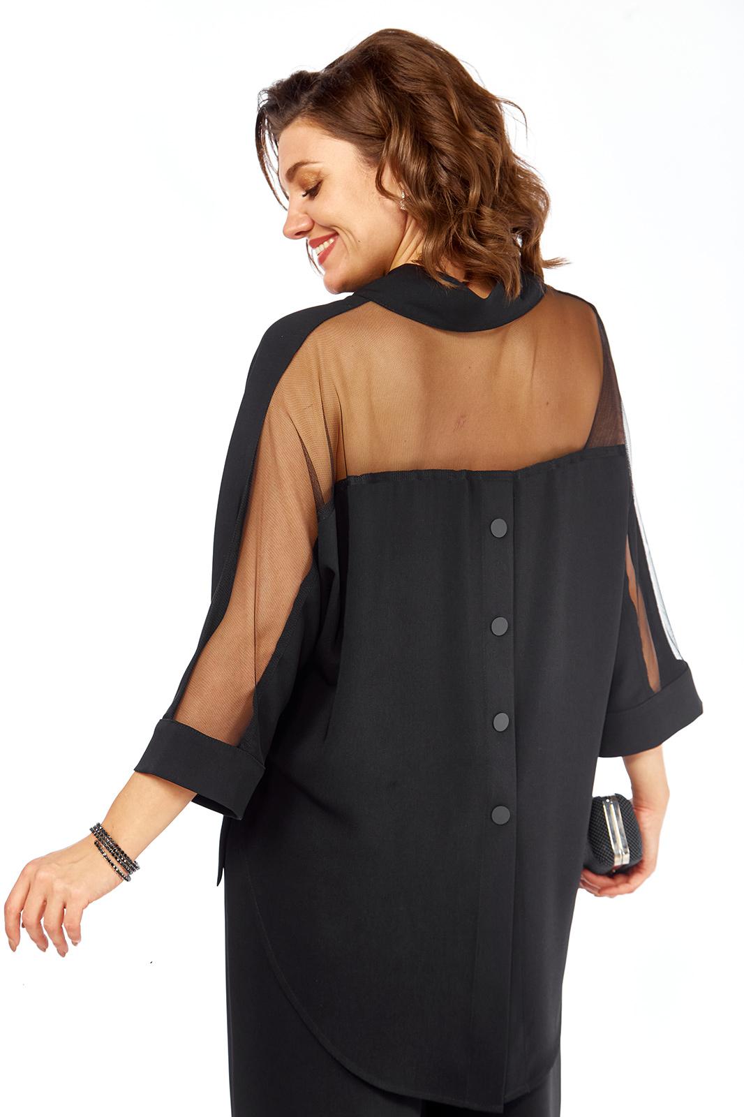Блуза прямого силуэта, оверсайз, с цельнокроеным рукавом длиной 3/4, заканчивающимся притачной манжетой, выполнена из двух видов ткани. Перед с притачной горизонтальной планкой по низу, разрезами в боковых швах и втачной планкой по горловине, застёгивающейся на 2 кнопки. Воротник - стойка. Спинка удлиненная,с отрезной кокеткой из сетки, нижняя часть спинки с центральной застёжкой на 4 кнопки.Низ спинки фигурный.