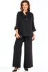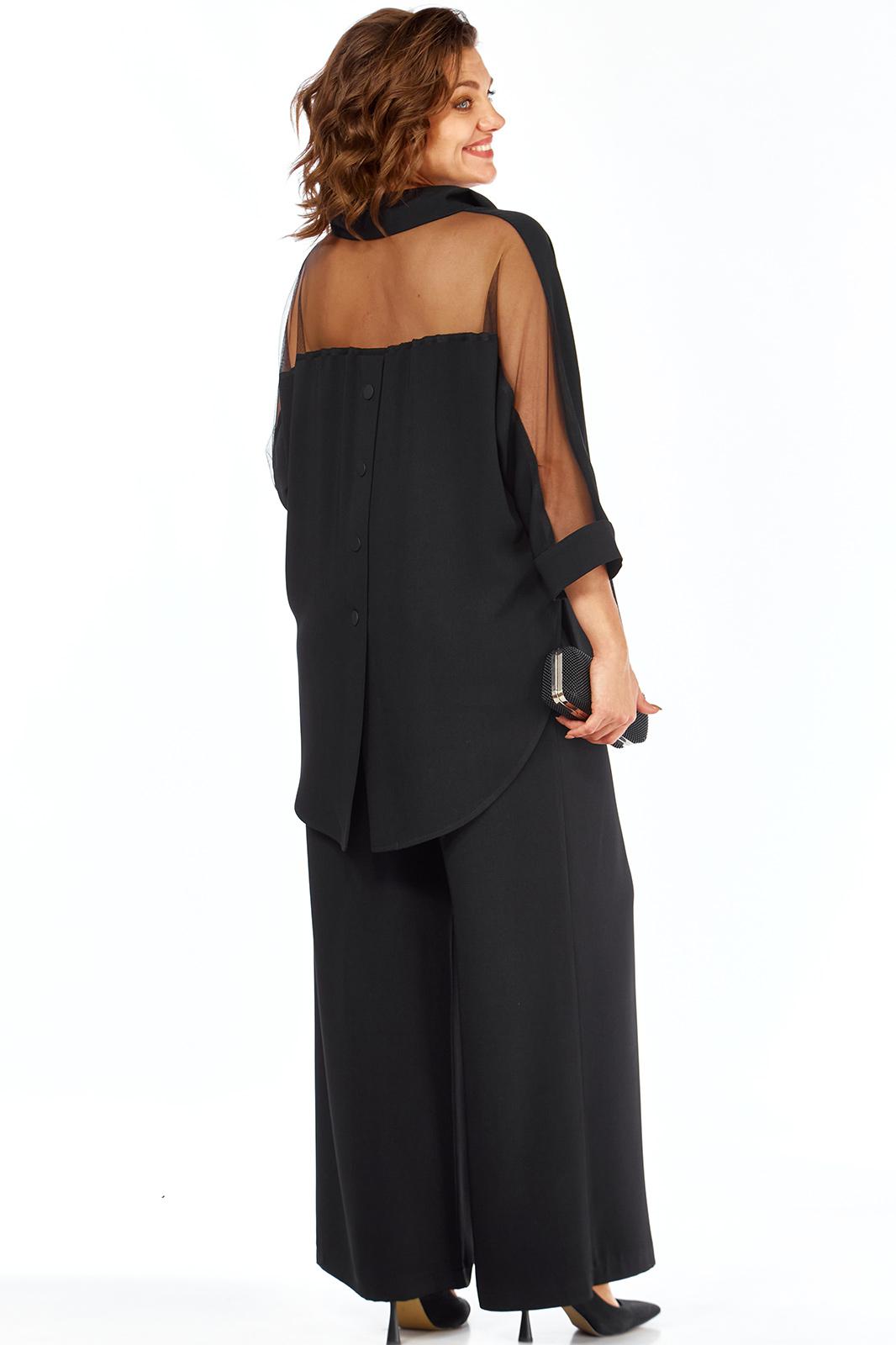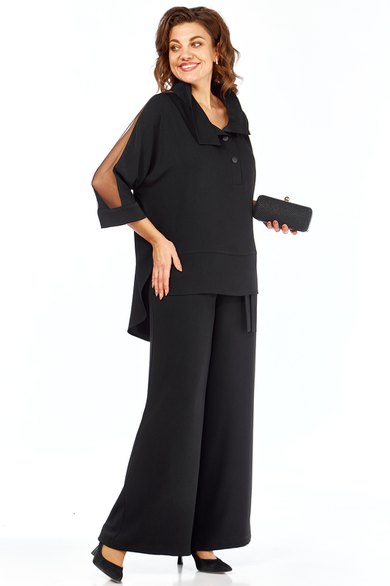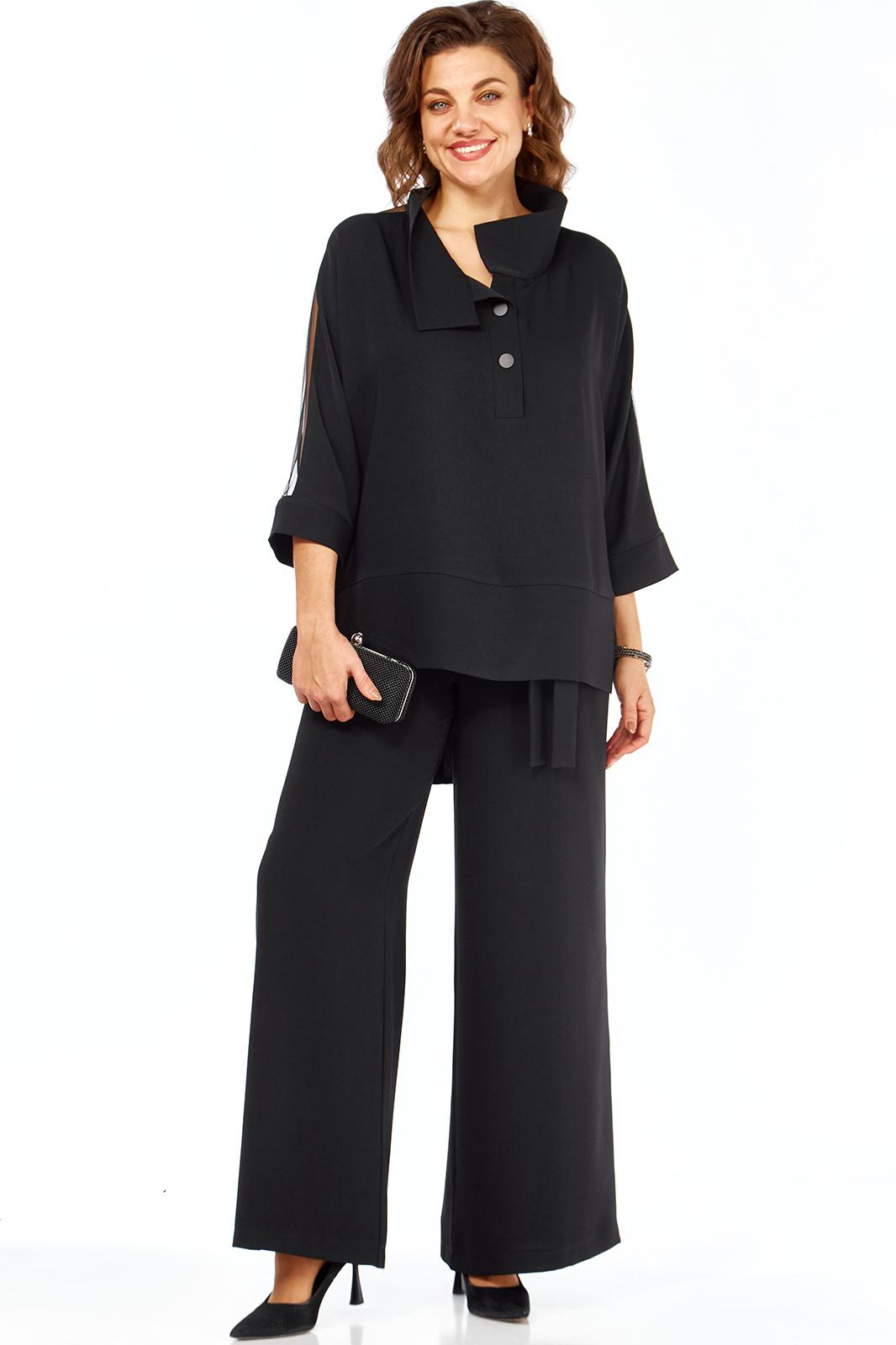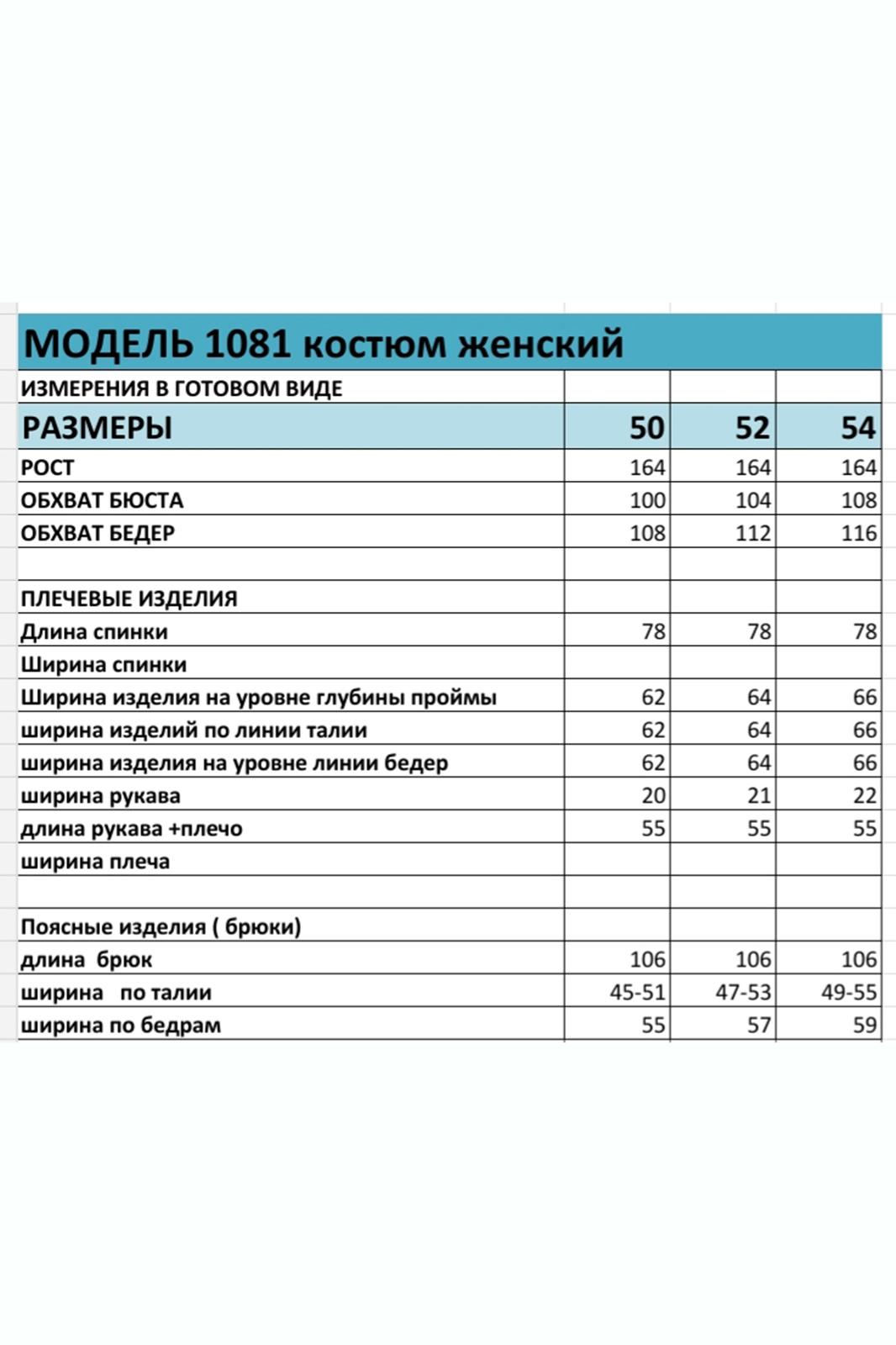 Женский двухпредметный костюм состоит из свободной блузы и широких брюк,выполнен из однотонной плательно-костюмной ткани.