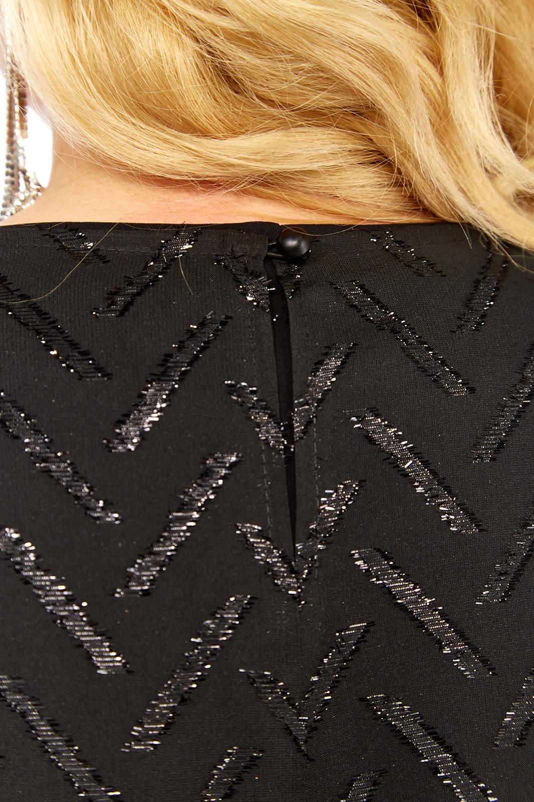 Блуза силуэта трапеция с втачными одношовными рукавами длиной 3/4,выполнена из гладкого шифона с золотым принтом.Спинка удлиненная к центру, со средним швом и застёжкой на навесную петлю и пуговицу.Обтачка горловины переда,планки по низу блузы и рукавов, выполнены из отделочного шифона с золотым принтом питон.