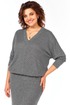 Джемпер свободного силуэта,со спущенной линией плеча и длинным рукавом.Перед со средним швом и V-образным вырезом горловины,обработаным планками внахлёст, внизу декоративное металлическое украшение . Низ джемпера на двойном притачном поясе с резинкой по кругу.