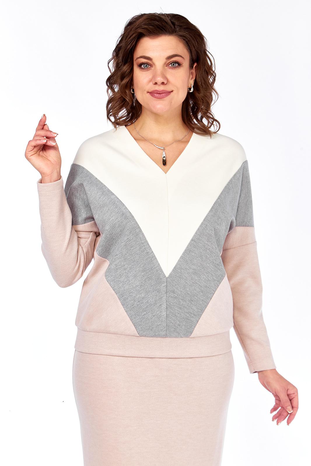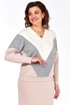 Джемпер силуэта летучая мышь . Перед со средним швом и косыми подрезами от него, выполнен из 3 цветов,образуя геометрический рисунок. Вырез горловины V-образный. Спинка цельная. Рукава одношовные длинные. Низ джемпера на двойном притачном поясе.