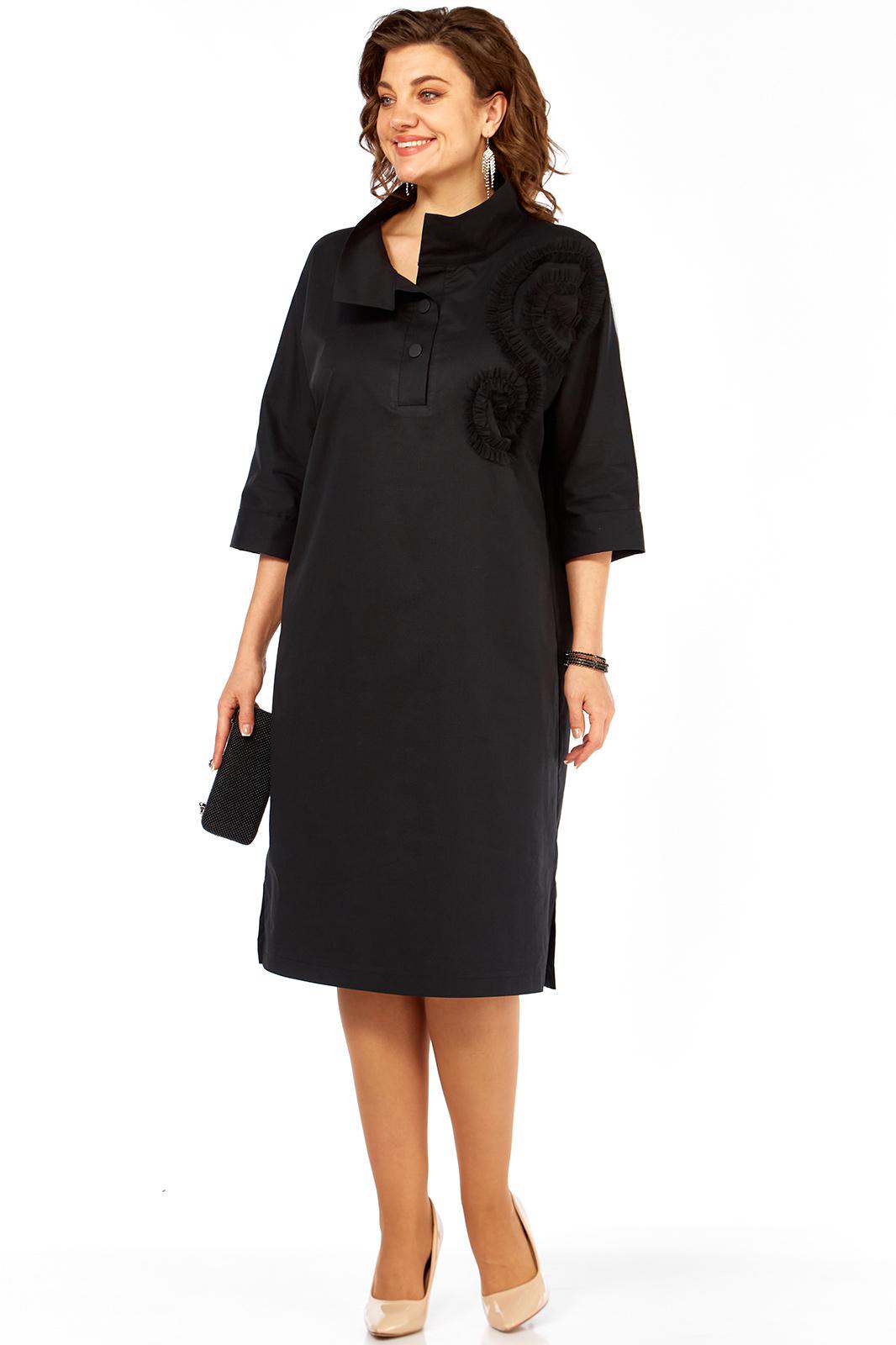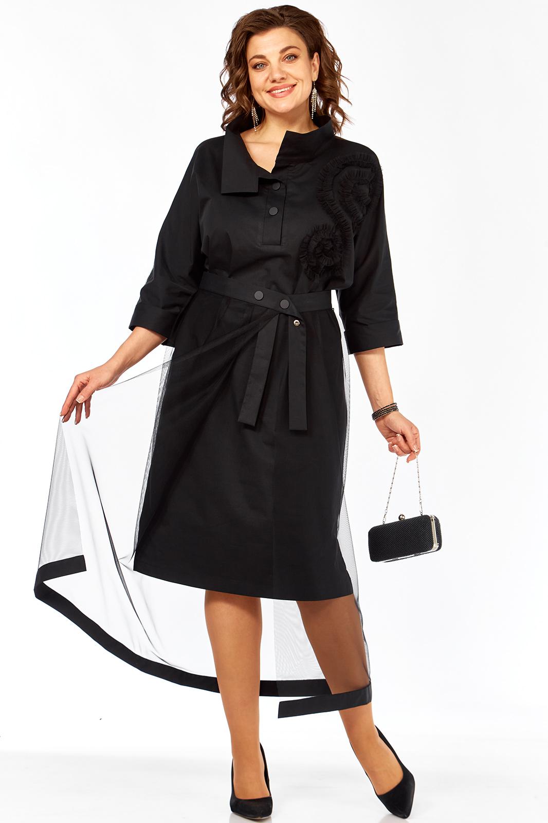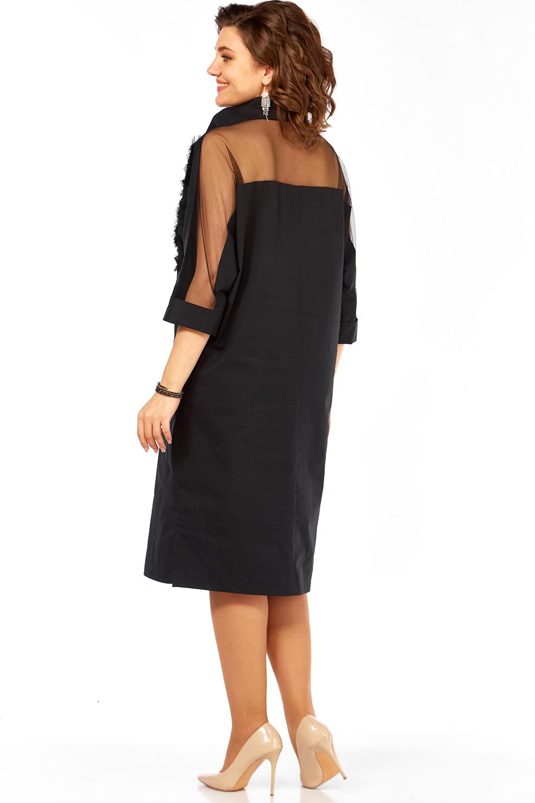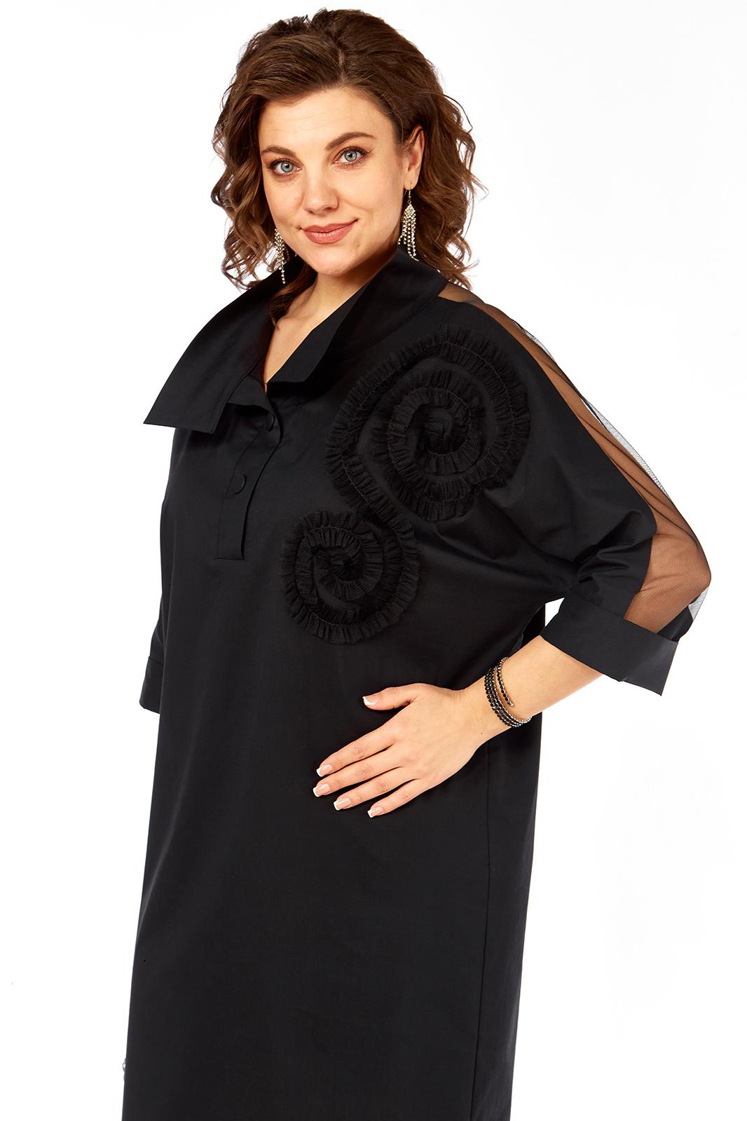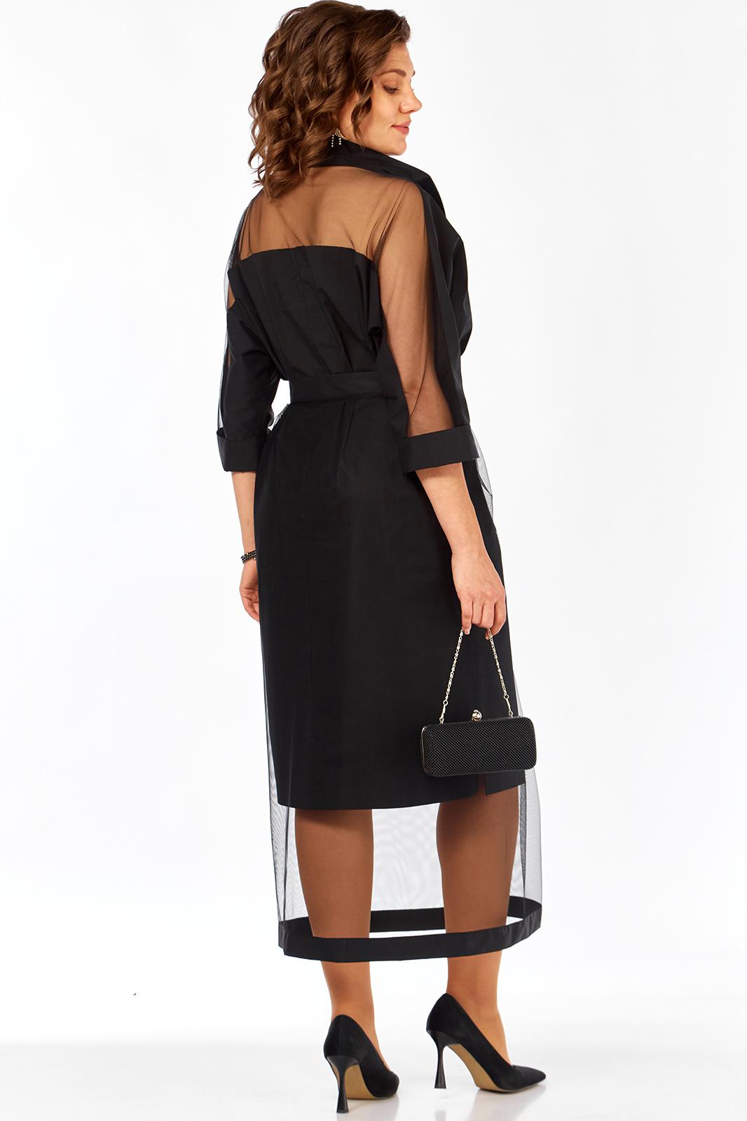 Платье прямого силуэта , оверсайз, с цельнокроеным рукавом длиной 3/4, заканчивающимся притачной отложной манжетой, выполнено из двух видов ткани. Перед с втачными планками по горловине и центральной застёжкой на 2 кнопки, и декоративным элементом из сетки. Воротник - стойка. Спинка с отрезной кокеткой из сетки и средним швом. В боковых швах разрезы.