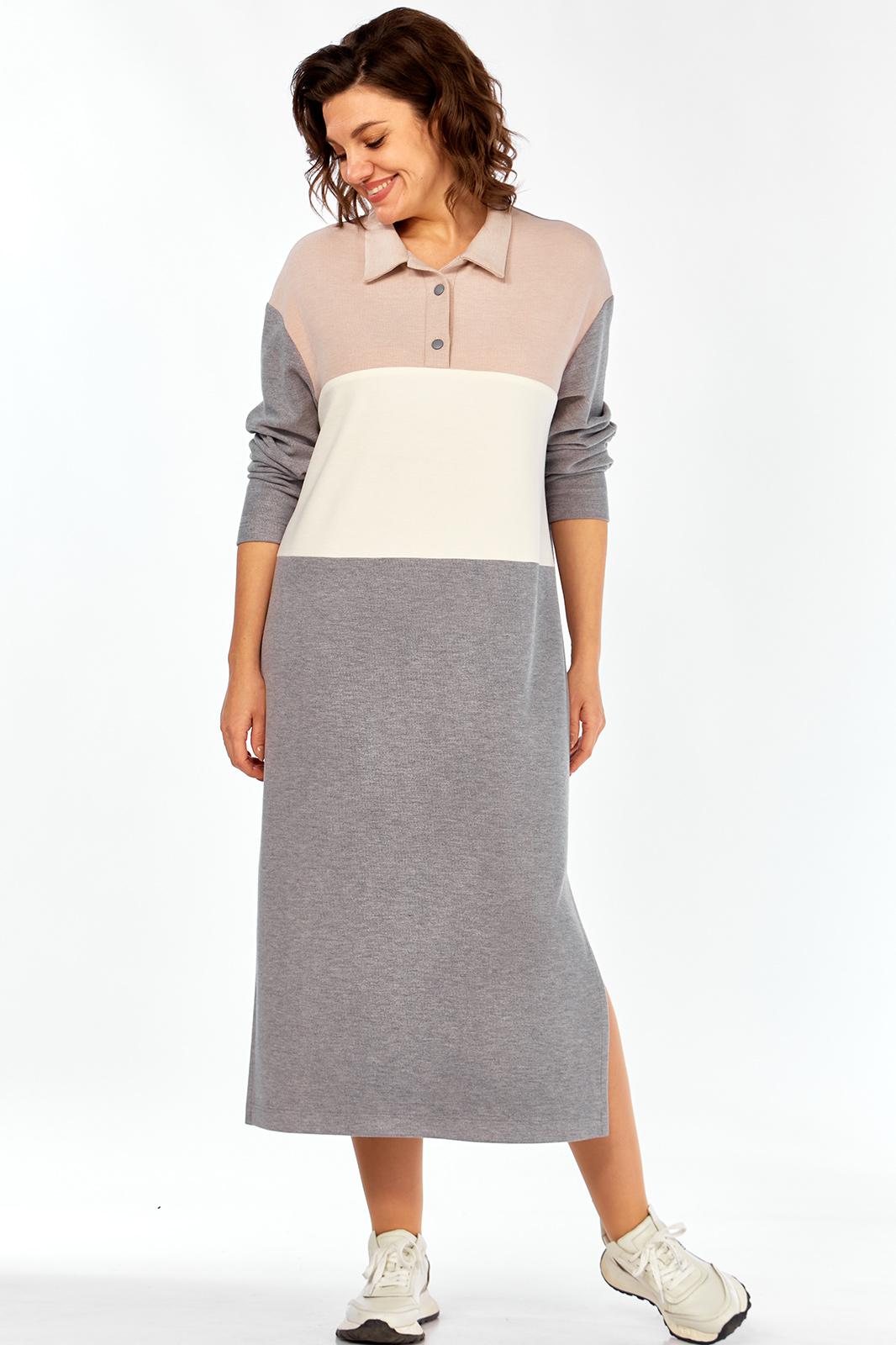 Женское длинное платье в спортивном стиле выполнено из трикотажного полотна вельвет в мелкий рубчик трёх цветов. Платье с центральной застёжкой поло на 2 петли и 2 пуговицы и отложным воротником. Перед состоит из трёх частей разного цвета:отрезной кокеткой и горизонтальным подрезом ниже линии талии . Спинка цельная.Боковые швы заканчиваются разрезами.Плечи слегка спущены.Рукава длинные одношовные.