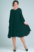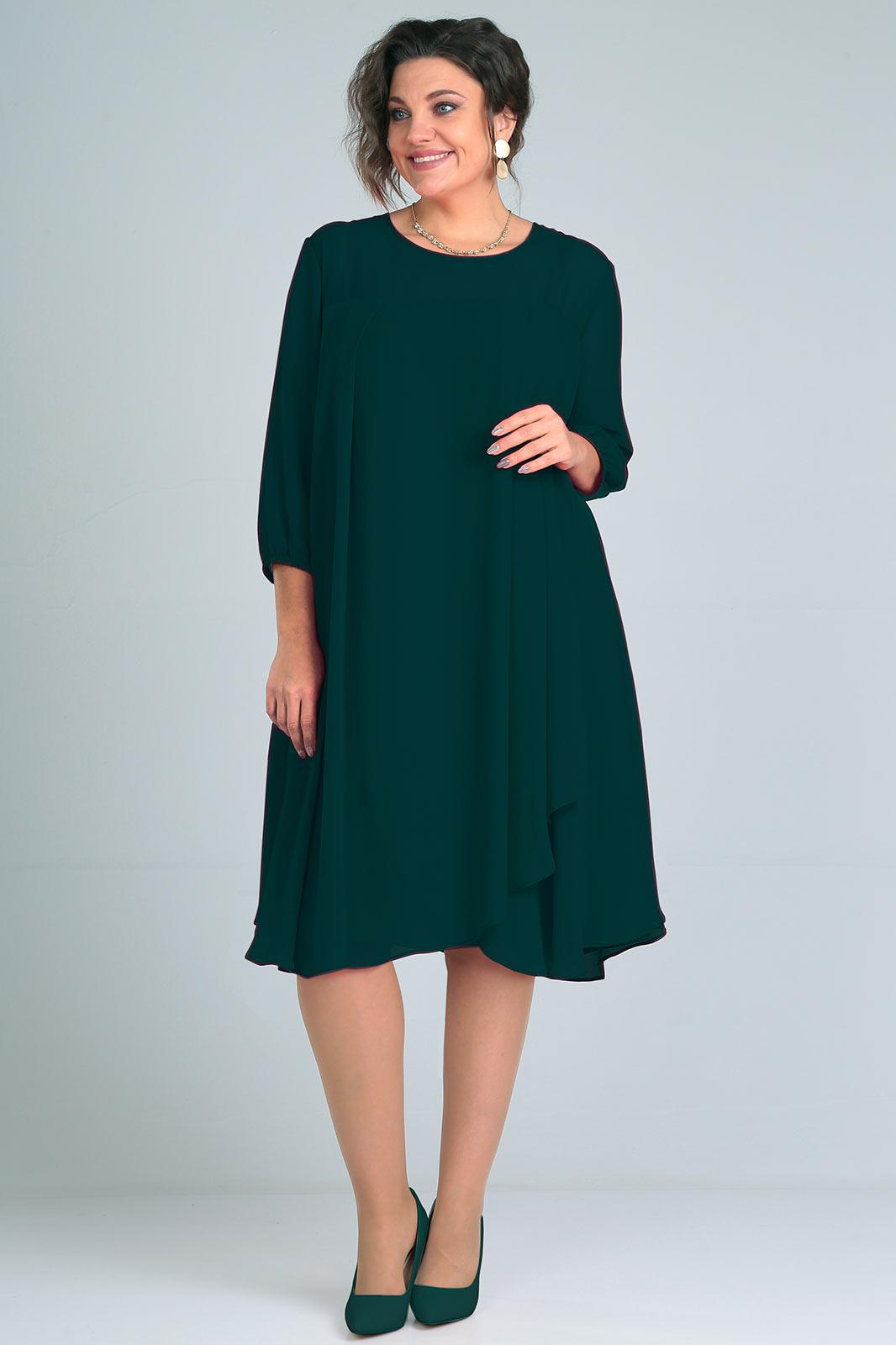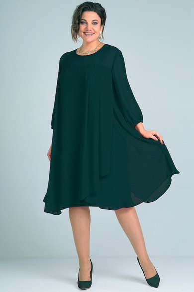 Платье женское свободного силуэта расширенное к низу выполнено из шифона. Перед и спинка с отрезной кокеткой ,нижняя часть выполнена из двух деталей внахлёст со складками по верхнему срезу. На спинке капелька и застёжка на навесную петлю и пуговицу. Рукава втачные одношовные длиной 3/4 со сборкой на резинку по низу. Круглый вырез горловины окантован. Платье на атласной подкладке от кокетки.