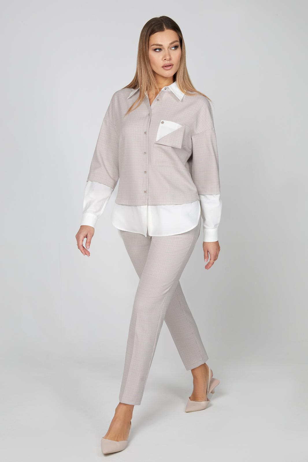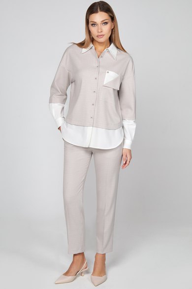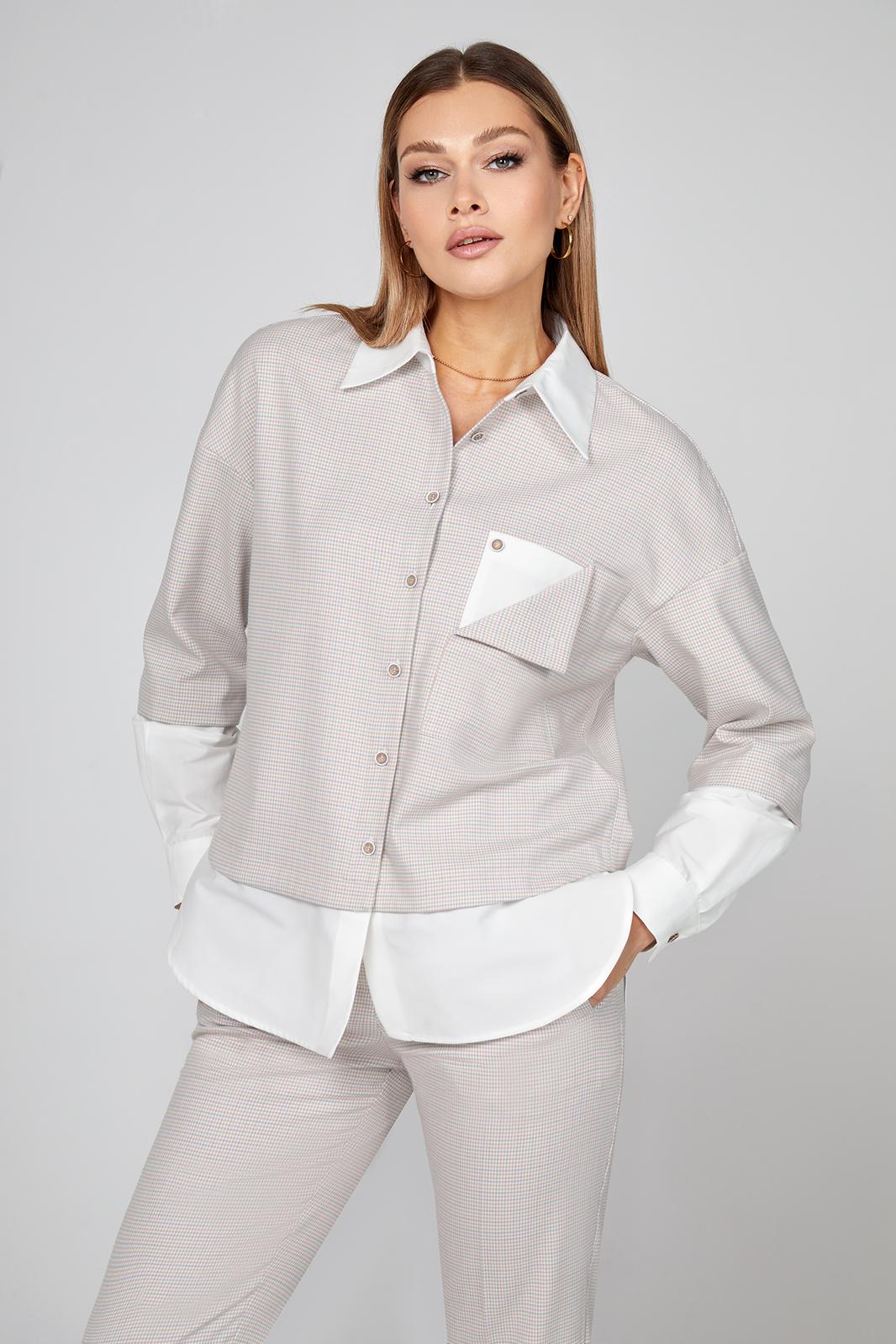 Эта стильная блузка свободного кроя, с оригинальной отделкой из однотонной хлопковой ткани гармонично дополняющей дизайн основной ткани с классическим узором «гусиная лапка»,позволит вам создать актуальный и комфортный образ. Модель с отложным воротником-стойкой, застёжкой на петли и пуговицы, со спущенной линией плеча с притачными рукавами с манжетами и фигурной линией низа разной длины переда и спинки, . Интересный карман по переду становится ключевой фишкой дизайна. В пару к блузке можно подобрать брюки из той же линейки.