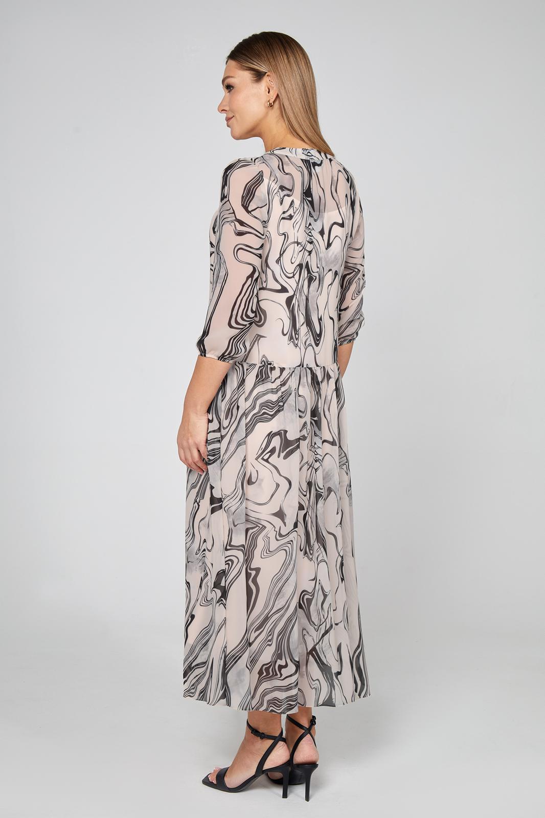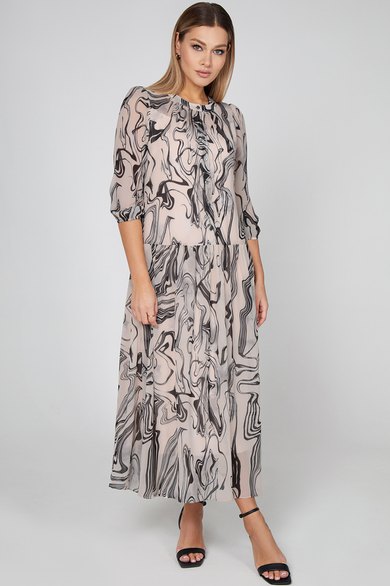 Современное и женственное! Это струящееся свободное платье длины мидакси из польского шифона с щедро расклешенной юбкой обладает очаровательной легкостью. Вместе с интересным абстрактным принтом оно придает особый дух, подчеркивающий Вашу индивидуальность. Модель, с центральной застёжкой на петли и пуговицы, декоративной планкой по горловине со сборкой по переду и укороченными полупрозрачными рукавами, сосбореными по низу эластичной тесьмой и дополненные небольшой сборкой по окату, имеет подкладку из 100% вискозы, благодаря которой Вы будете чувствовать себя комфортно. Идеально подходит для модных образов!
