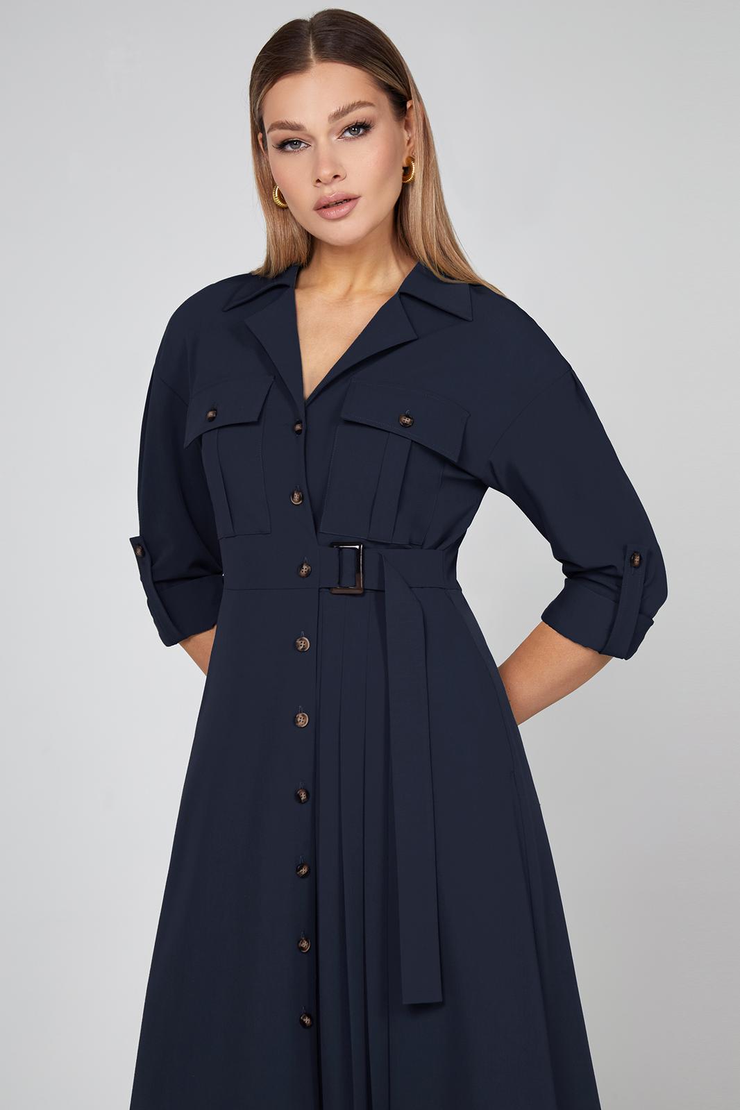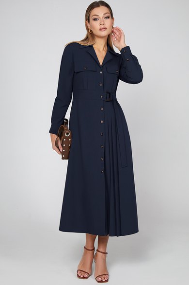 Просто фантастика! Это изысканное платье длиной мидакси с женственным кроем идеально дополняется аккуратным воротником с лацканами и пояском с пряжкой. Дизайн дополняется карманами с клапанами на груди, спущенной линией плеч с притачными рукавами с манжетами, которые при желании можно подвернуть и зафиксировать при помощи пат и пуговиц. Застежка на пуговицы по всей длине придаёт ему яркий штрих, а карманы в боковых швах добавляют функциональности. Вертикальные складки по детали переда завершают шикарный образ. Высококачественная испанская эластичная ткань также гарантирует износостойкость.