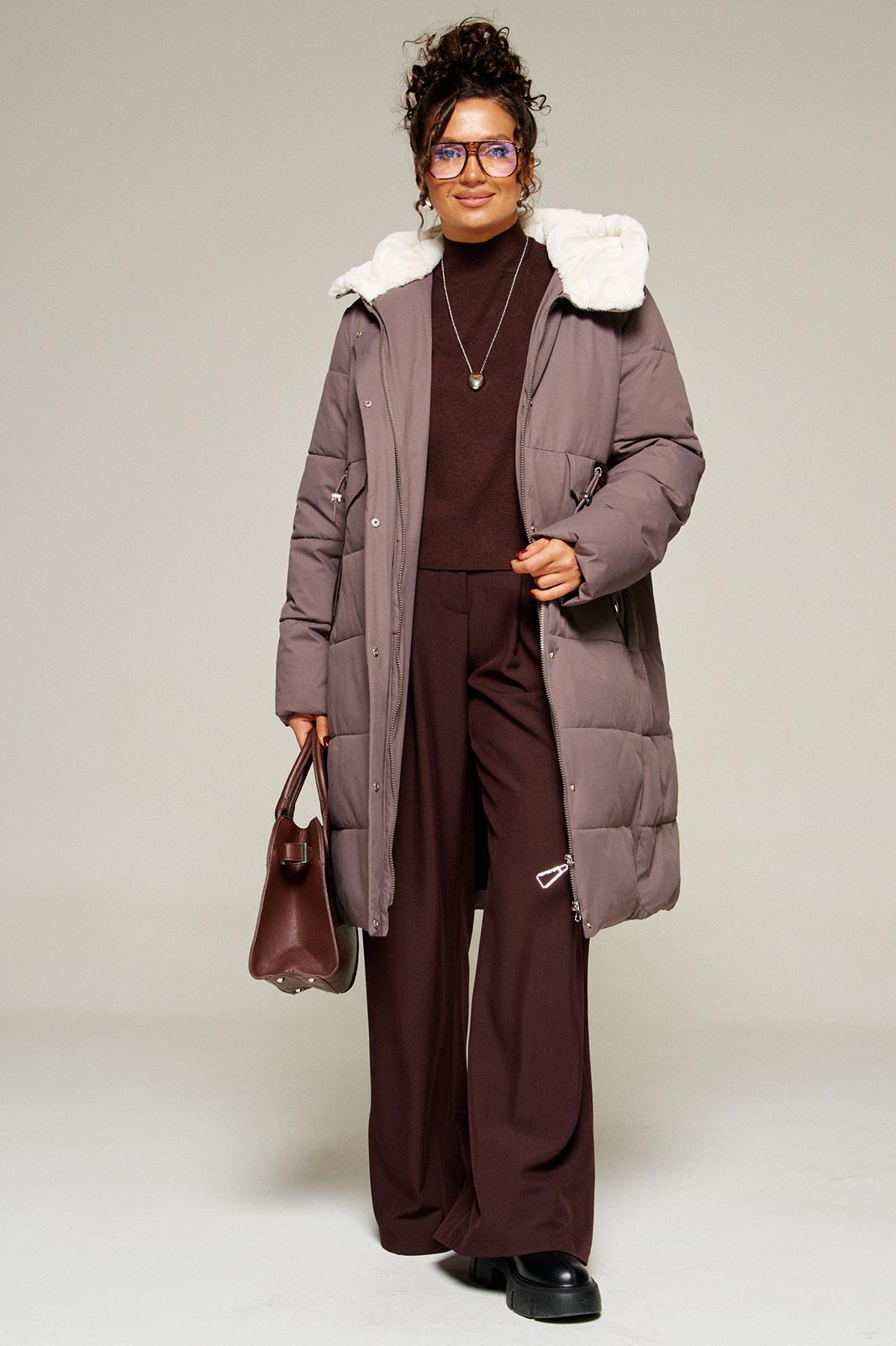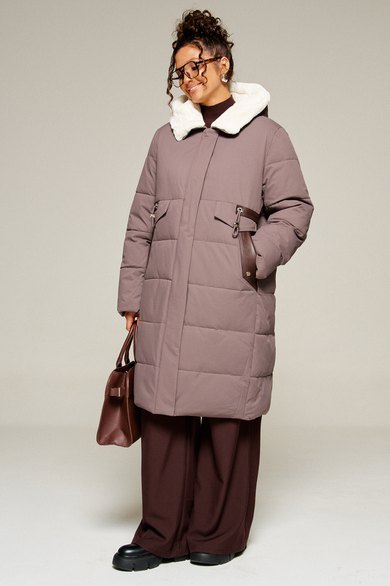 Капюшон с застежкой спереди умеренного объема. Внутренняя часть капюшона выполнена из искусственного меха, который выполняет декоративную и защитную функции, создавая дополнительное тепло и защиту от ветра и холода.