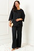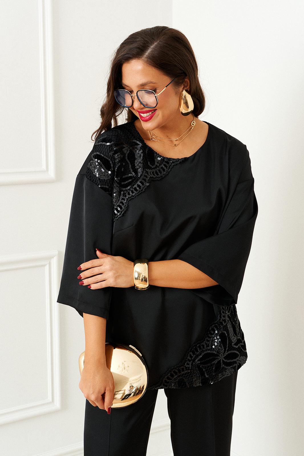 Изысканный костюм состоит из 2-ух предметов: блузки и брюк. Выполнен из атласного полотна в сочетании с кружевом. Основная ткань нежная, гладкой фактуры, приятная на ощупь и с блестящей поверхностью, она легко драпируется и очень выгодно и дорого подчёркивает образ; отделочная ткань придает праздничный шарм.