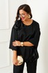 Блузка свободного силуэта, с удлиненной линией плеча, длиной до середины бедра.