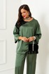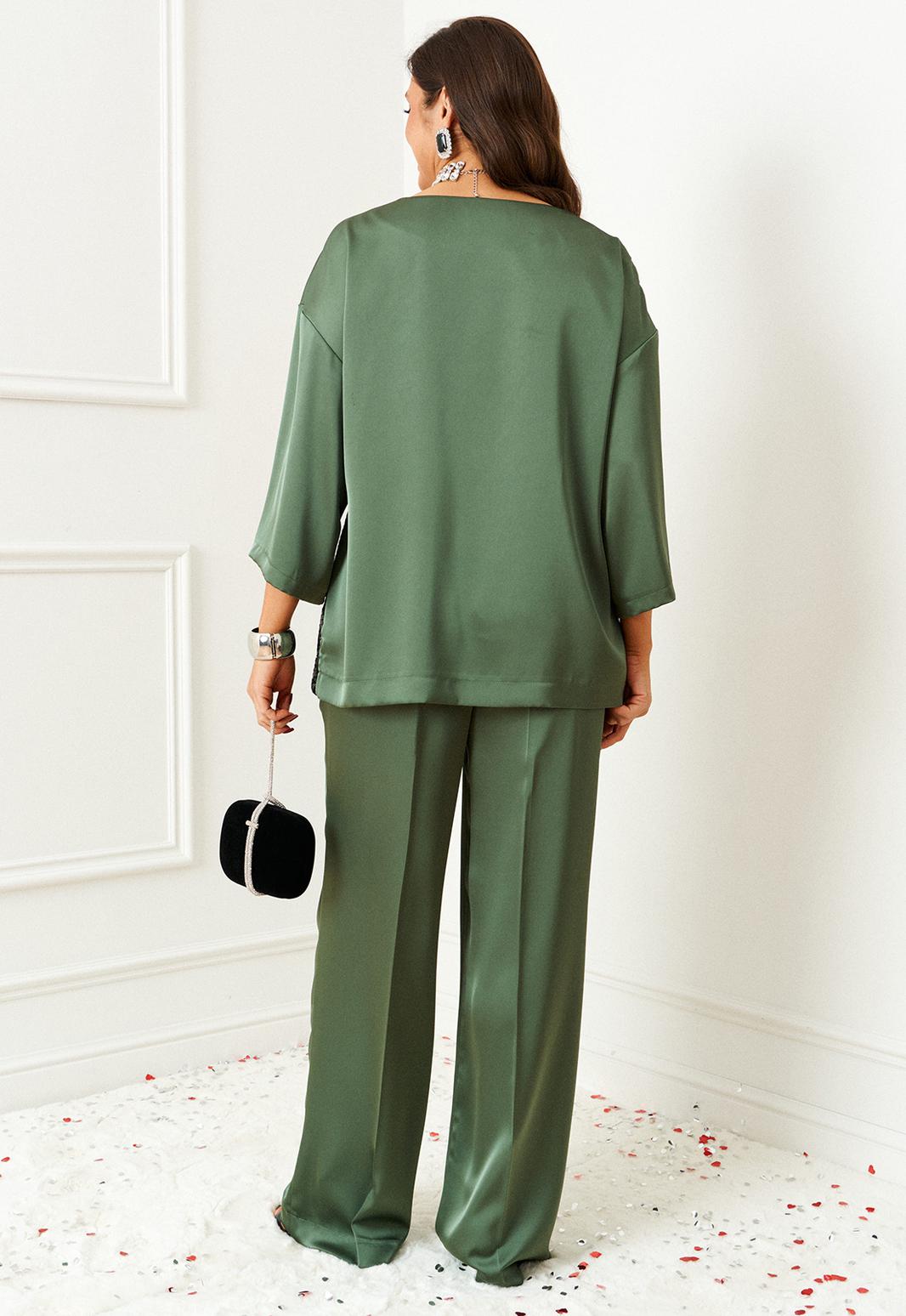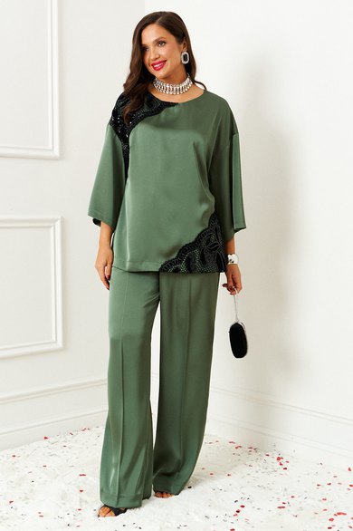Изысканный костюм состоит из 2-ух предметов: блузки и брюк. Выполнен из атласного полотна в сочетании с кружевом. Основная ткань нежная, гладкой фактуры, приятная на ощупь и с блестящей поверхностью, она легко драпируется и очень выгодно и дорого подчёркивает образ; отделочная ткань придает праздничный шарм.