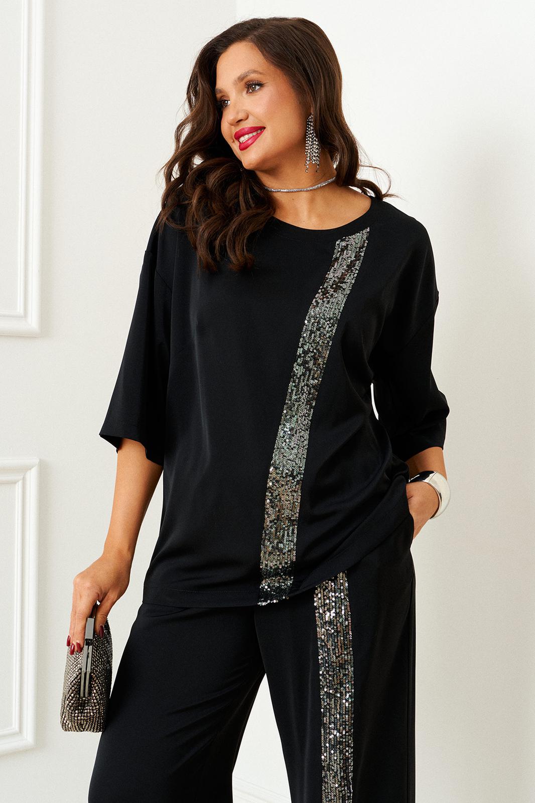 Блузка свободного силуэта, с удлиненной линией плеча, длиной до середины бедра.